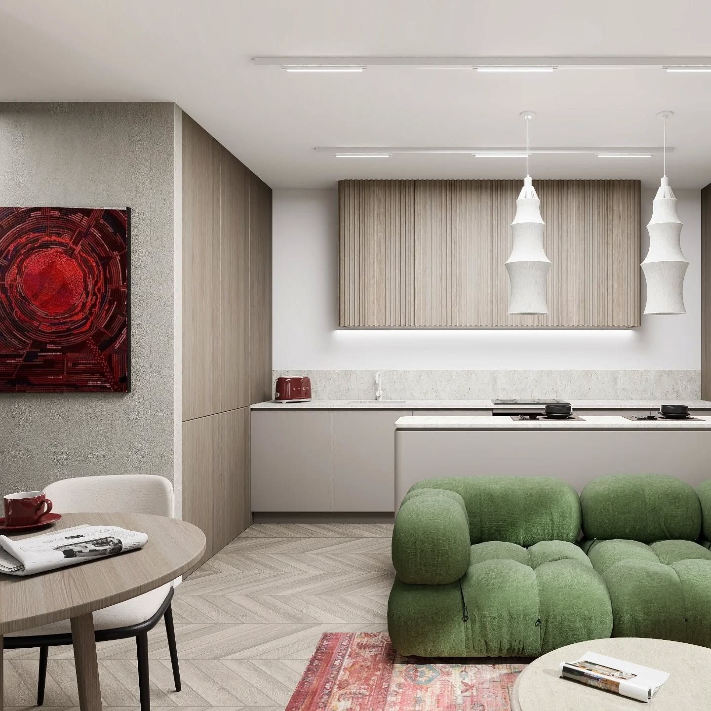 Projekt mieszkania, w którym stonowane jasne beże mebli i ścian, zostały ożywione mocnymi kolorami dodatków.