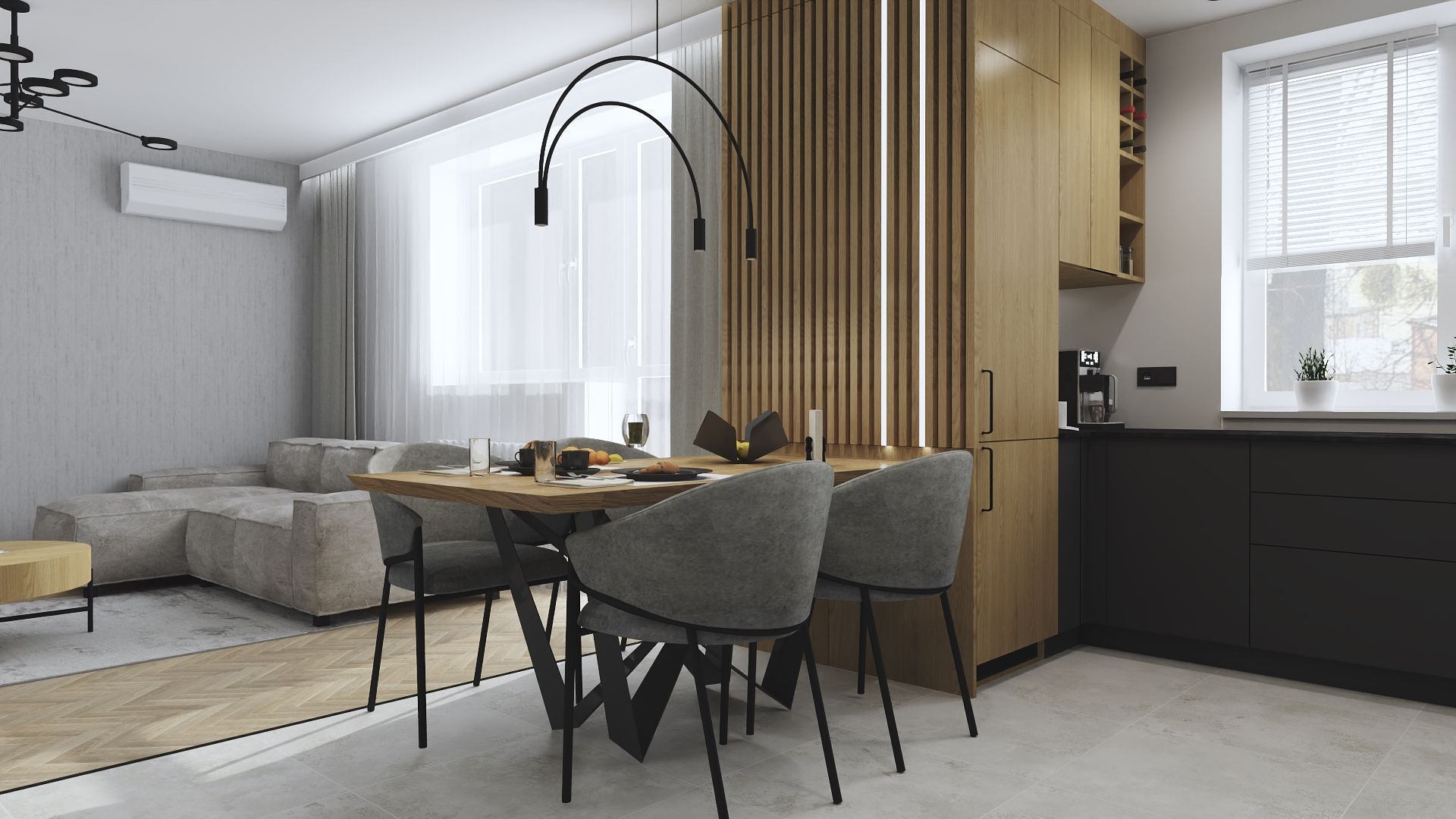 Wnętrze salonu w stylu skandynawskim z szarym narożnikiem i drewnianym stołem 14 zdjęć w projekcie Zobacz projekt