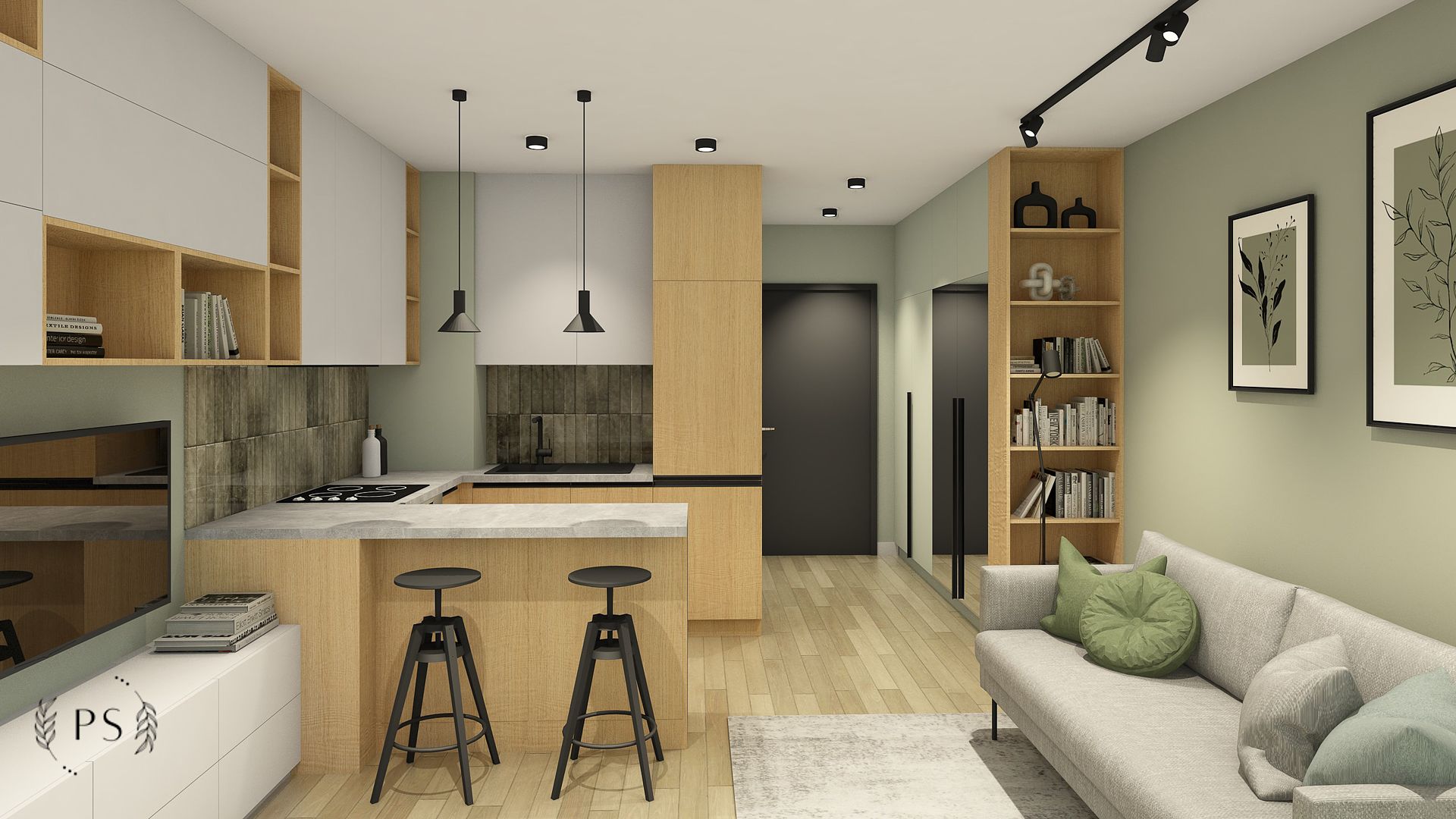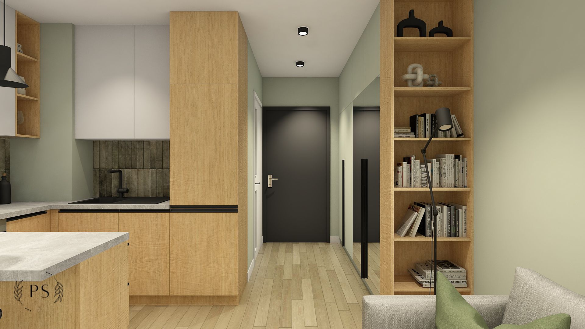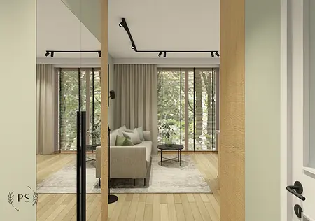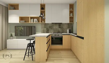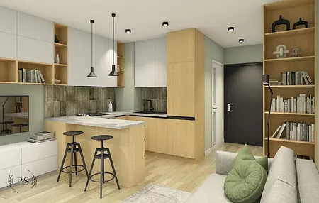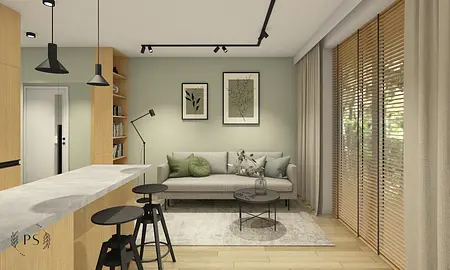 Największe wyzwanie w projektach kawalerek stanowi zapewnienie odpowiedniej przestrzeni na przechowywanie. W przypadku tej kawalerki zaplanowaliśmy pojemne szafy w korytarzu, zabudowę rtv, która płynnie przechodzi w zabudowę kuchenną oraz pojemne szafki w łazience. Minimalistyczny styl oraz dominujące biel i drewno przełamaliśmy akcentami oliwkowej zieleni oraz płytkami cegiełkami o nieregularnej strukturze.