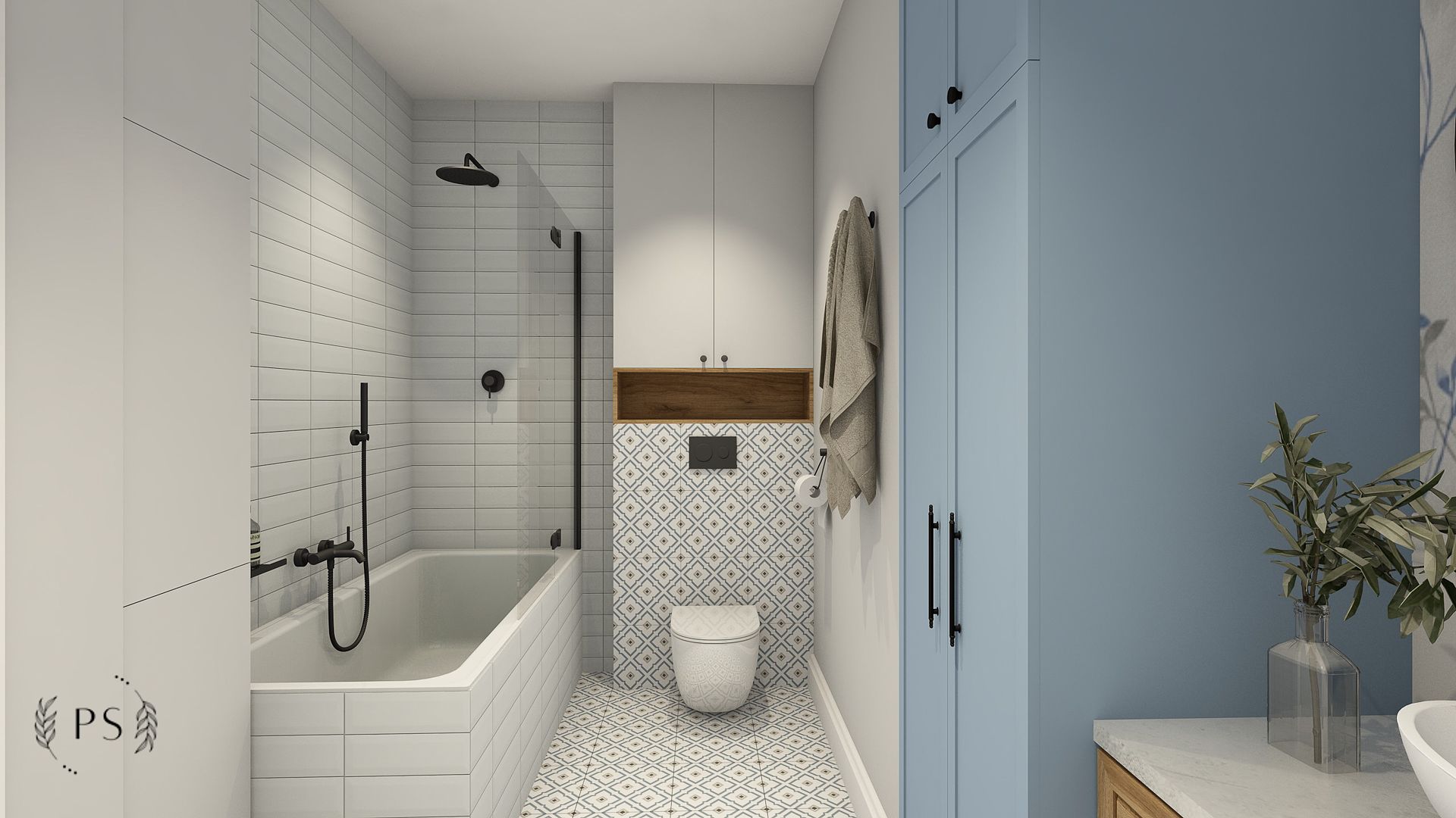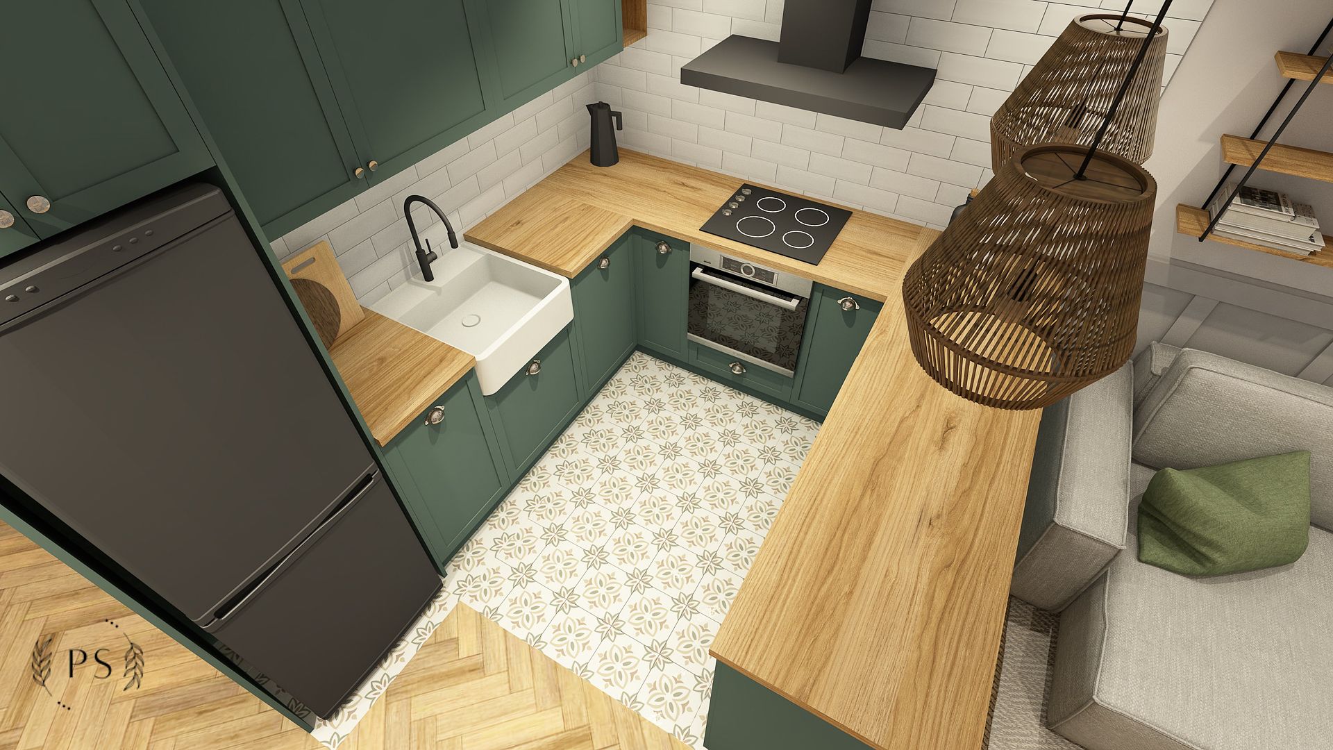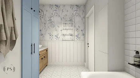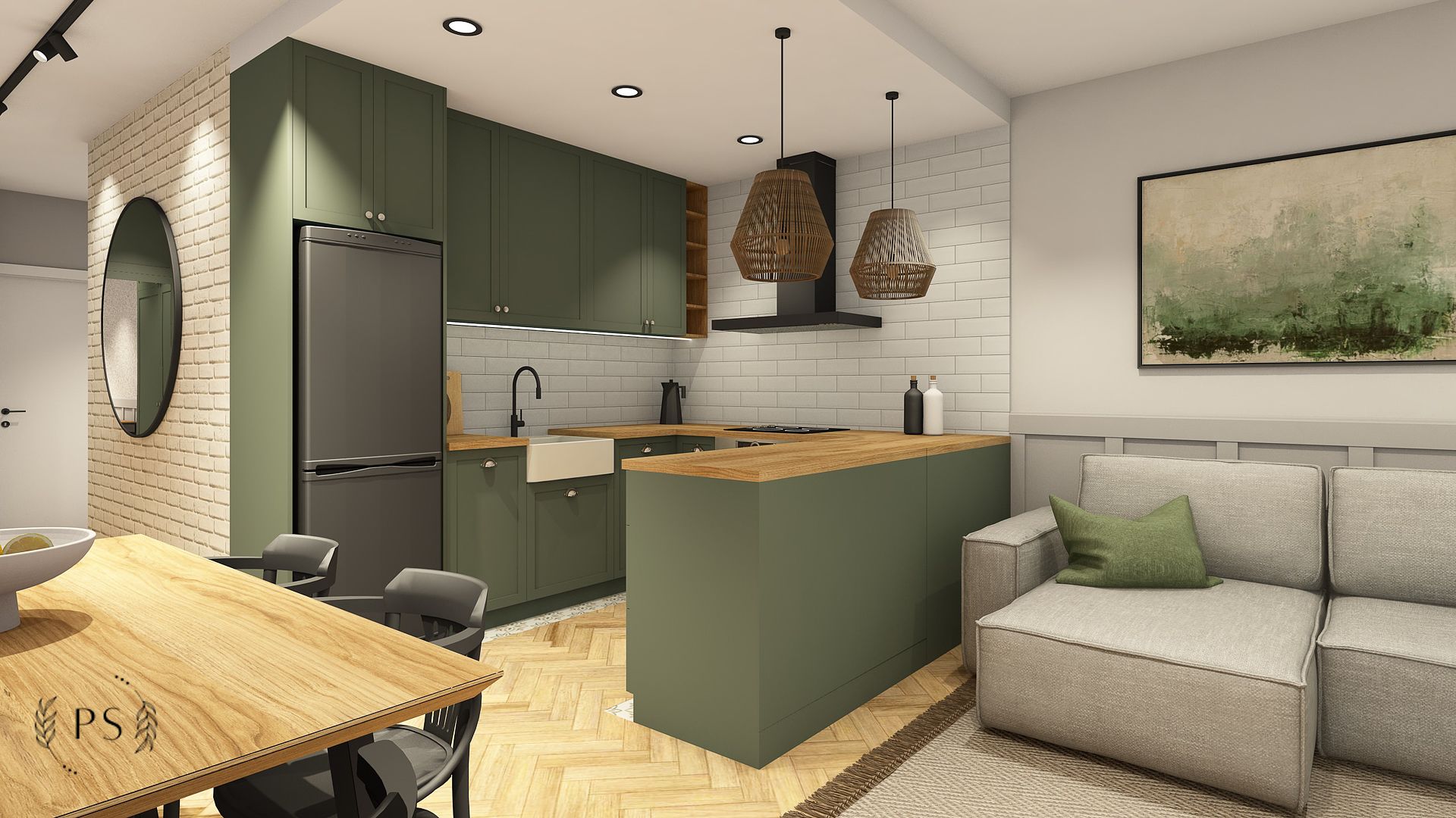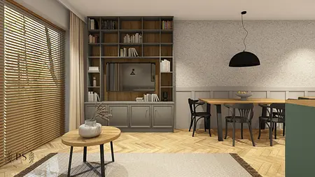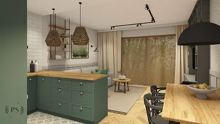 Dwie wizje Klientów – jedną rustykalną, a drugą loftową, musieliśmy połączyć w jedną spójną całość. Dla tych dwóch kierunków charakterystyczna jest cegła, dlatego wprowadziliśmy ją w dwóch odsłonach: prawdziwej cegły w korytarzu oraz płytek cegiełek w kuchni i łazience. Wybór oświetlenia również podyktowany był preferencjami Klientów, dlatego koncepcję stylistyczną uzupełniły lampy boho oraz loftowe kinkiety i oświetlenie szynowe. W efekcie powstał delikatnie farmhouse’owy klimat.