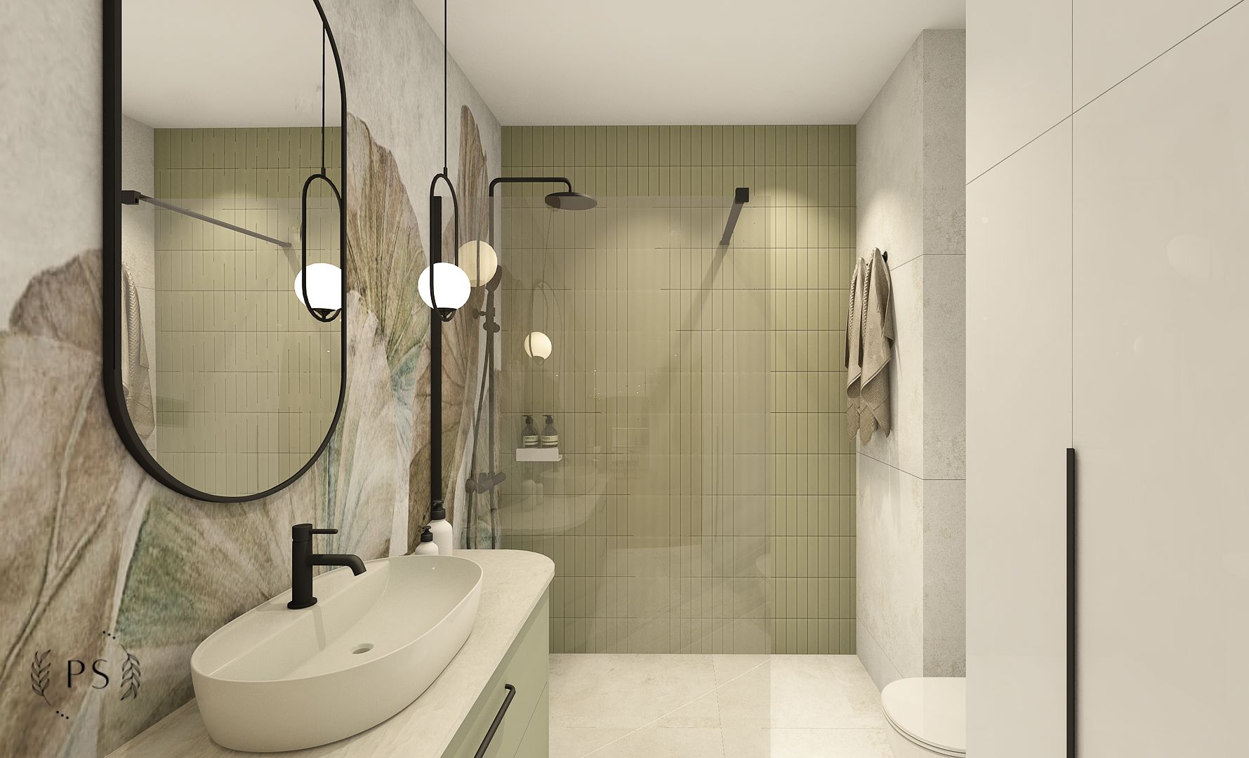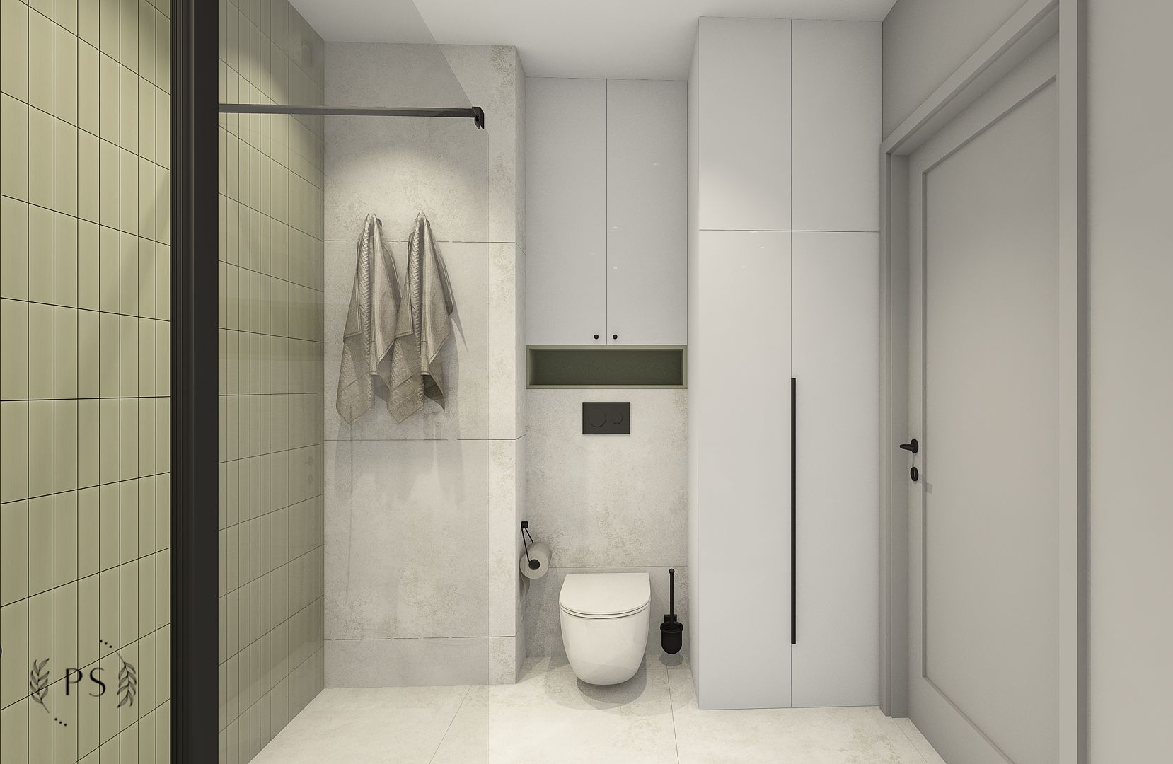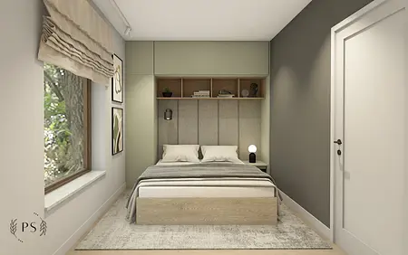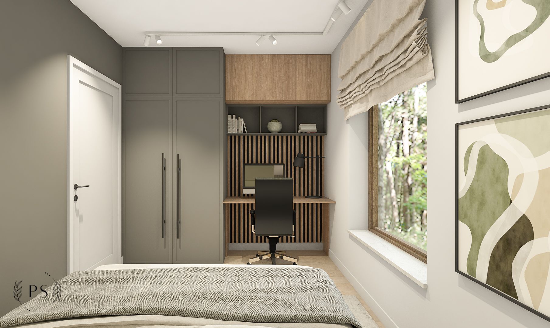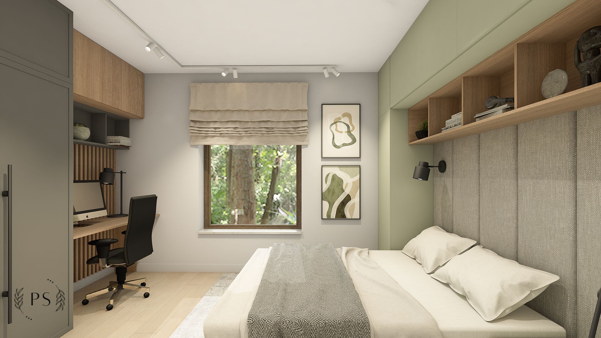 Największe wyzwanie w tym projekcie stanowiło znalezienie kompromisu pomiędzy estetyką a funkcjonalnością. W stosunkowo niewielkiej sypialni, dzięki zabudowie na wymiar, udało nam się wygospodarować wystarczająco dużo miejsca do przechowywania oraz wygodne miejsce do pracy. Dzięki ciekawej kolorystyce – dwa odcienie zieleni, jasna szarość, drewno oraz antracyt dla kontrastu uzyskaliśmy spokojne, a jednocześnie pobudzające do działania wnętrze.