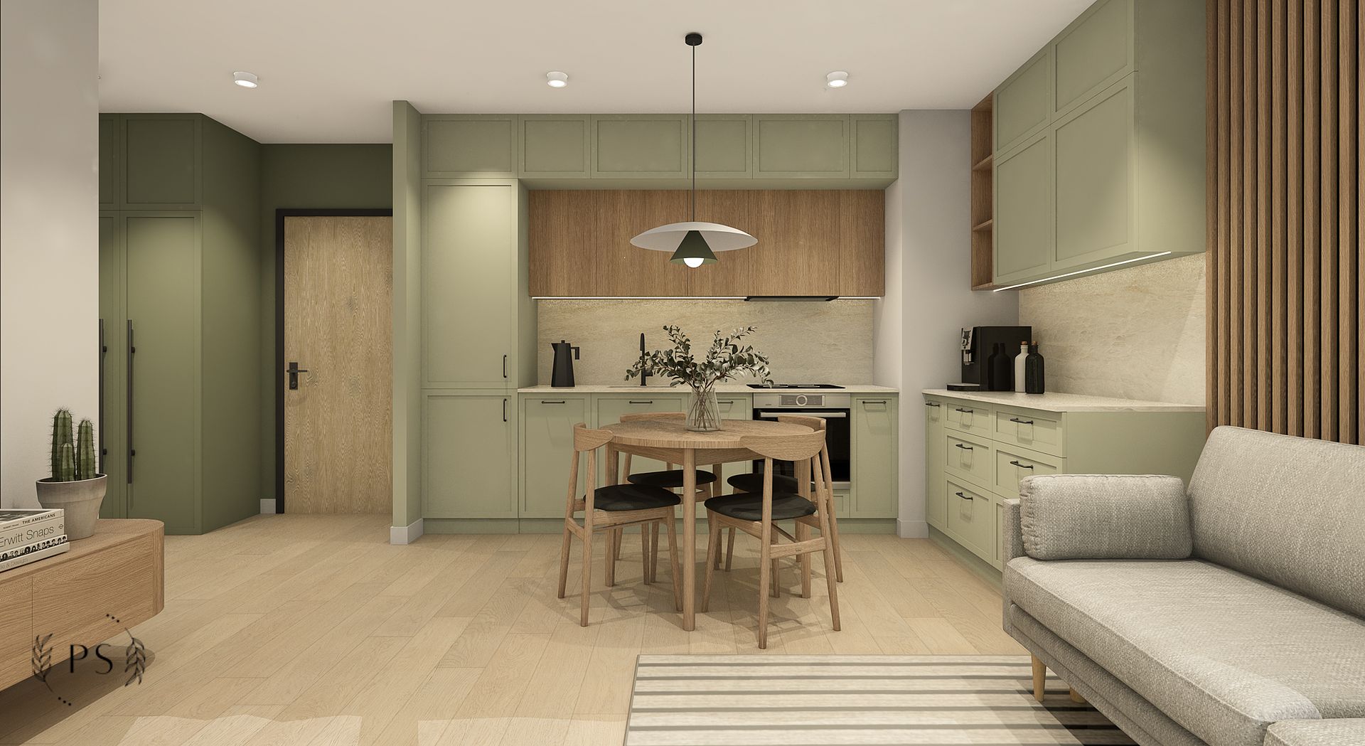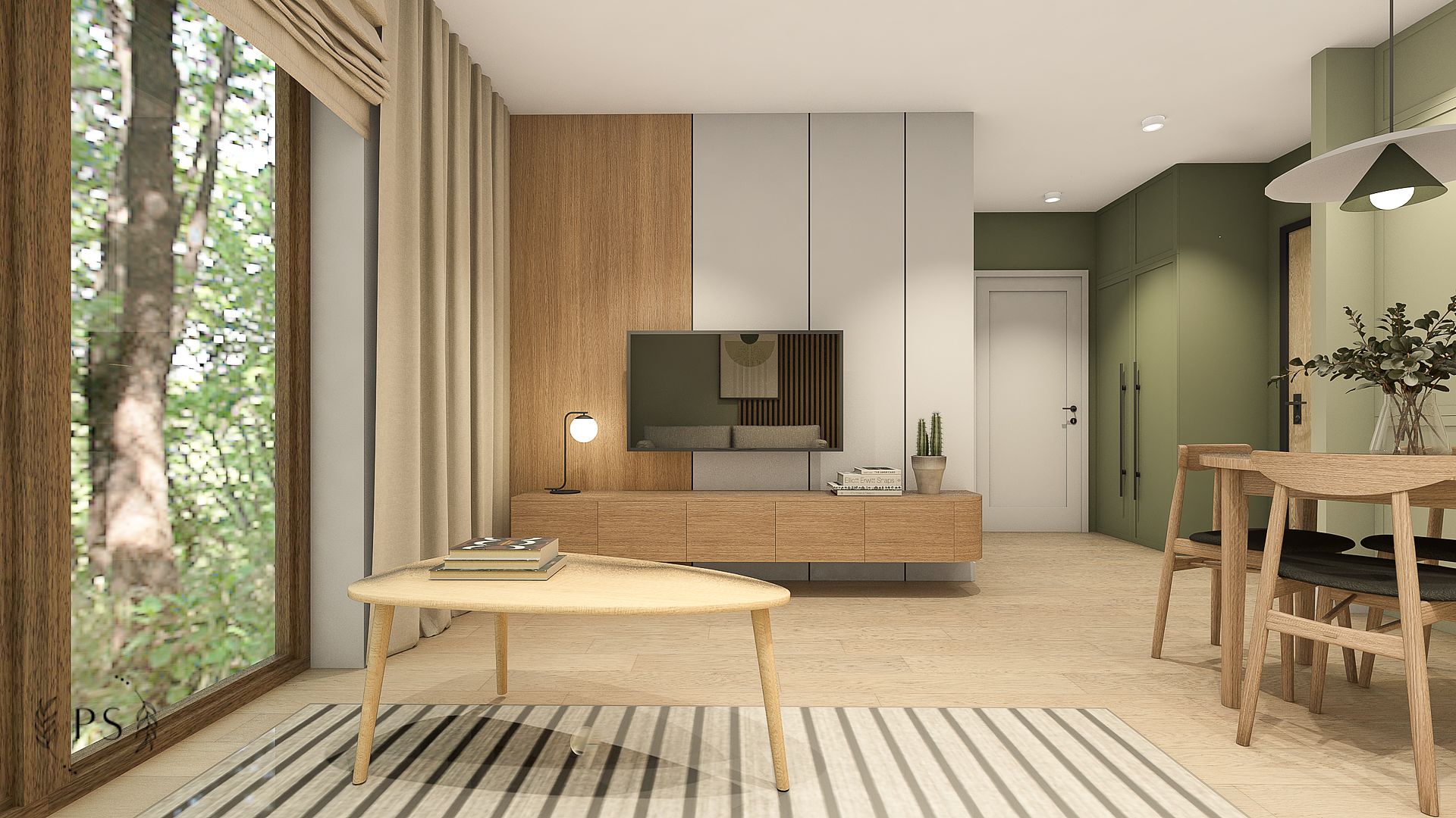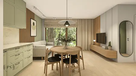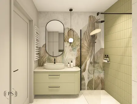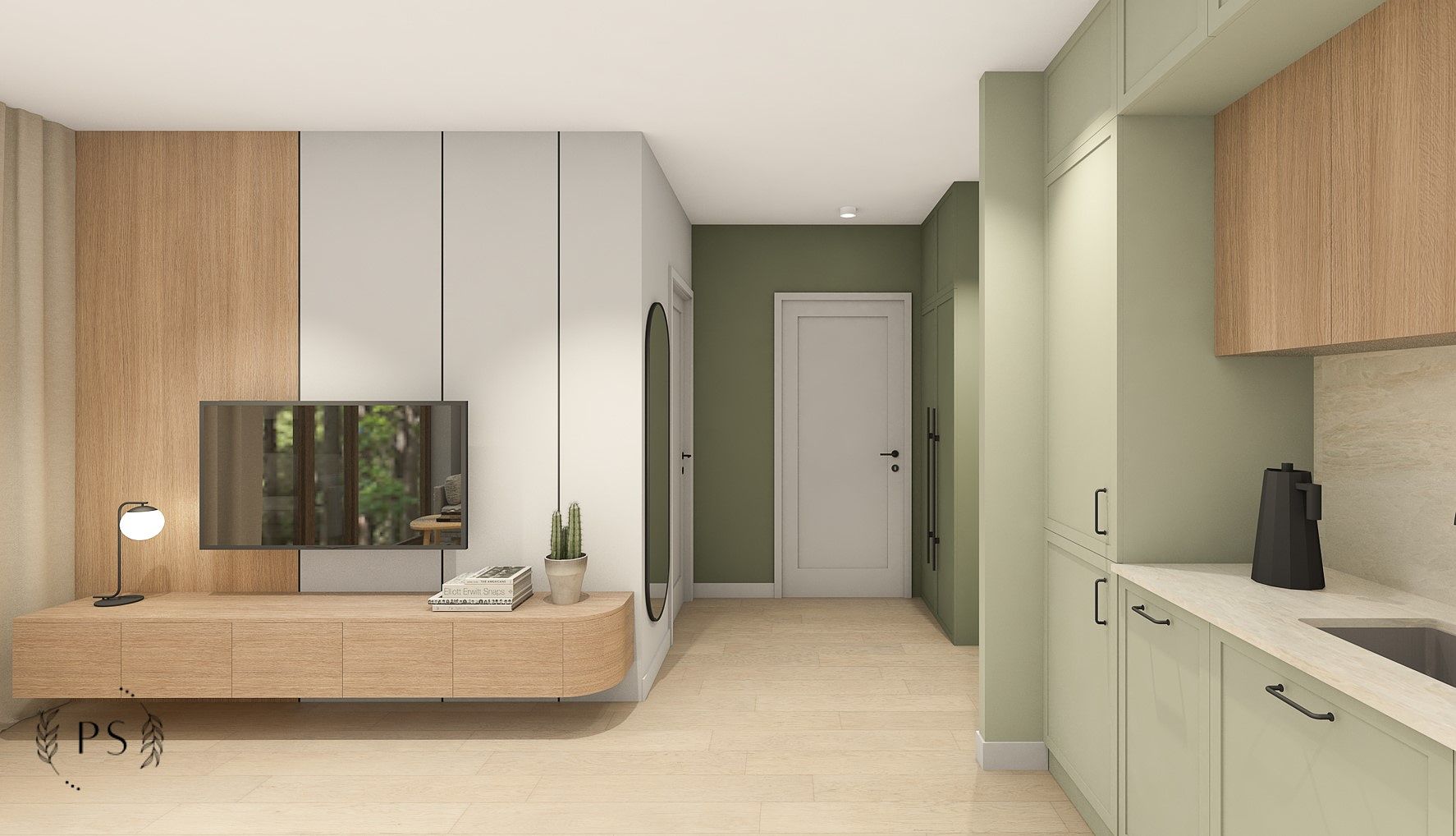 Największe wyzwanie w tym projekcie stanowiło znalezienie kompromisu pomiędzy estetyką a funkcjonalnością. W stosunkowo niewielkiej sypialni, dzięki zabudowie na wymiar, udało nam się wygospodarować wystarczająco dużo miejsca do przechowywania oraz wygodne miejsce do pracy. Dzięki ciekawej kolorystyce – dwa odcienie zieleni, jasna szarość, drewno oraz antracyt dla kontrastu uzyskaliśmy spokojne, a jednocześnie pobudzające do działania wnętrze.