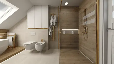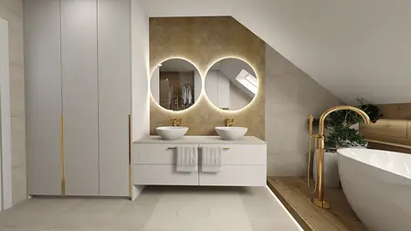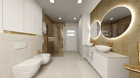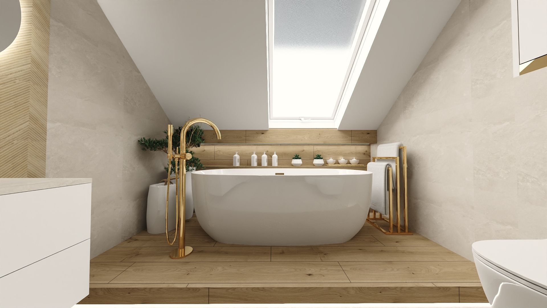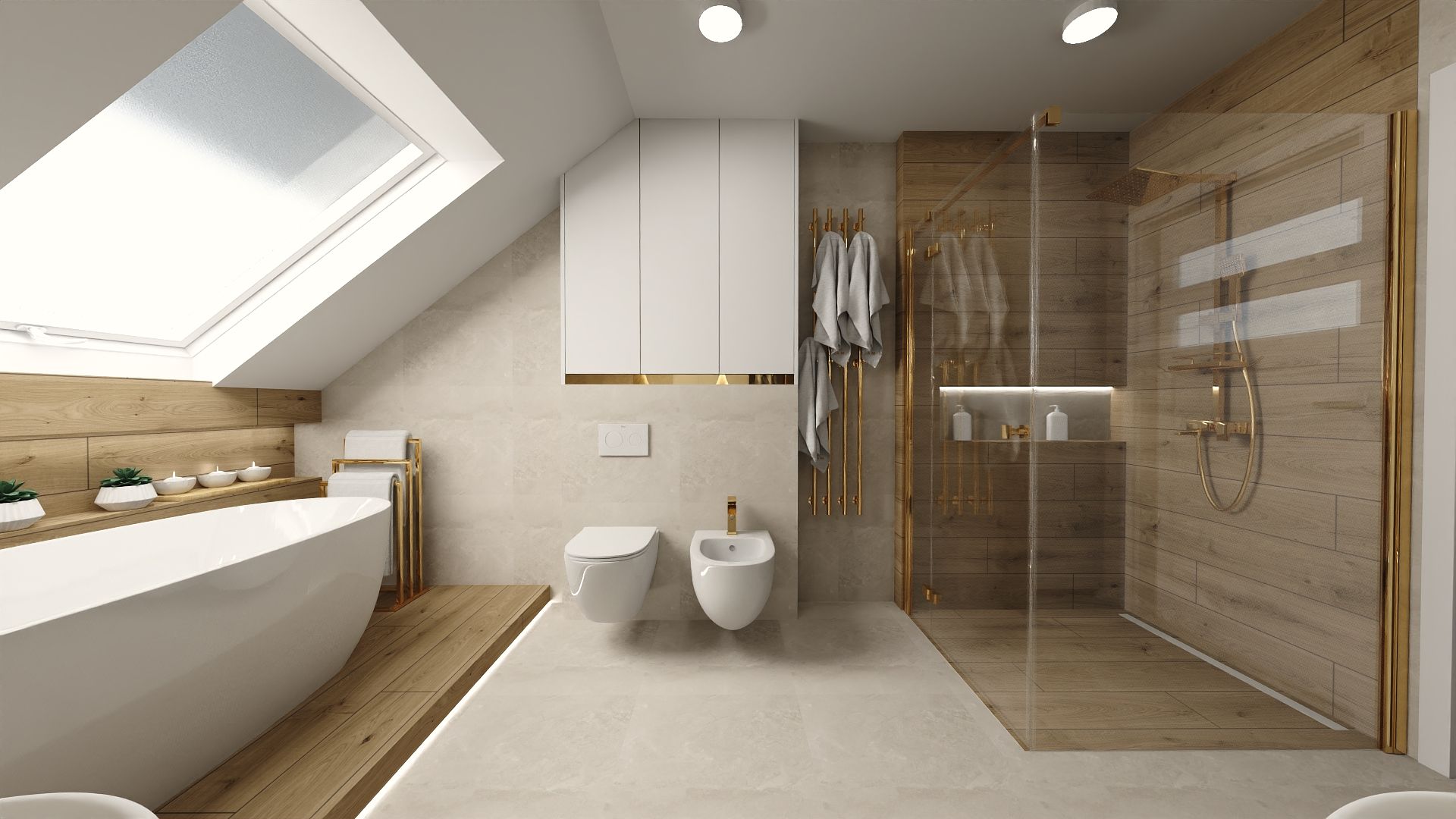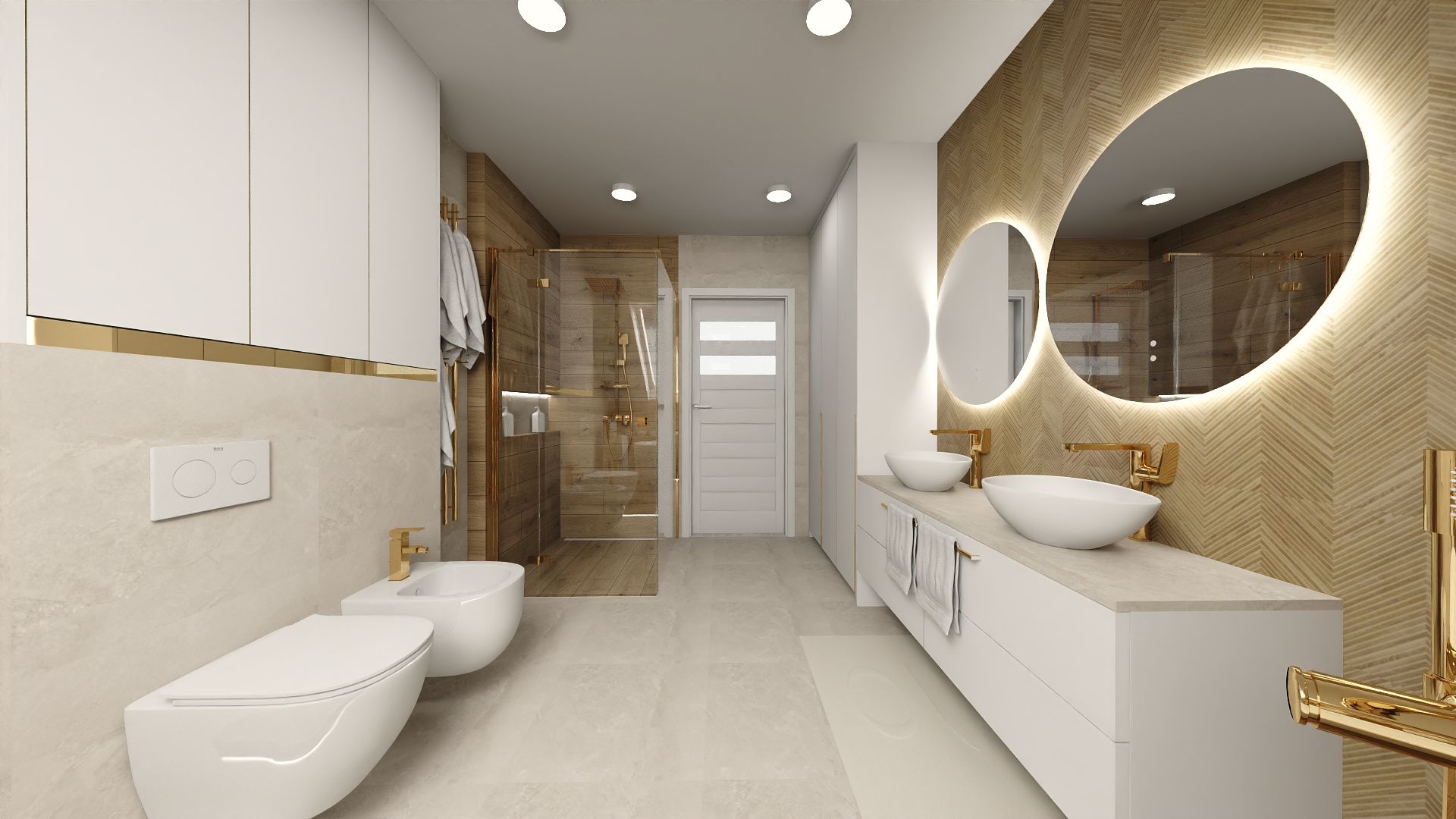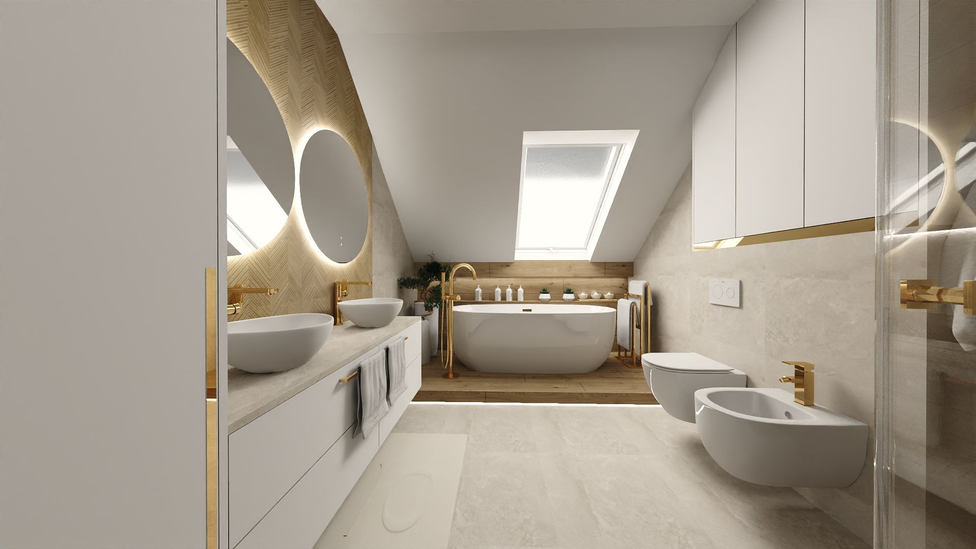 Jasna, ponadczasowa łazienka z neutralną bazą. Armatura złota. Całość wykonana z produktów ogólnodostępnych.
