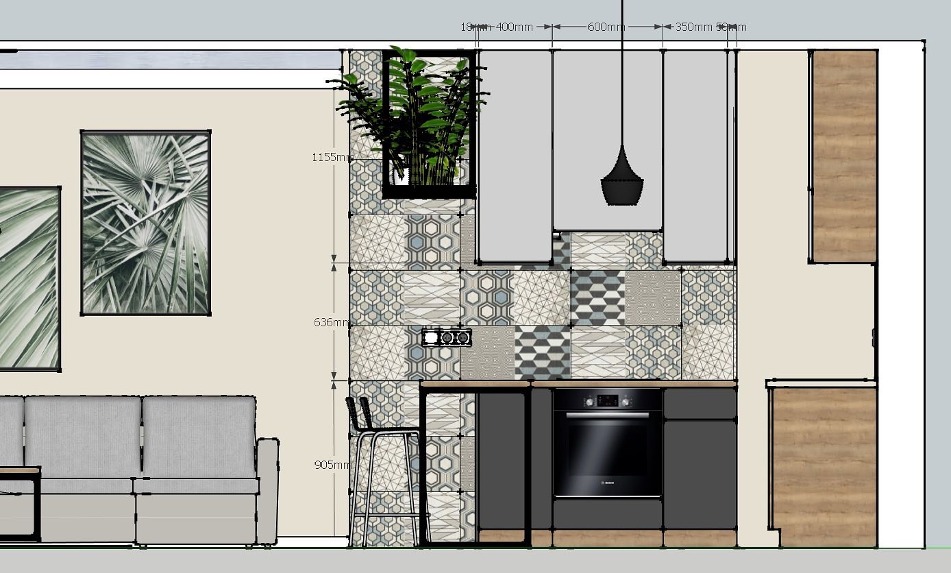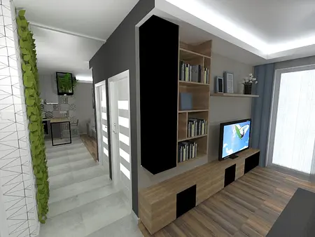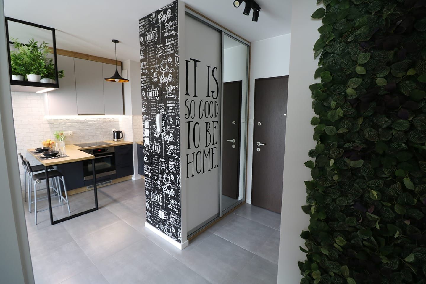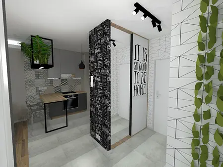 projekt przestrzeni otwartej salon z kuchnią i strefą wejścia widać proces projektowy i jego zmiany podczas realizacji zamierzenia projektowego co udowadnia zdjęcie po realizacji