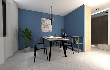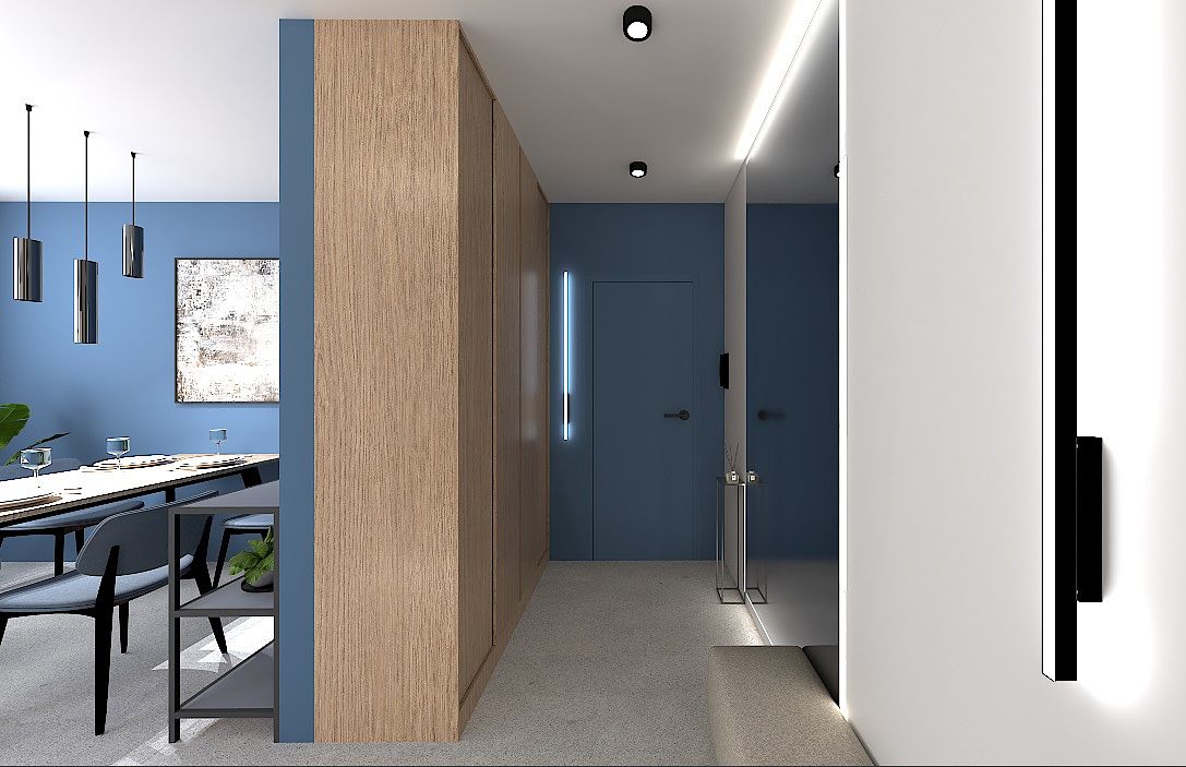 W jadalni dominują eleganckie odcienie niebieskiego, przełamane drewnem i czernią, które nadają wnętrzu charakteru i nowoczesnej elegancji.