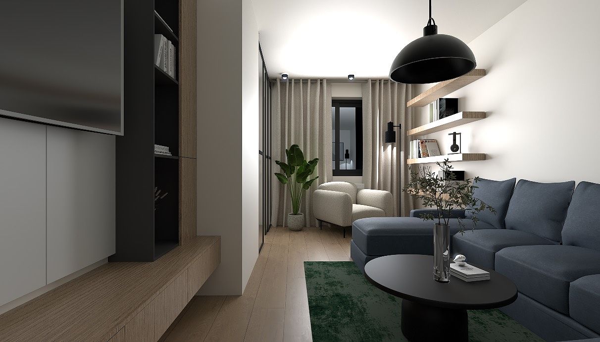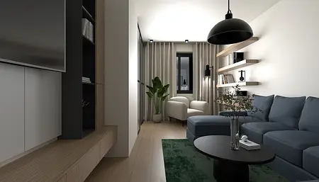 Salon to strefa komfortu — miękkie tkaniny, wygodna sofa i nastrojowe oświetlenie budują przytulny klimat, a naturalna zieleń dodaje świeżości.