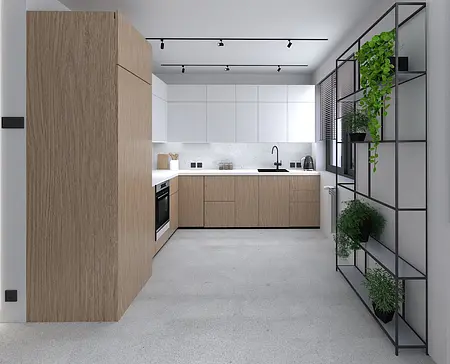 Kuchnia łączy ciepło drewna z minimalistyczną bielą i subtelnymi szarościami, tworząc funkcjonalną i lekką przestrzeń.