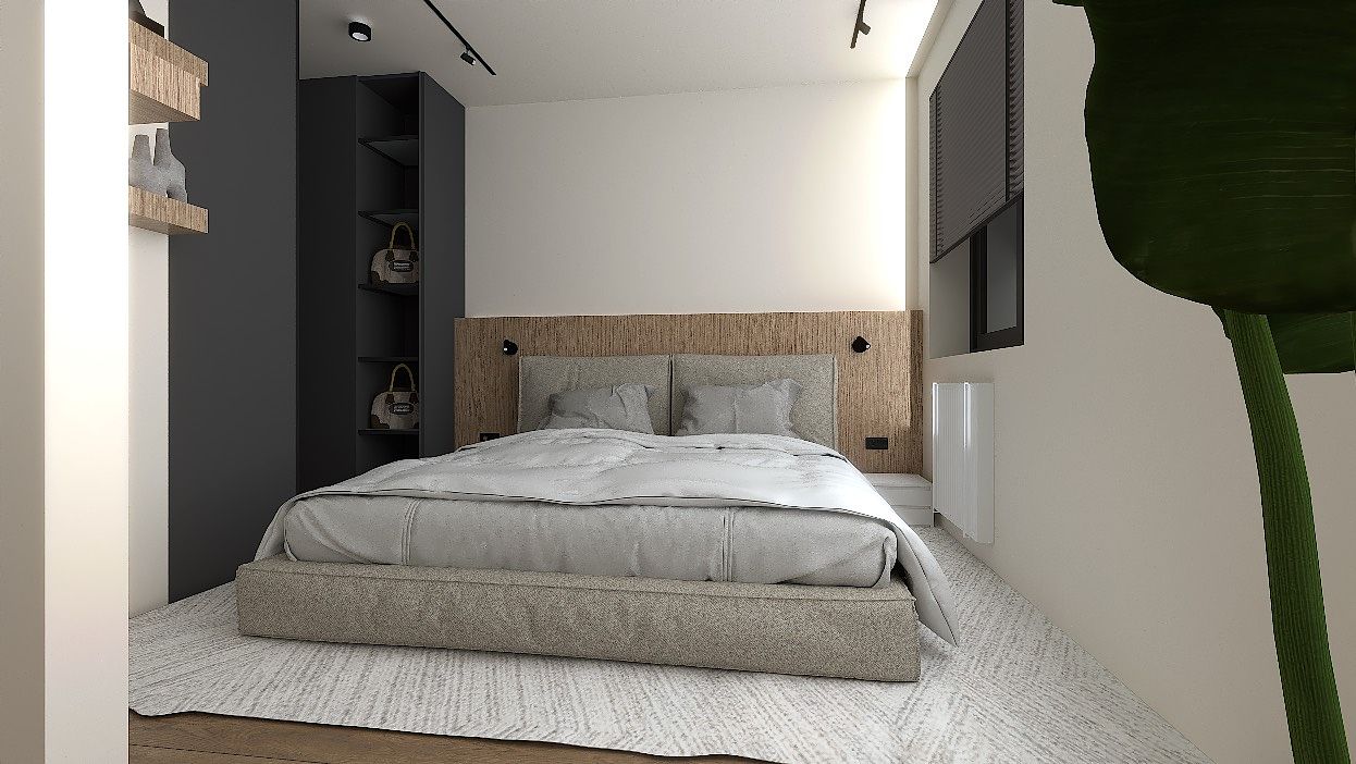 Miękkie tkaniny, tapicerowane łóżko i drewniany zagłówek tworzą atmosferę spokoju, a subtelne światło nadaje wnętrzu ciepła.