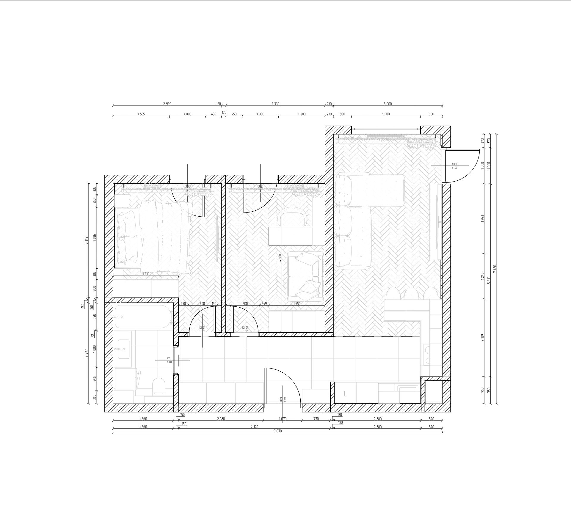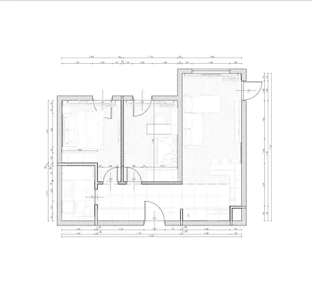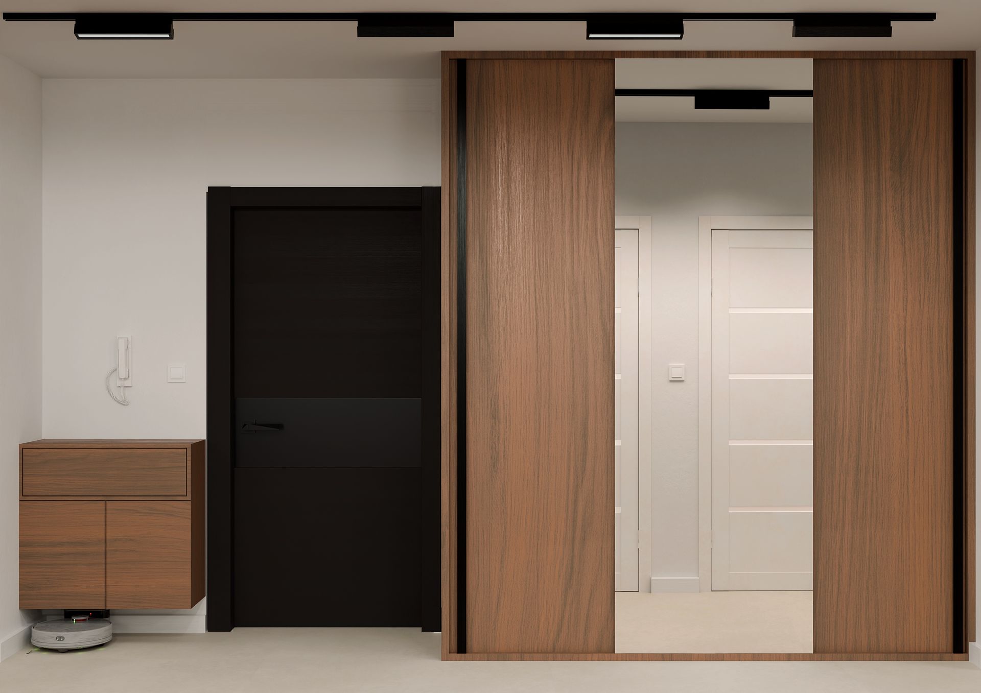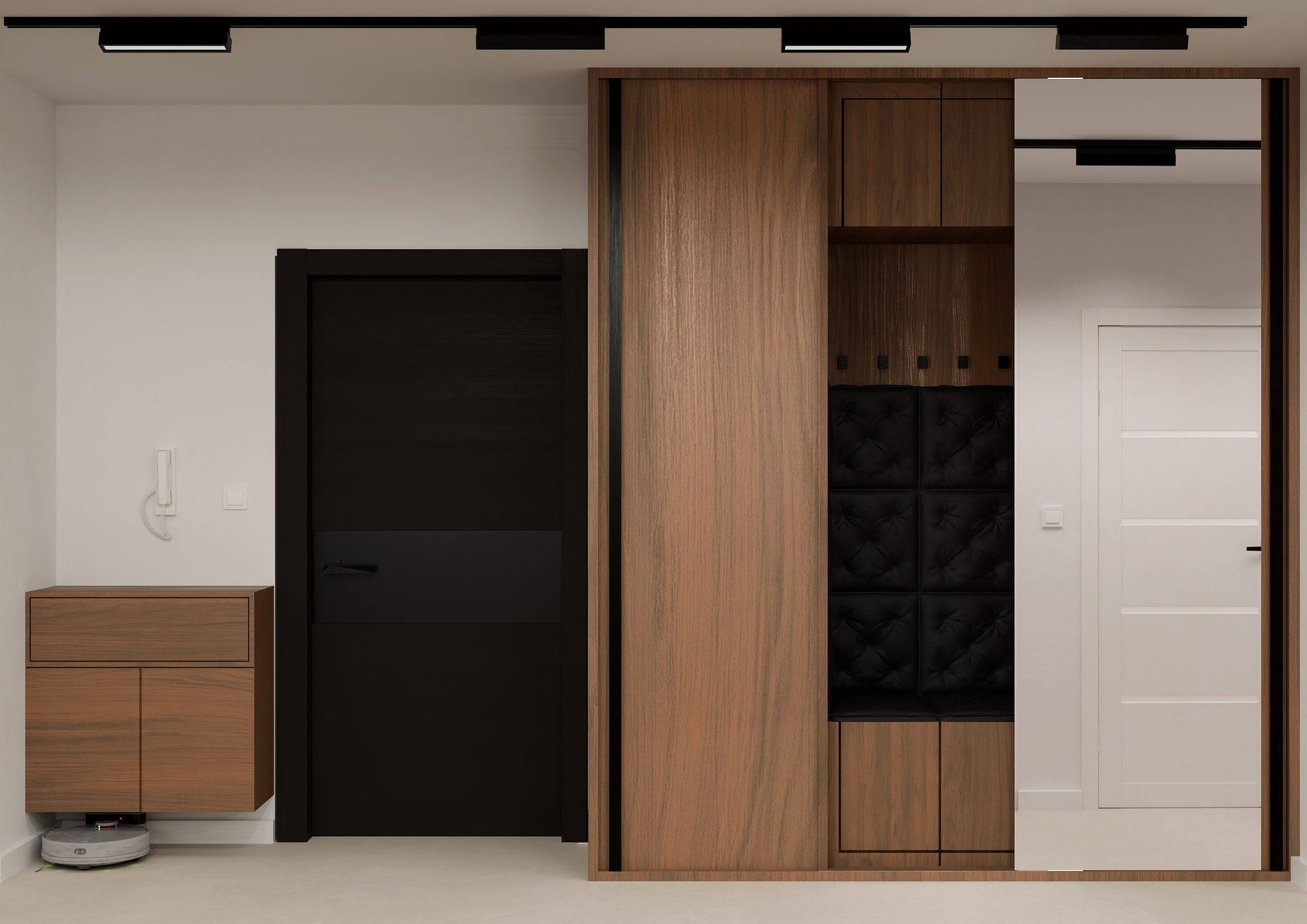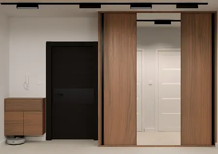 Głównym życzeniem klienta było stworzenie jak największej ilości miejsca do przechowywania i wkomponowanie pufy w korytarzu w szafę przesuwnej. Życzeniem było również wkomponowanie tekstury skały, ale tak, aby była ona lekka i nie rzucała się w oczy.