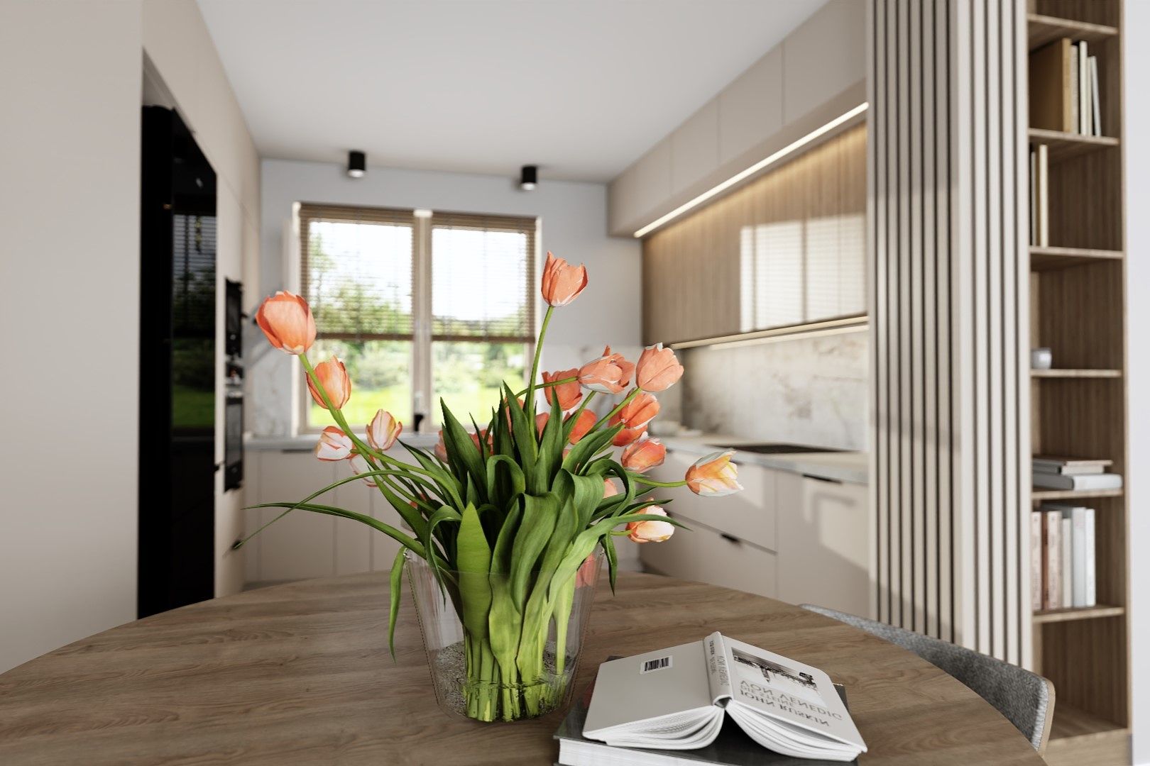 Prezentowana wizualizacja kuchni jest częścią projektu całego domu przy zachowaniu zgodności stylu i kolorystyki we wszystkich pomieszczeniach, kuchnia jest zaaranżowana w ciepłych tonacjach , złamanych szarościami -kaszmir z dodatkami naturalnego orzecha , blat z jasnego szarego konglomeratu, czarne dodatki .
