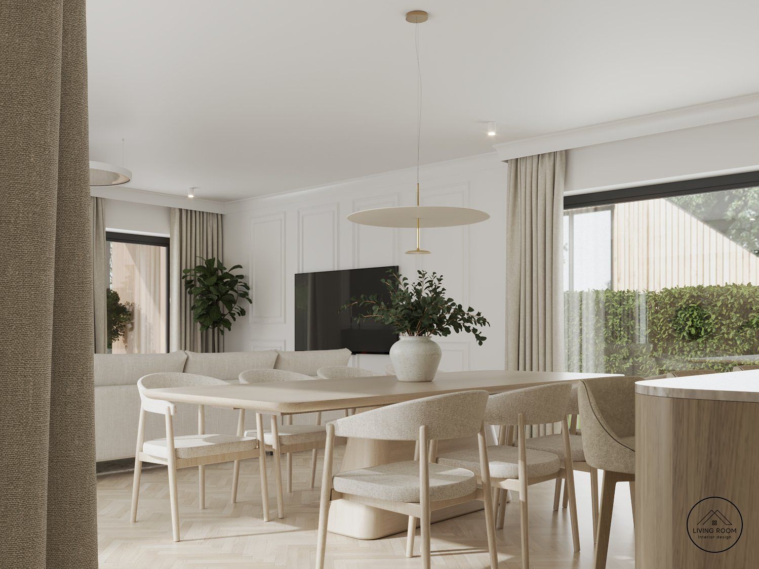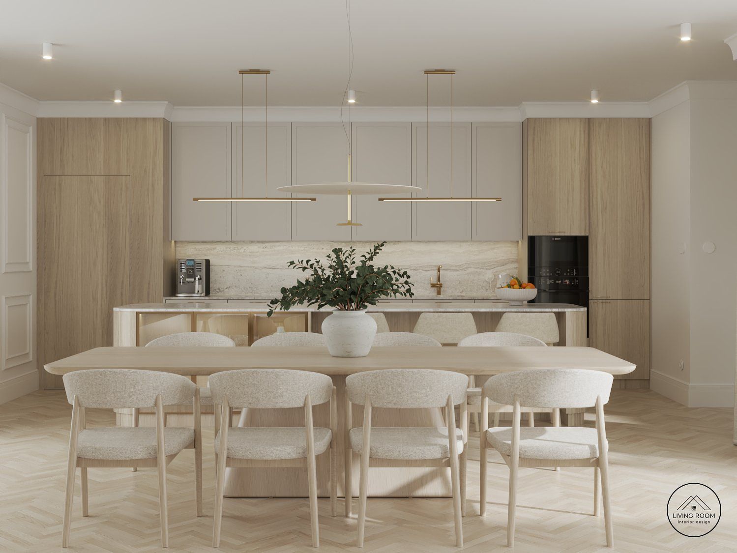 Wnętrze jadalni w stylu japandi z drewnianym stołem i minimalistycznymi krzesłami. 9 zdjęć w projekcie Zobacz projekt
