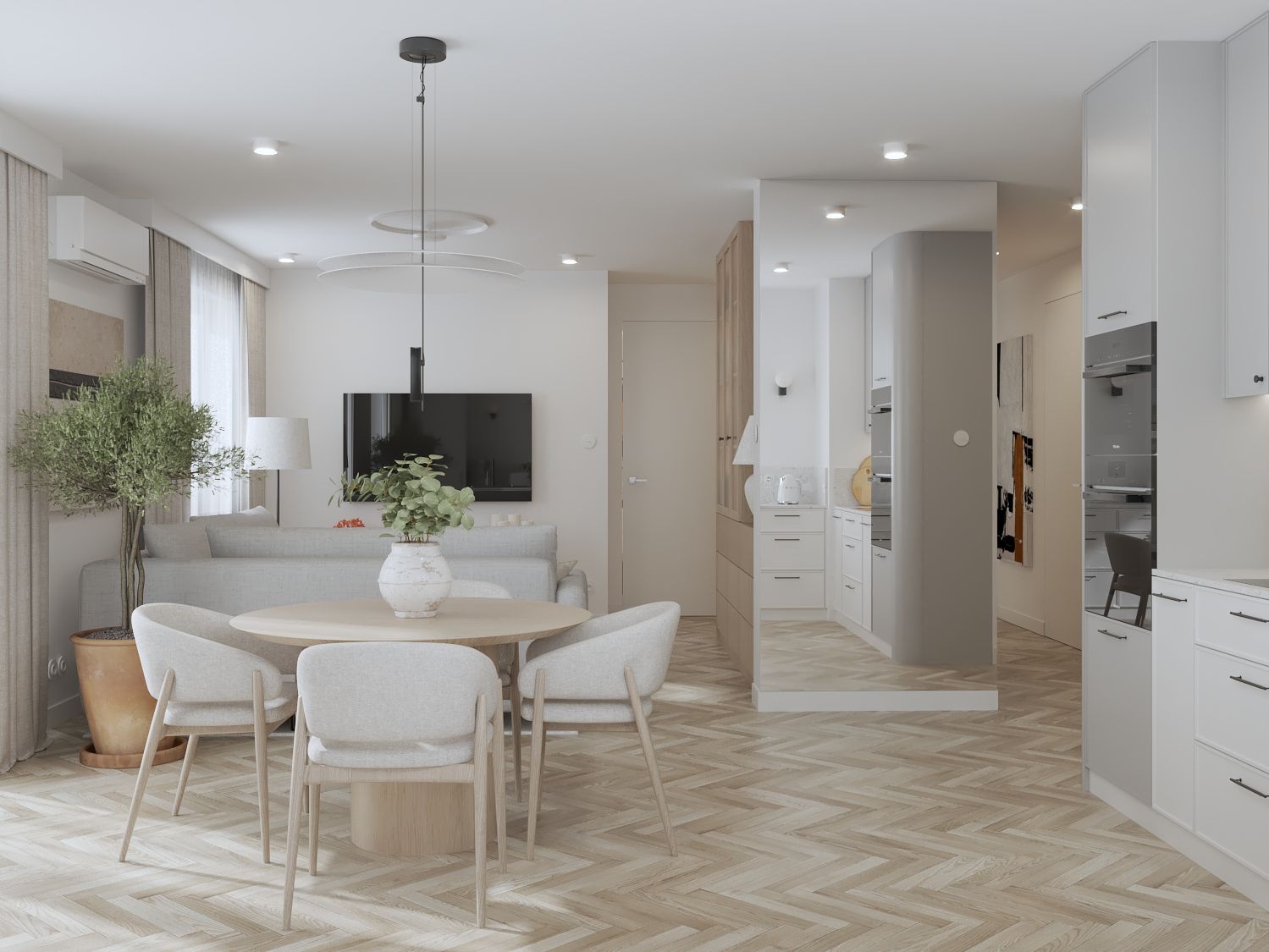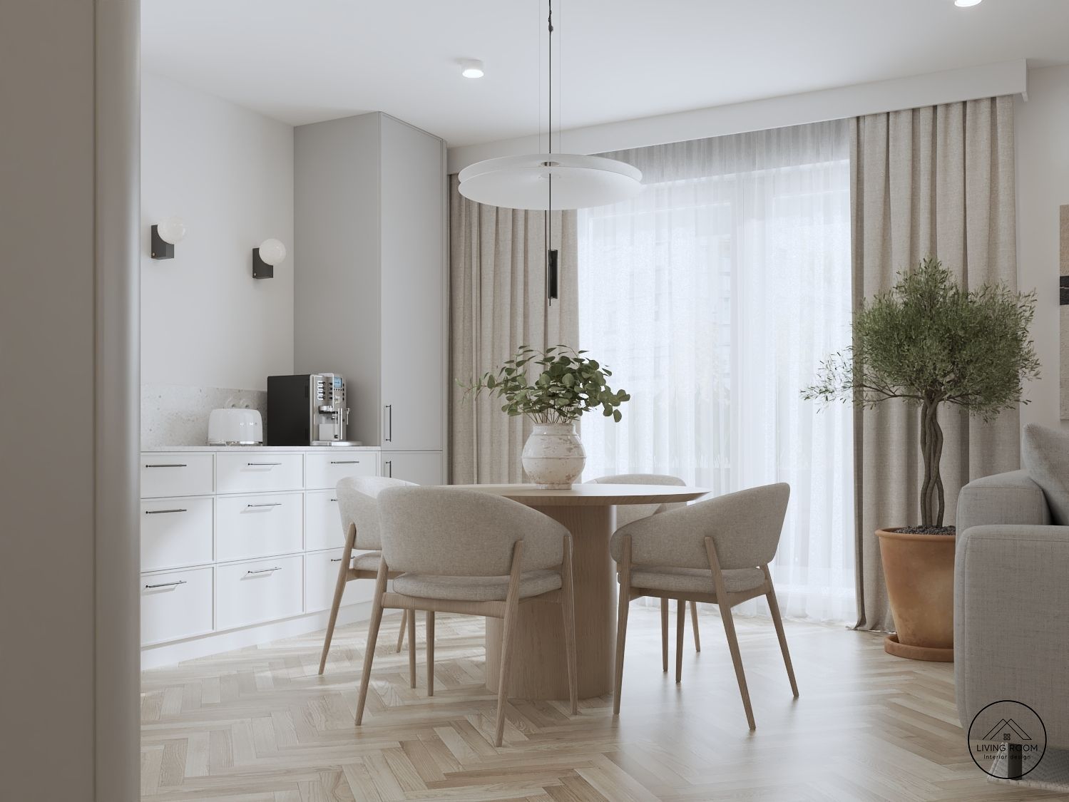 Wnętrze jadalni w stylu japandi z drewnianym stołem i minimalistycznymi krzesłami. 9 zdjęć w projekcie Zobacz projekt