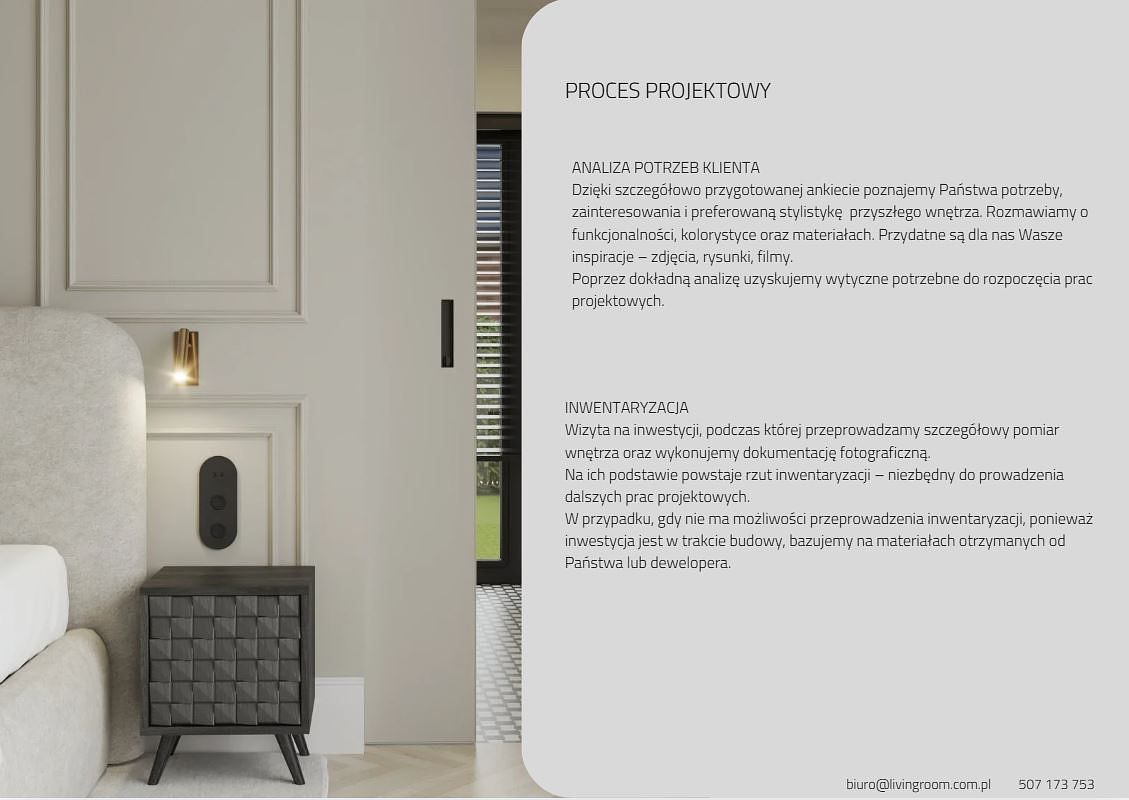 Projekt zawiera: 1. Inwentaryzacja 2. układ funkcjonalny - 2-3 opcje w zależności od potrzeb i potencjału danego pomieszczenia 3. przygotowanie fotorealistycznych wizualizacji z korektami (pracujemy do momentu pełnej akceptacji wizualizacji) 4. rysunki techniczne dla wykonawców 5. szczegółowy kosztorys zawierający każdy element wyposażenia z ceną, ilością i adresem sklepu