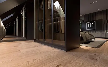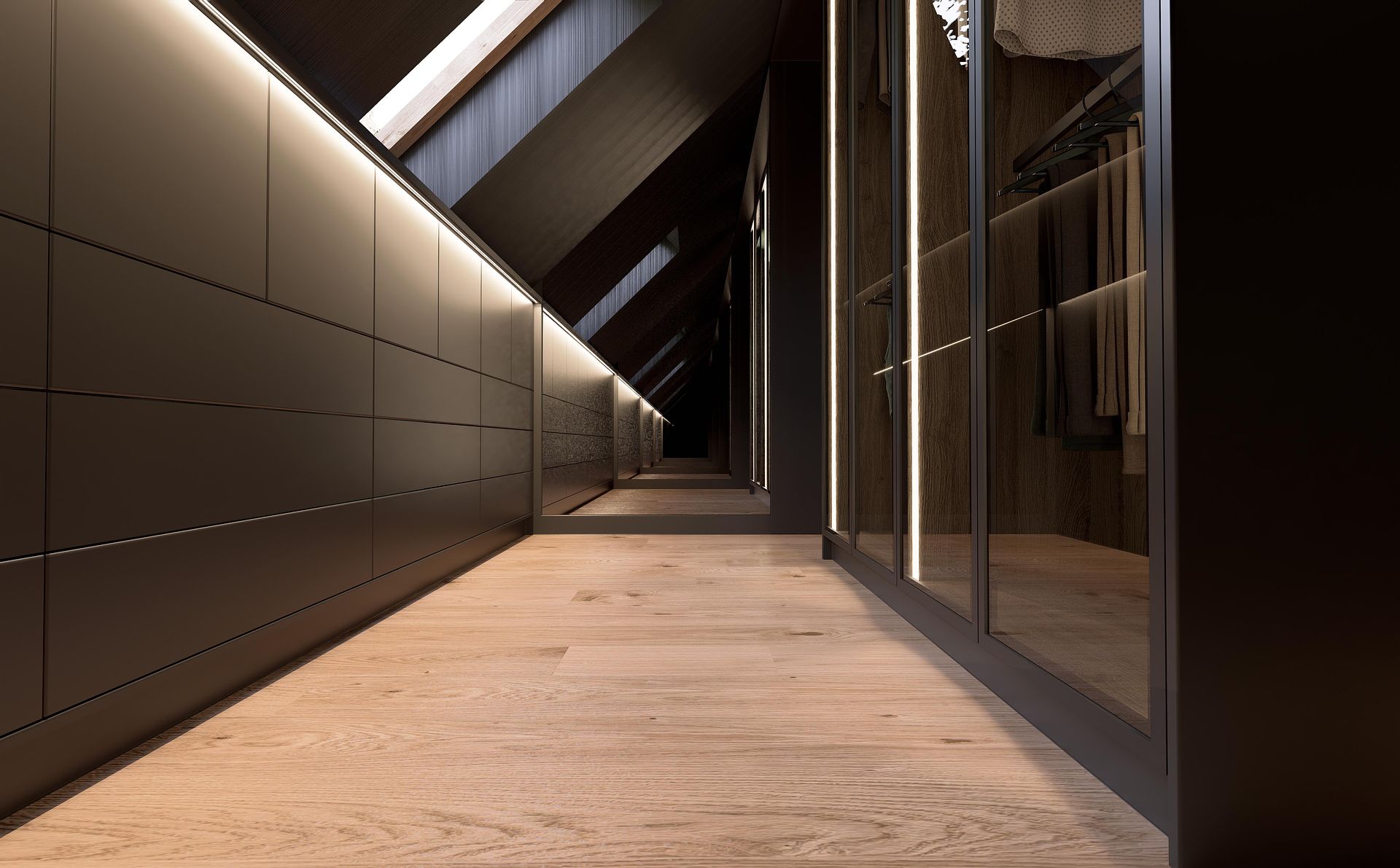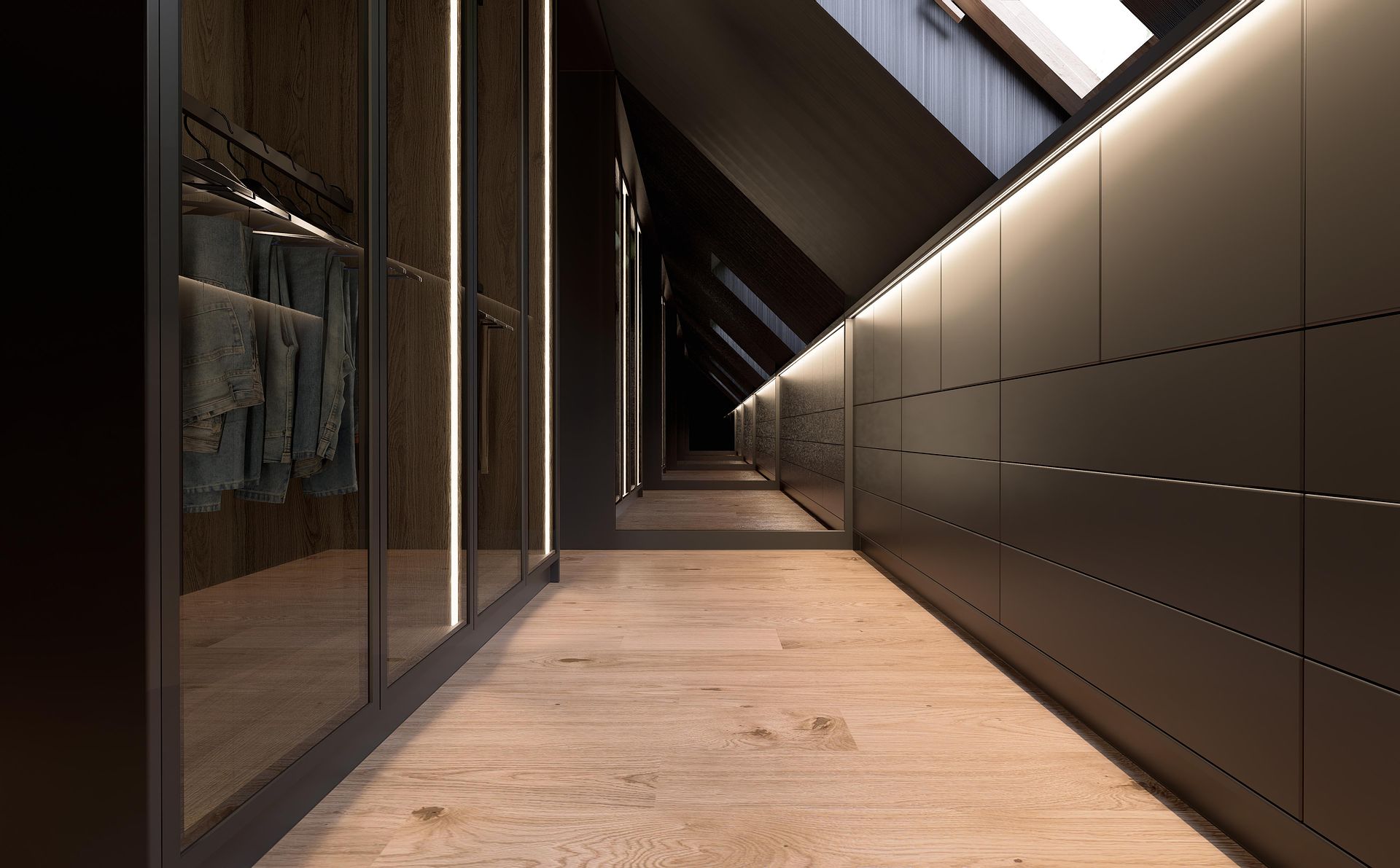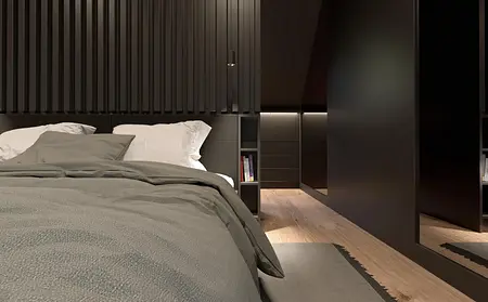 Projekt sypialni z garderobą pod skosem. Ciemne tkaniny, czarne kolory.
