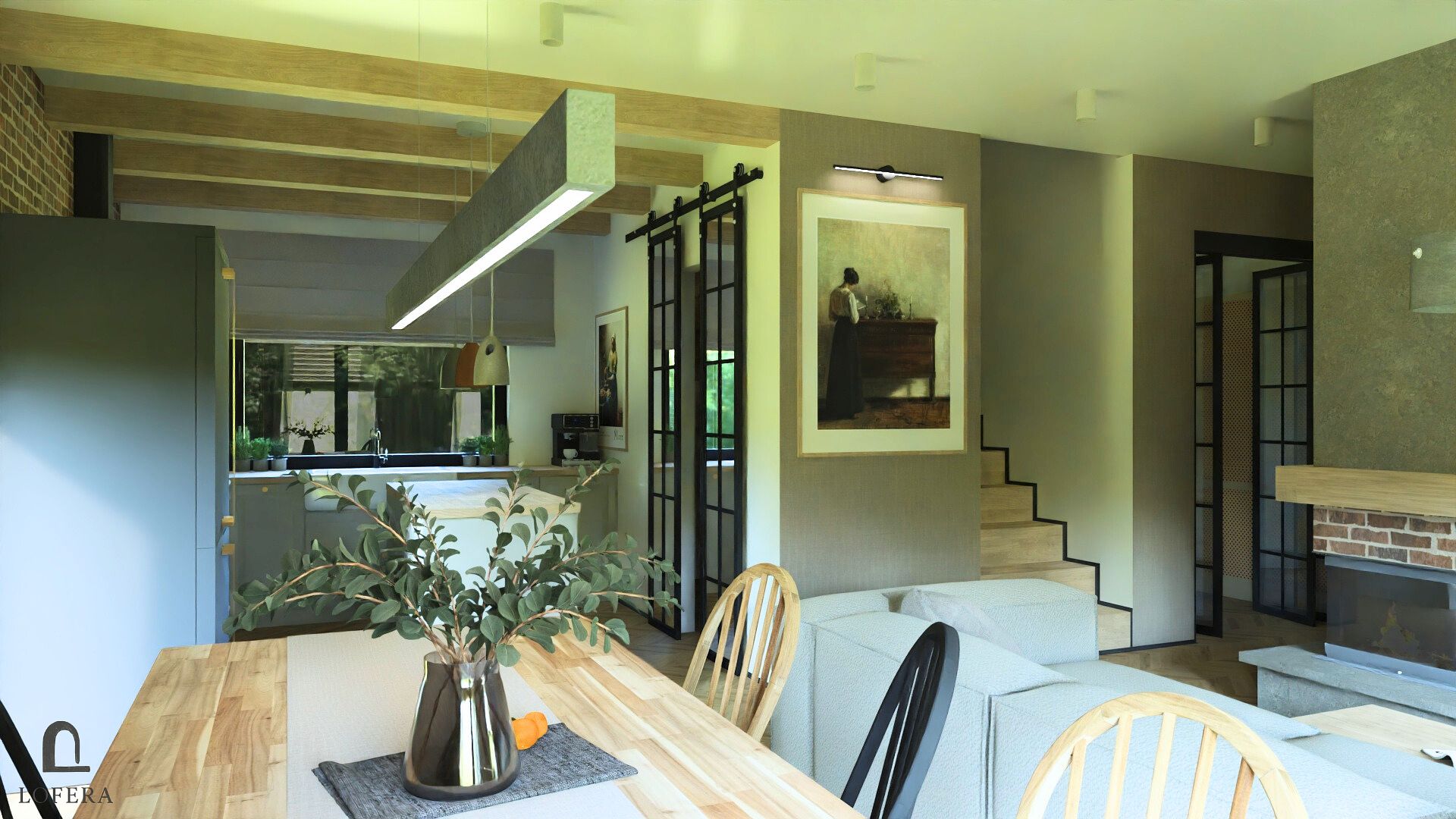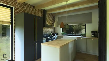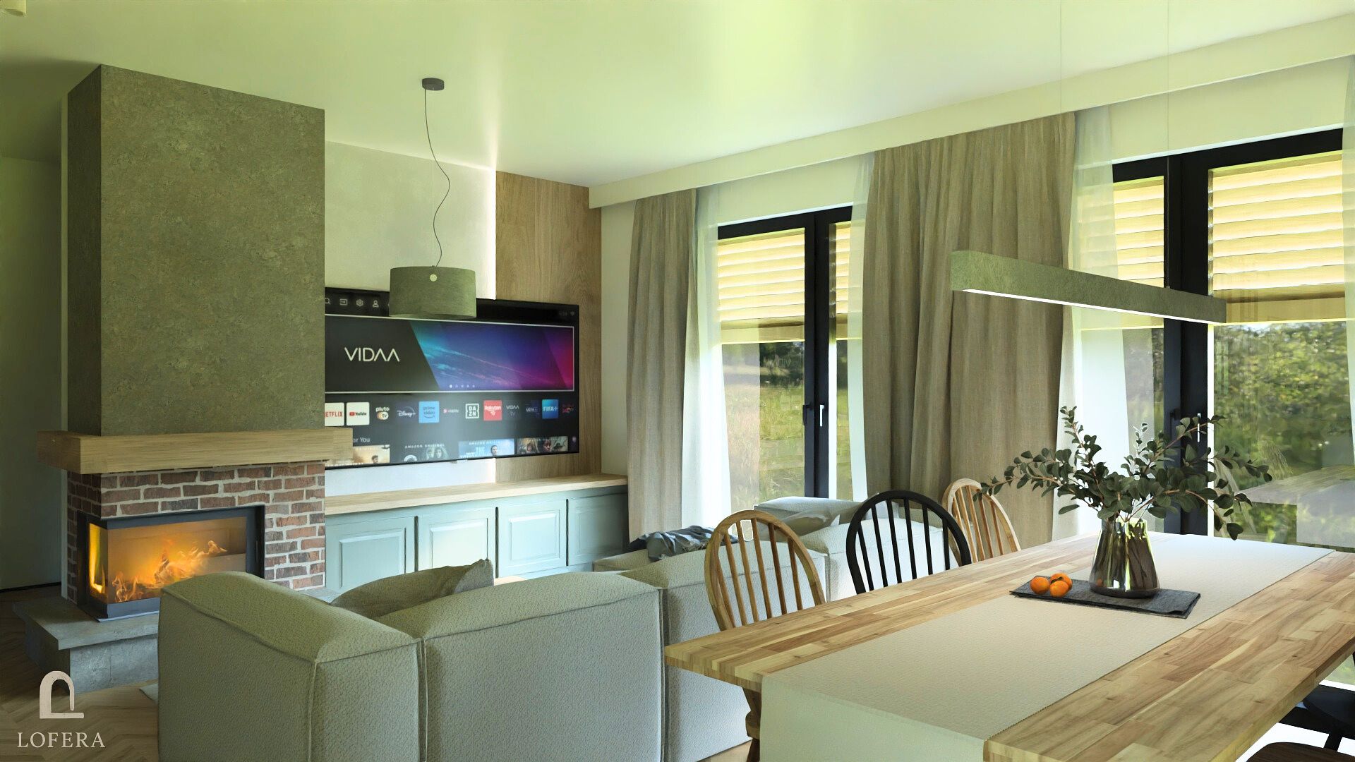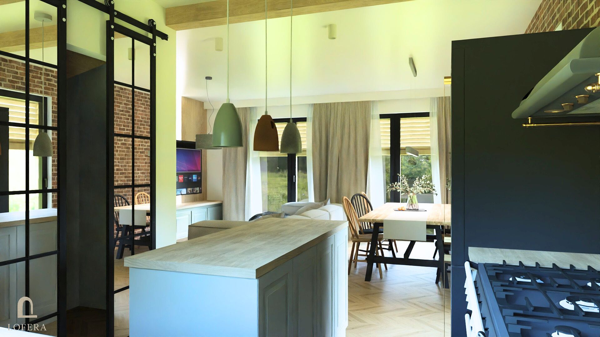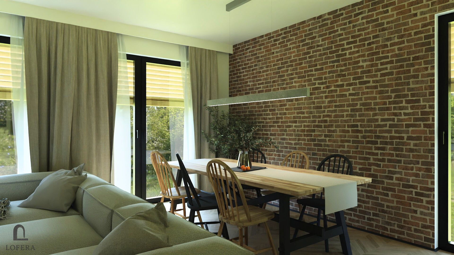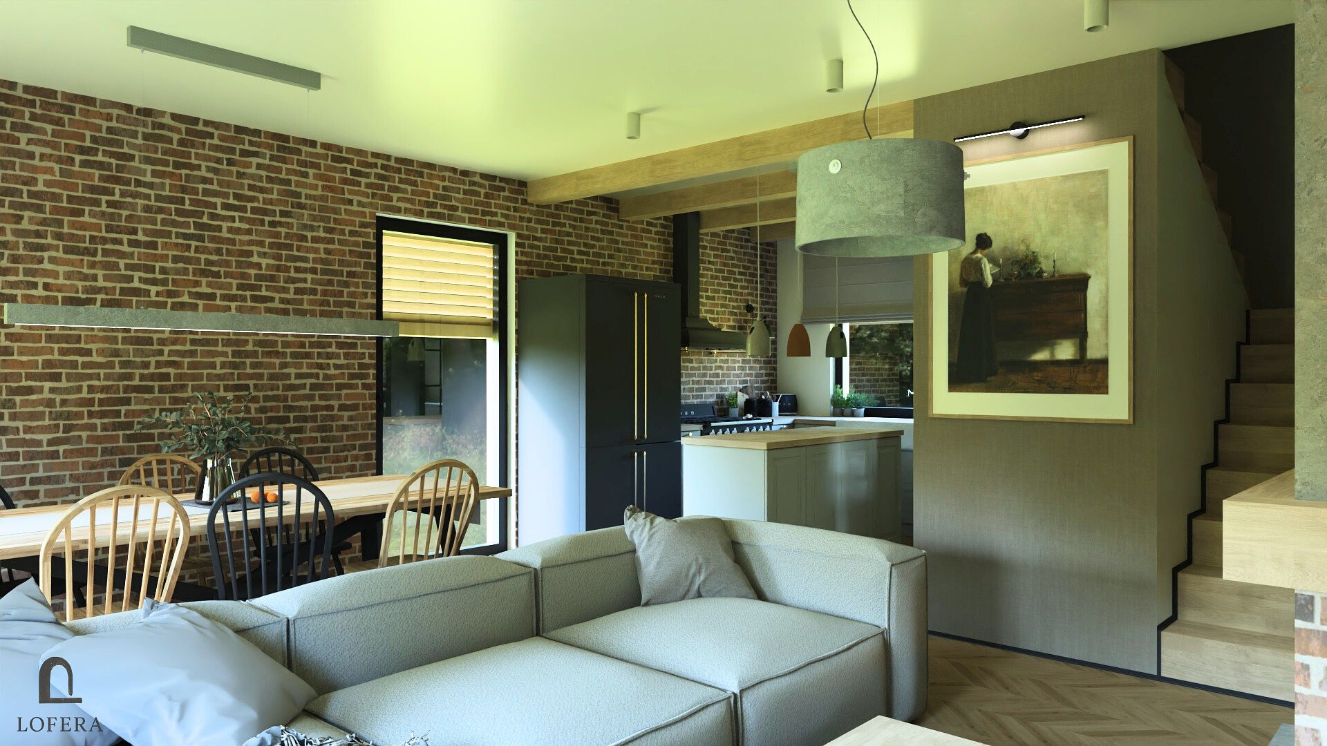 Projekt salonu z aneksem kuchennym powstał w odpowiedzi na kluczowe oczekiwania inwestora — zmianę pierwotnego układu funkcjonalnego kuchni oraz stworzenie przestrzeni, w której centralnym punktem będzie wymarzona, wolnostojąca wyspa. Przearanżowaliśmy układ tak, aby kuchnia zyskała większą swobodę użytkowania, lepszą ergonomię i naturalne powiązanie ze strefą dzienną. Istotnym elementem projektu było także wykorzystanie starej cegły pochodzącej z rozbiórki domu, który kiedyś stał na działce inwestora. Materiał ten stał się wyjątkowym akcentem wnętrza — nie tylko dekoracyjnym, ale niosącym osobistą wartość i historię miejsca. Wkomponowaliśmy cegłę w aranżację tak, aby tworzyła ciepłe, autentyczne tło i podkreślała charakter przestrzeni, jednocześnie harmonizując z nowoczesnymi elementami wyposażenia. Efektem jest spójne, funkcjonalne wnętrze, w którym tradycja spotyka współczesność, a potrzeby inwestora zostały zrealizowane w pełni i z dbałością o każdy detal.