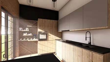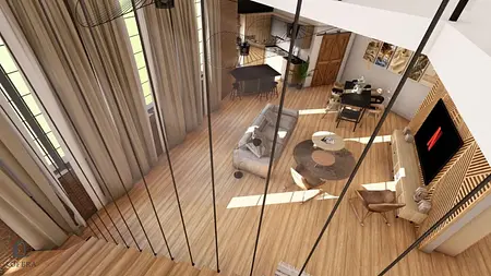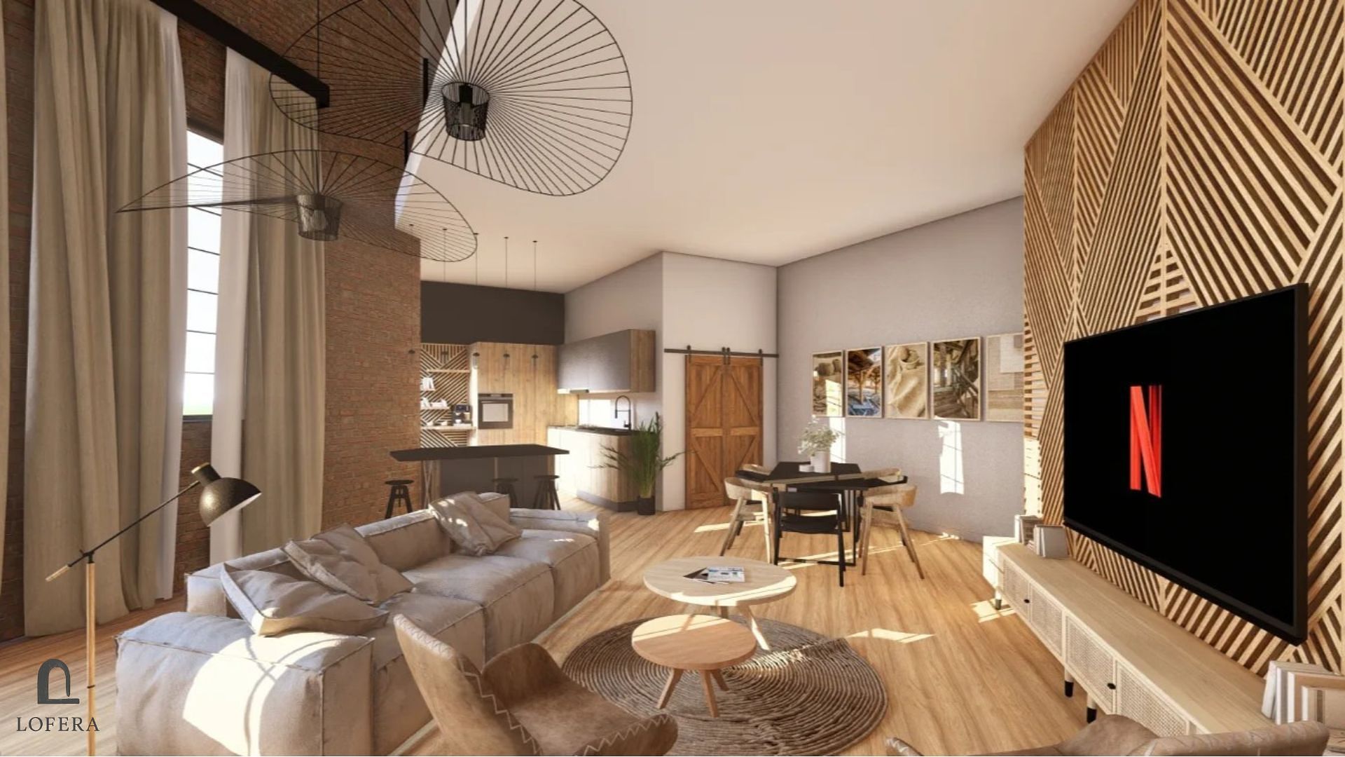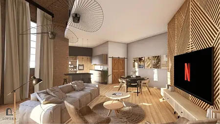 Projekt salonu z aneksem kuchennym powstał w wyjątkowej przestrzeni o bardzo wysokim stropie i nieregularnym kształcie, co samo w sobie stanowiło zarówno wyzwanie, jak i inspirację. Mieszkanie znajduje się w budynku, w którym niegdyś działała stara farbiarnia, dlatego jednym z głównych założeń było świadome nawiązanie do historii tego miejsca i podkreślenie jego industrialnego charakteru.