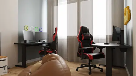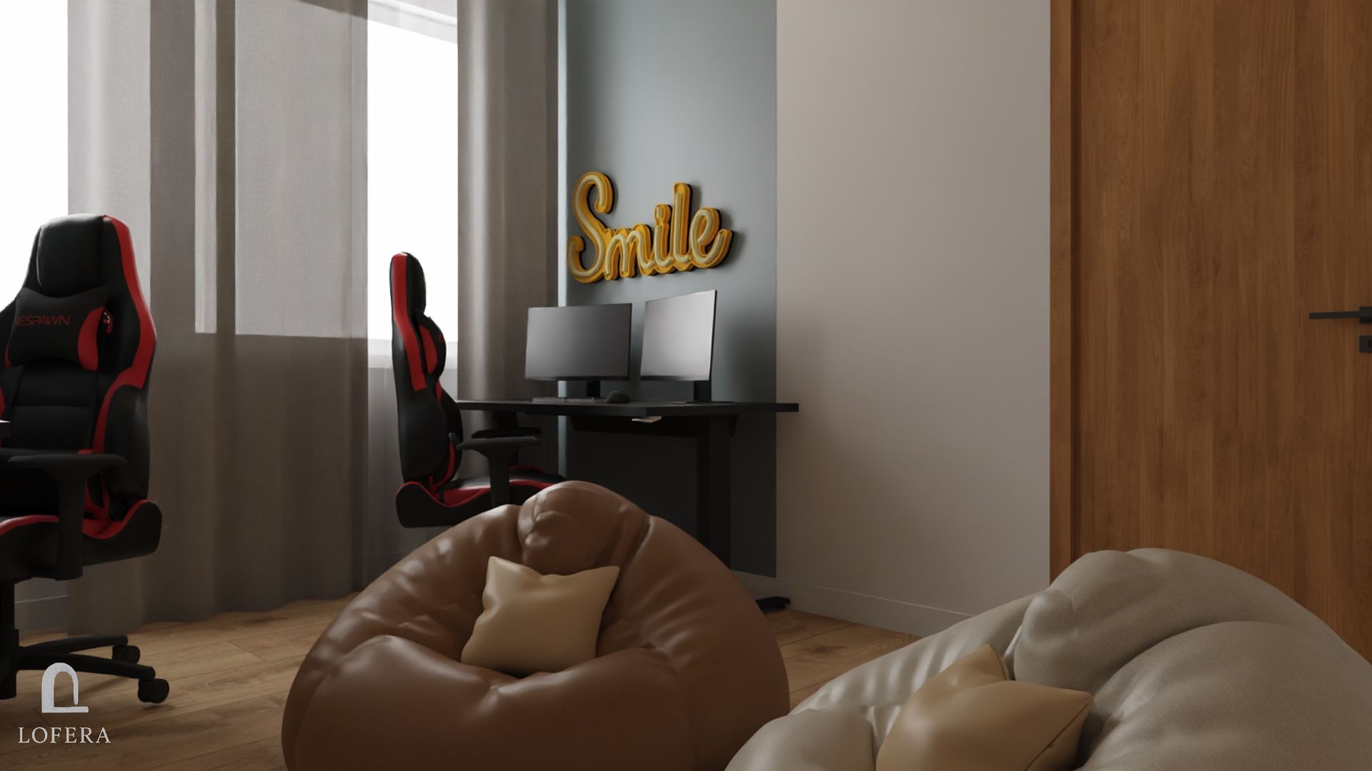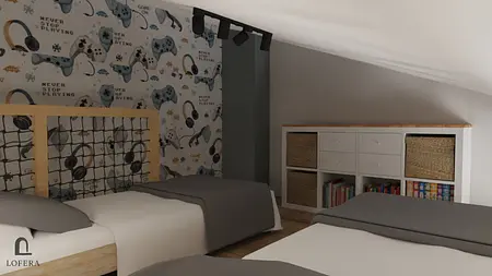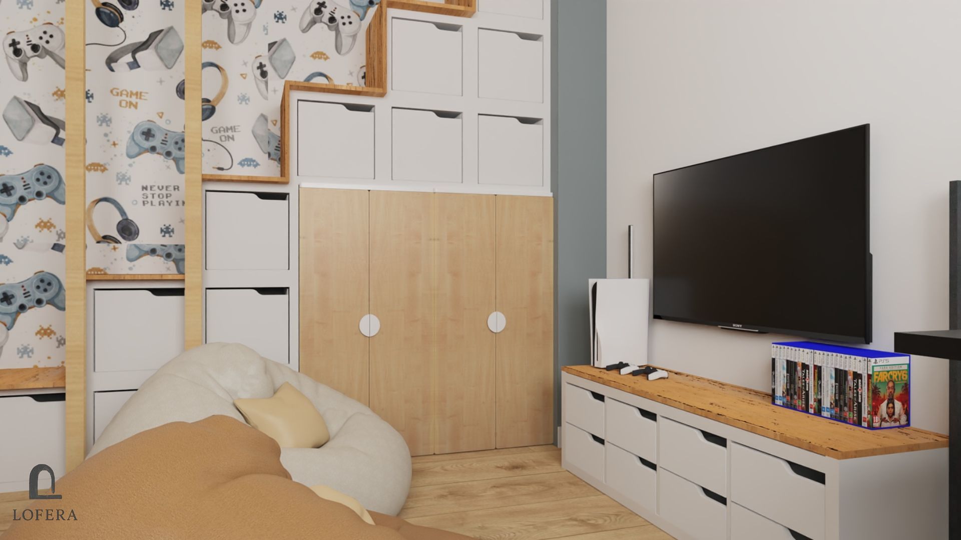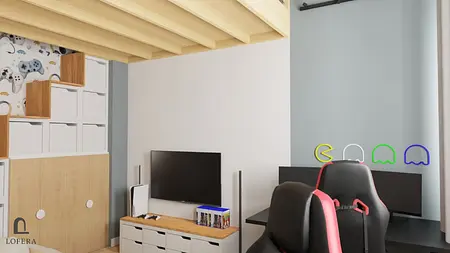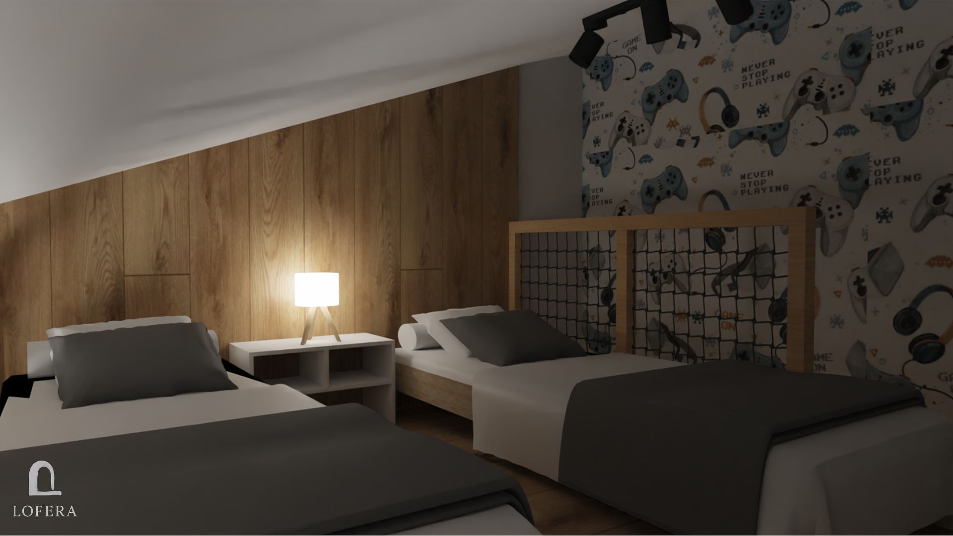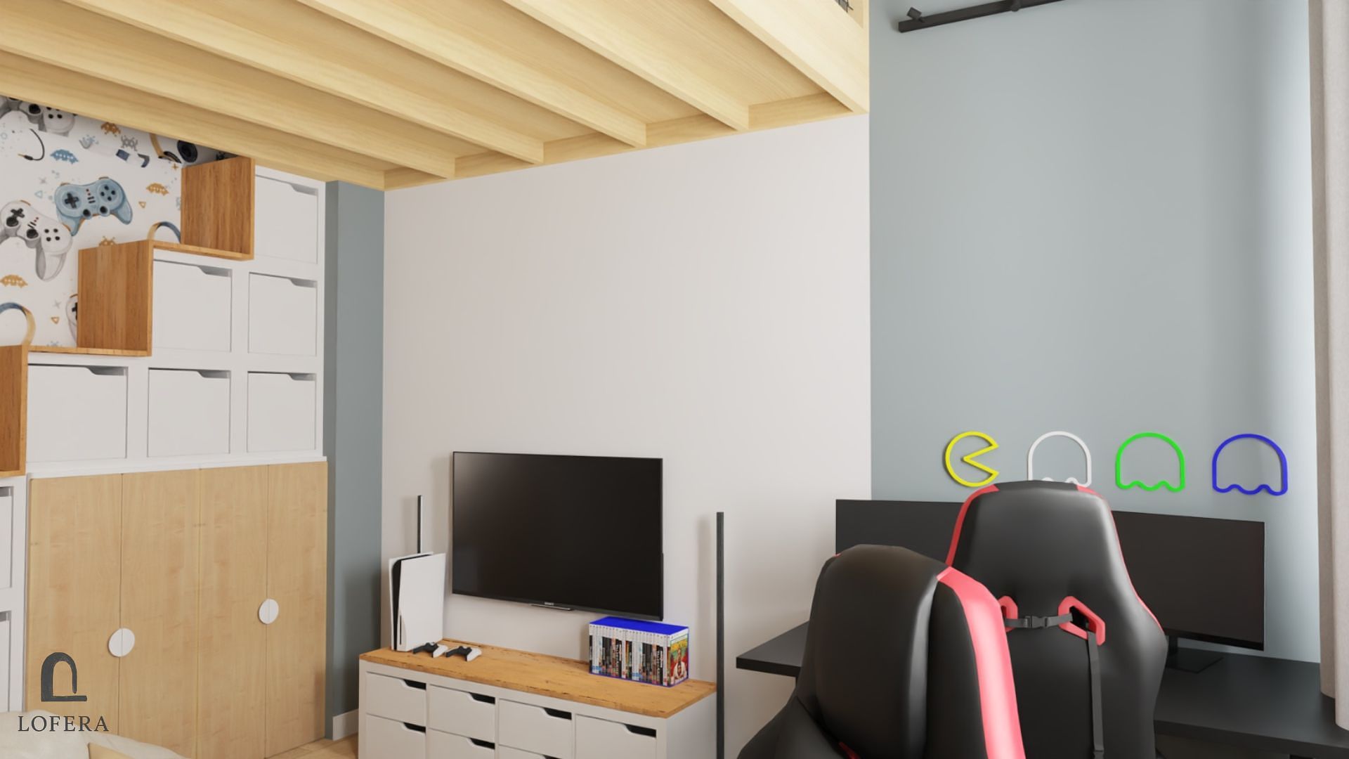 Wysoki pokój chłopięcy z antresolą został zaprojektowany z myślą o dwóch uczniach, którzy uwielbiają gry komputerowe i konsolowe. Przestrzeń utrzymano w delikatnej, pastelowej kolorystyce, nadającej wnętrzu lekko gamingowy, ale jednocześnie przyjazny i spokojny charakter. W głównej części pokoju znajdują się dwa ergonomiczne stanowiska komputerowe oraz oddzielne miejsce do grania na konsoli, co pozwala chłopcom komfortowo korzystać z przestrzeni niezależnie od siebie. Na antresoli zaplanowano część sypialnianą z dwoma łóżkami, zapewniającą prywatność i wyraźne oddzielenie strefy wypoczynku od strefy rozrywki i nauki. Dzięki wykorzystaniu wysokości pomieszczenia pokój jest funkcjonalny, nowoczesny i idealnie dopasowany do potrzeb młodych użytkowników.