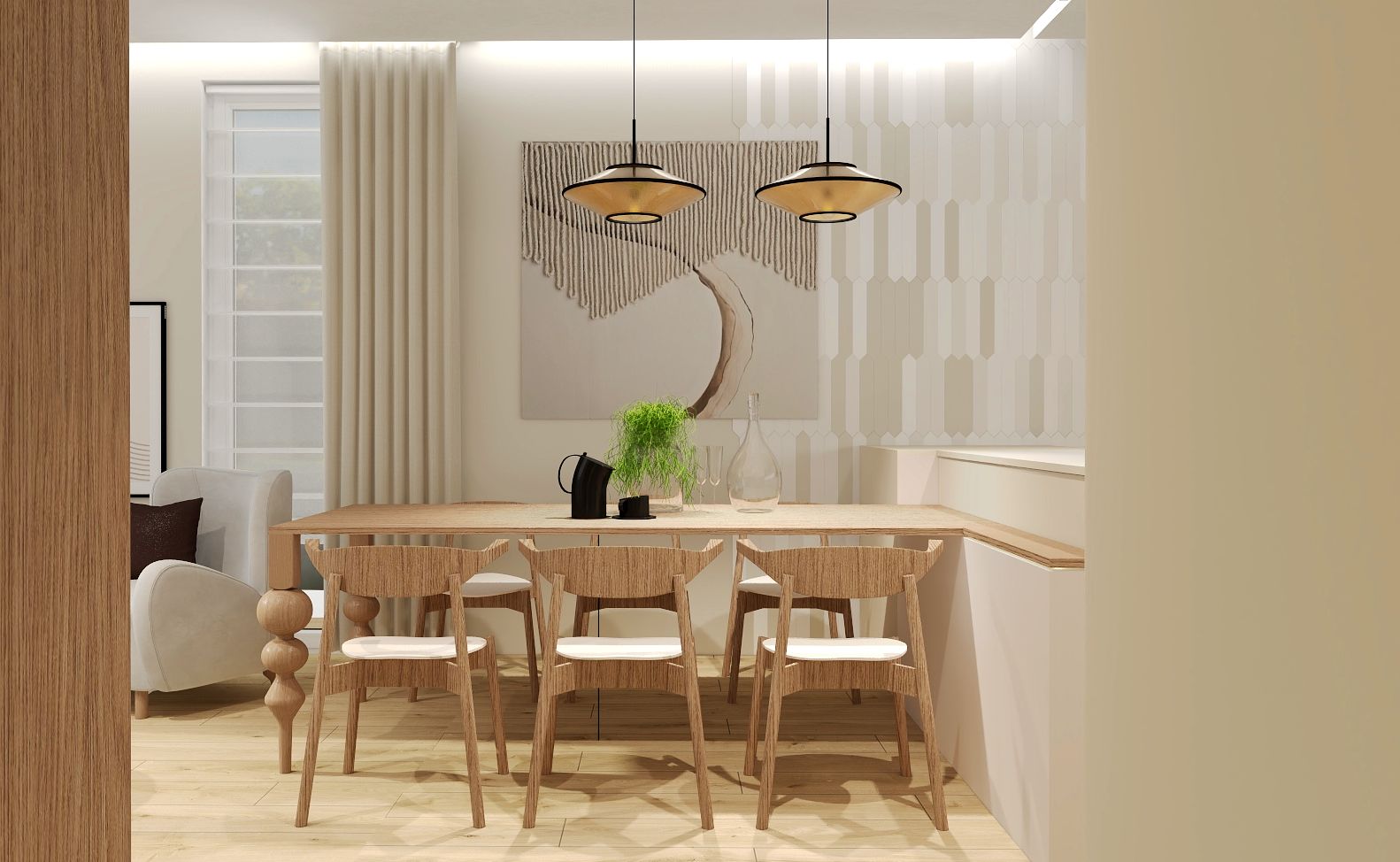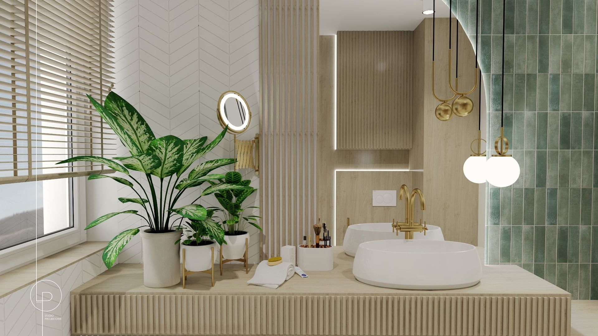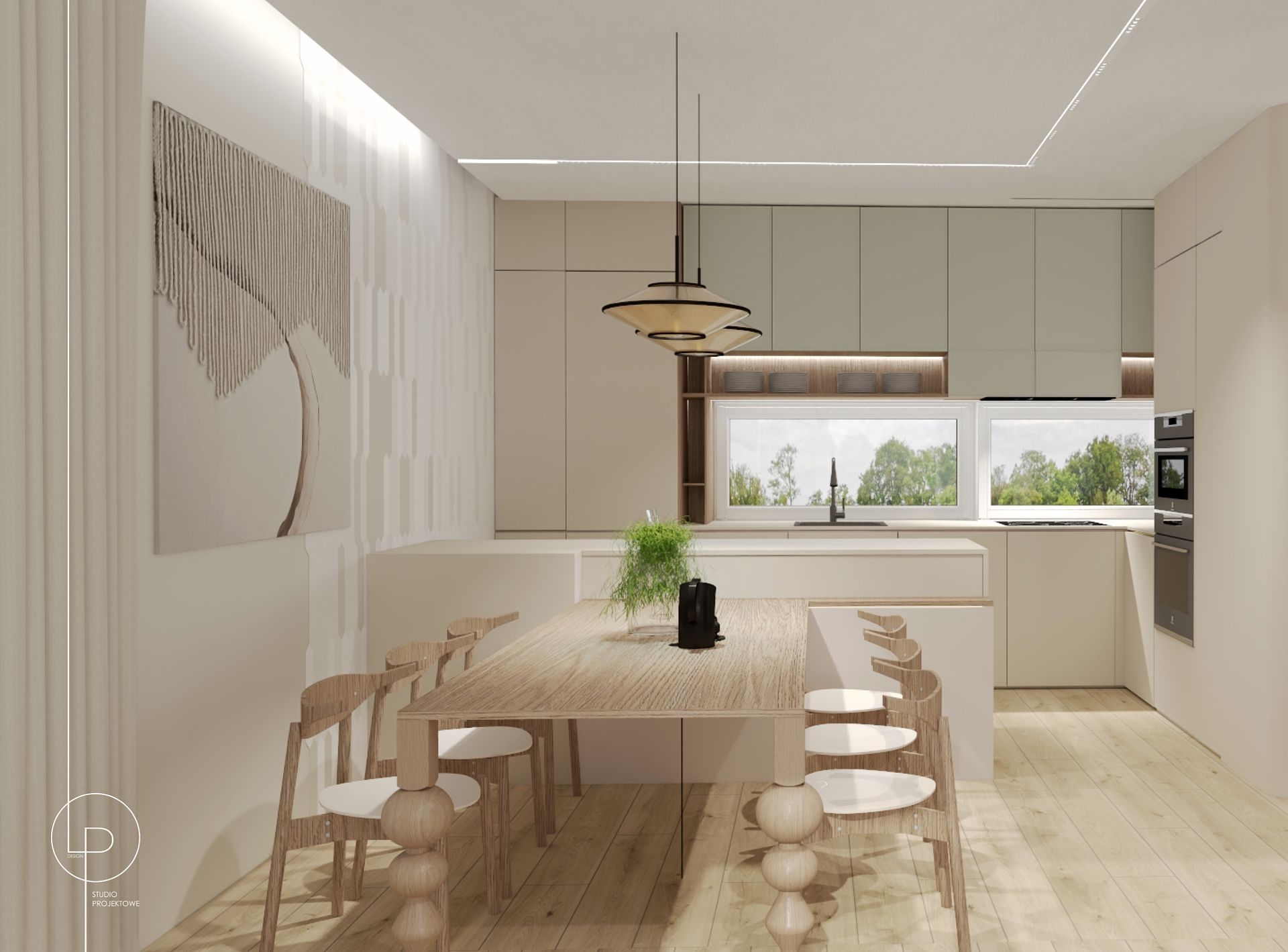 Ten dom to ukłon w stronę prostoty i naturalnych materiałów stylu japandi. Stonowane beże i ciepłe drewno budują neutralną bazę, którą dopełniają subtelne akcenty – jak miętowe fronty kuchennych szafek, które ożywiają przestrzeń. Turkusowa płytka w jednej z łazienek staje się mocną dominantą – kolorowym przystankiem w spokojnym rytmie wnętrza. W drugiej – motyw roślinny tapety dodaje lekkości i organicznego charakteru.