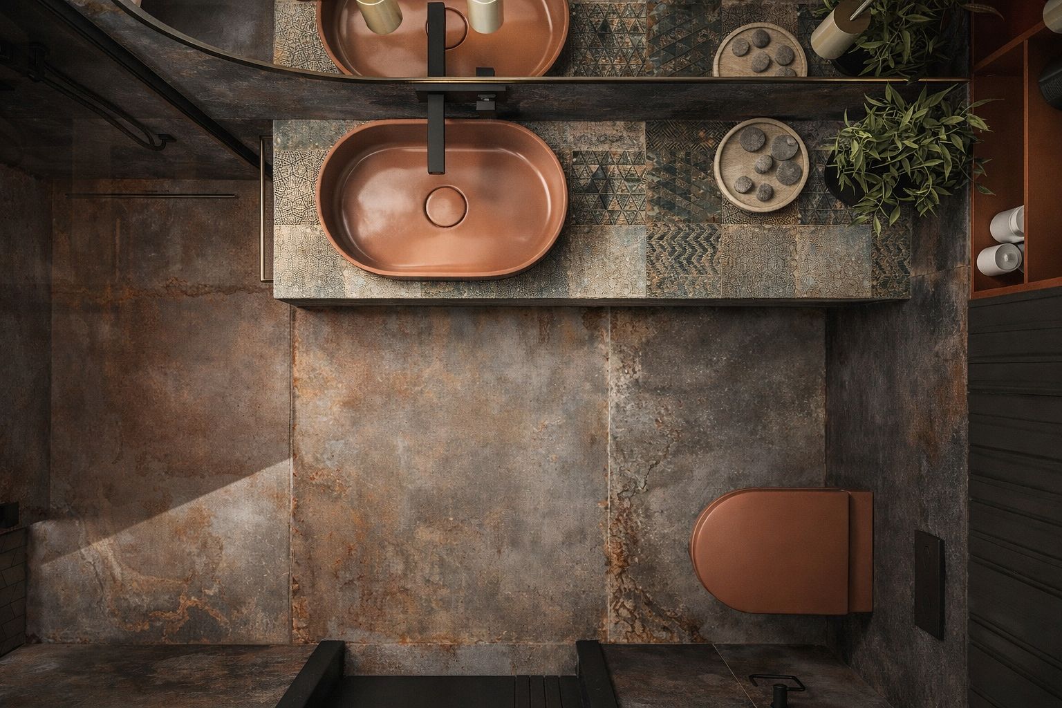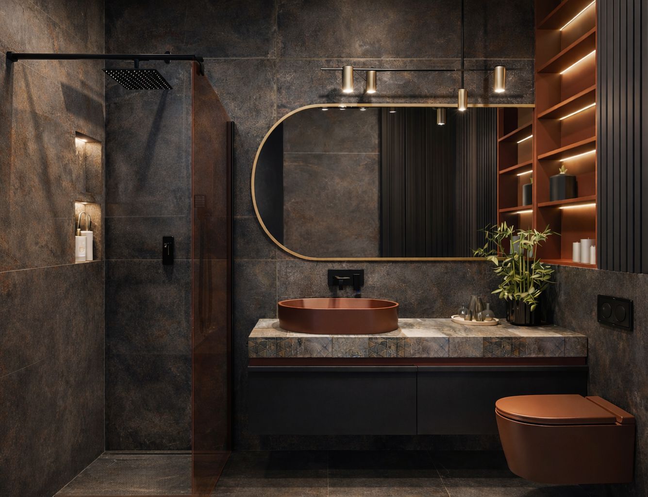 Projekt łazienki w stylu nowoczesnym z akcentami sanitariatów w kolorze terakoty.
