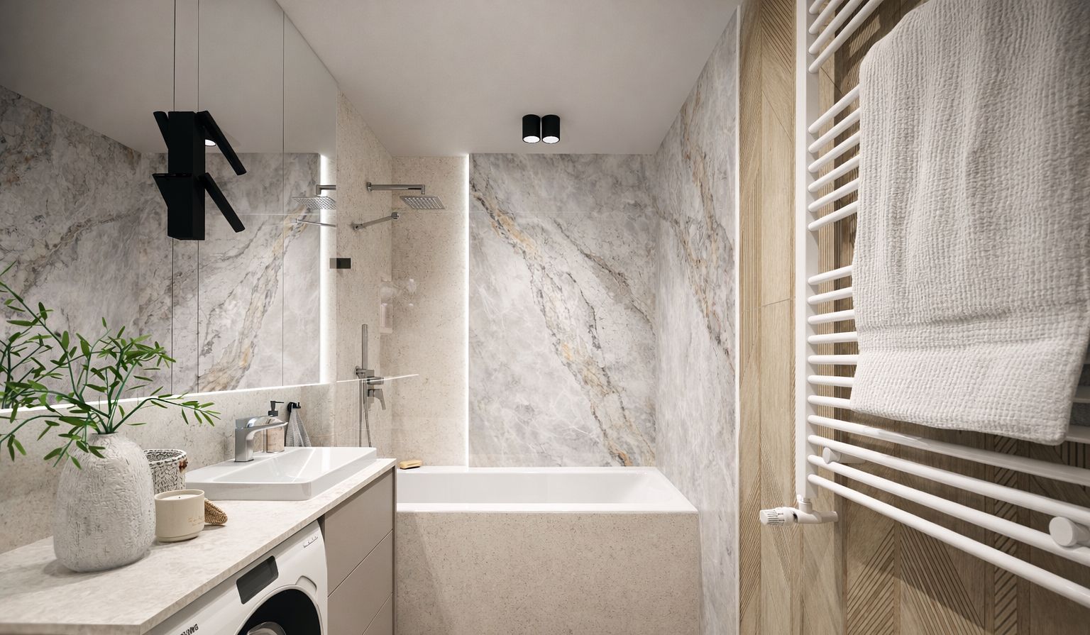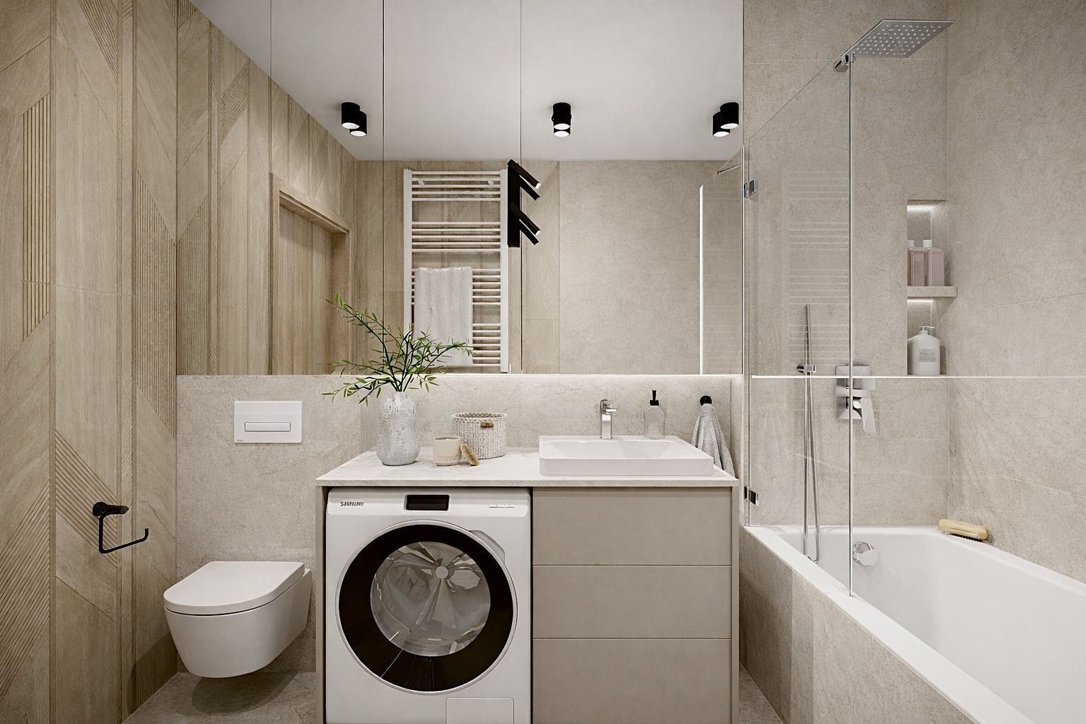 Projekt łazienki w spokojnych kolorach beżu i drewna przełamany płytką wielkoformatową z imitacją kamienia.