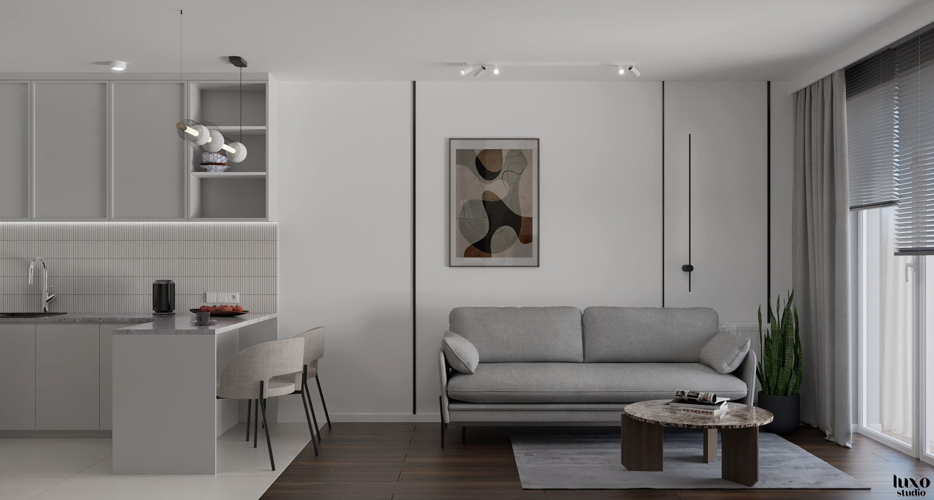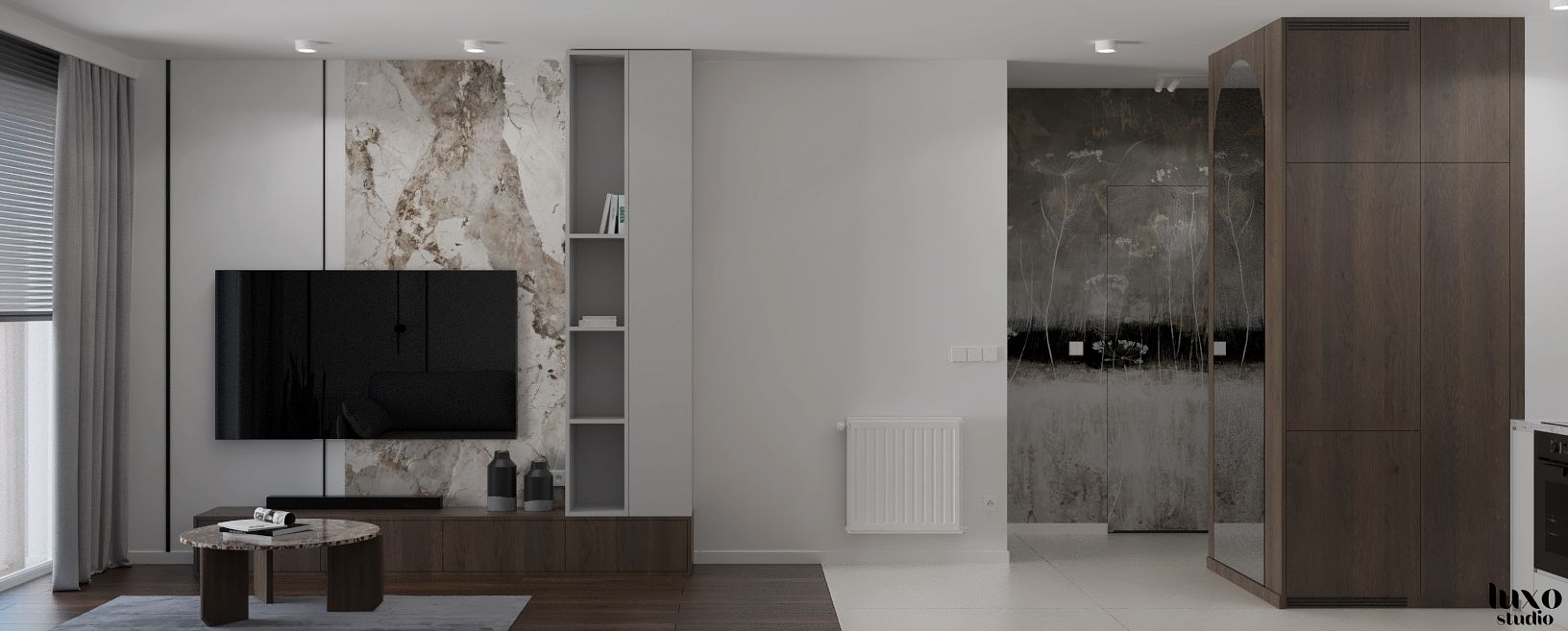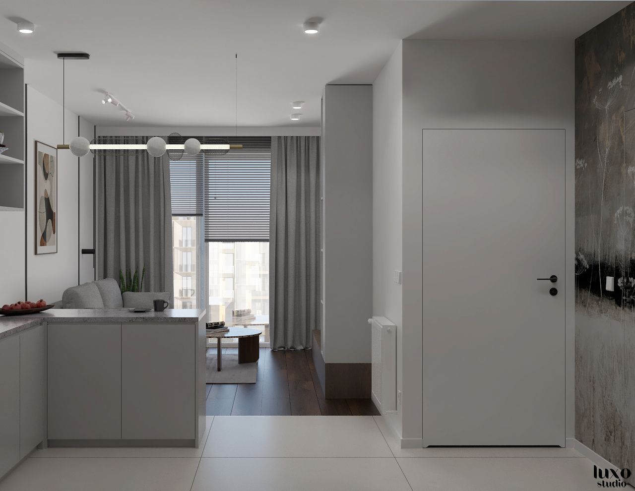 Projekt wnętrza o powierzchni 42 m² został przygotowany z wyjątkową dbałością o każdy detal, tak aby w pełni odpowiadał oczekiwaniom Inwestora. Całość utrzymana jest w konsekwentnej kolorystyce – bieli, szarości oraz ciemnego drewna – co nadaje przestrzeni harmonijny i ponadczasowy charakter.
