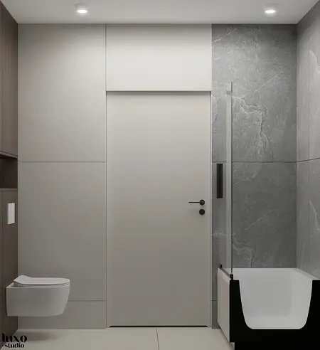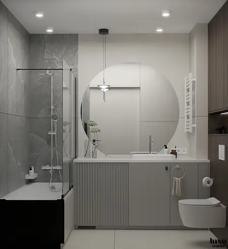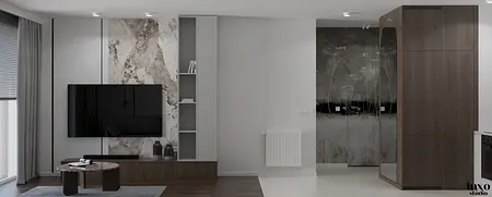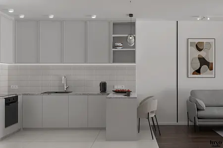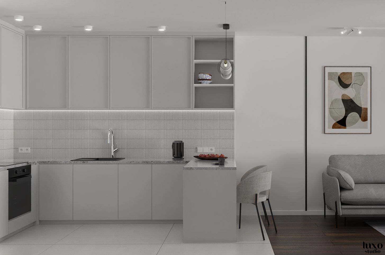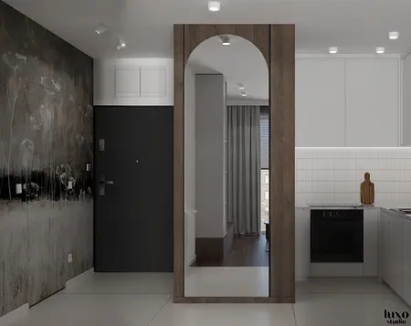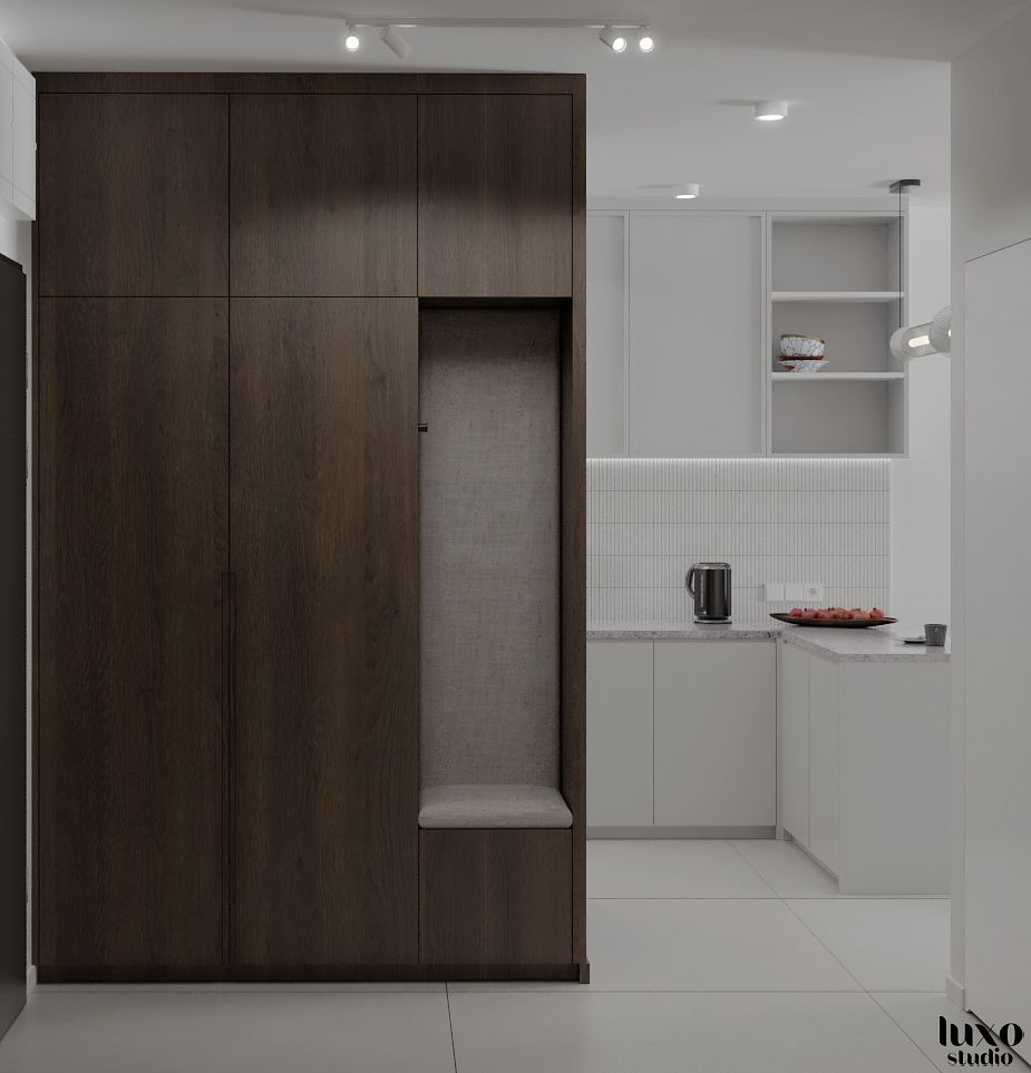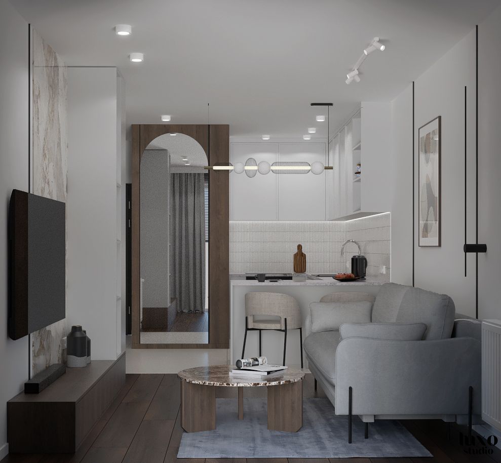 Projekt wnętrza o powierzchni 42 m² został przygotowany z wyjątkową dbałością o każdy detal, tak aby w pełni odpowiadał oczekiwaniom Inwestora. Całość utrzymana jest w konsekwentnej kolorystyce – bieli, szarości oraz ciemnego drewna – co nadaje przestrzeni harmonijny i ponadczasowy charakter.