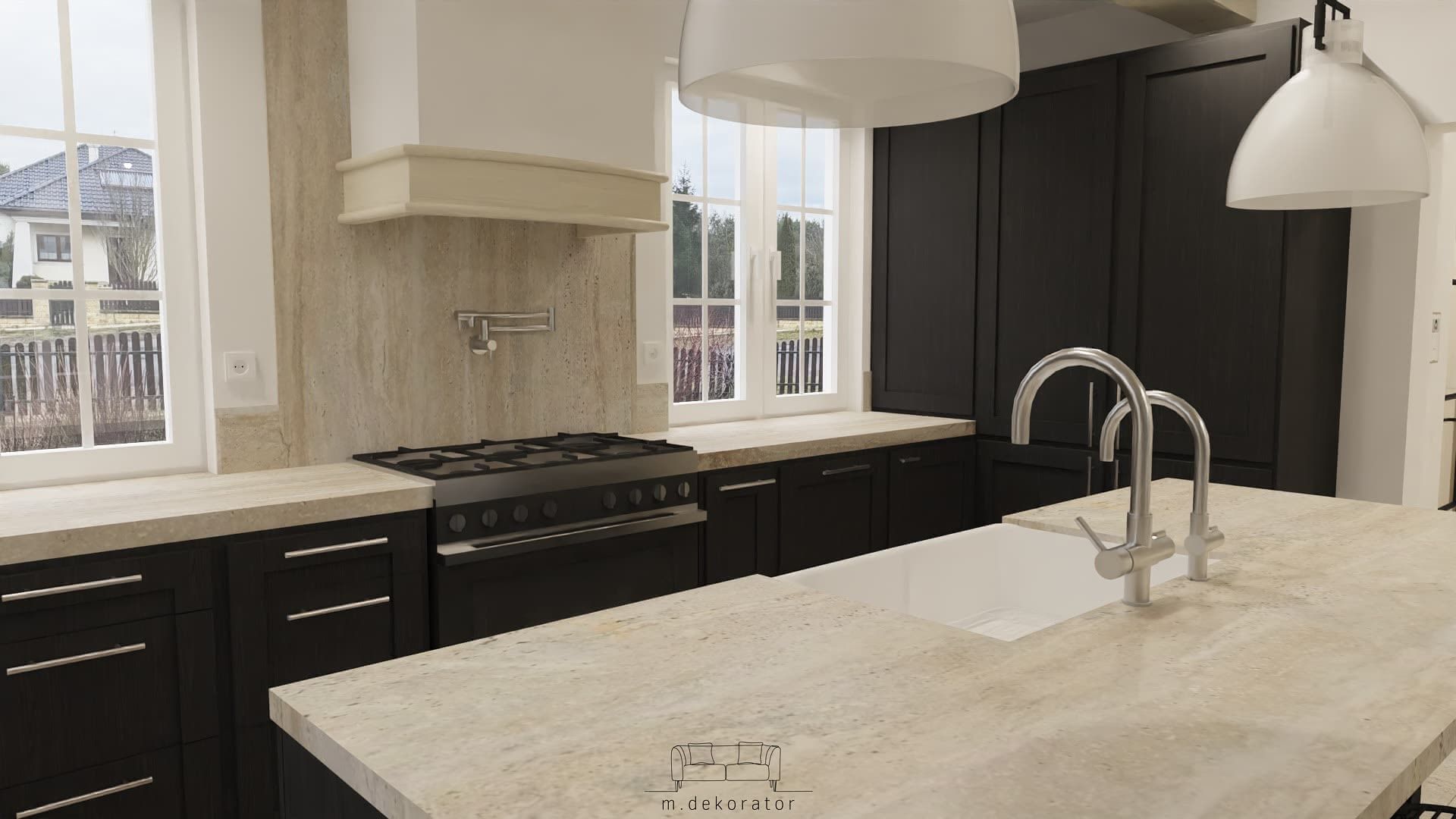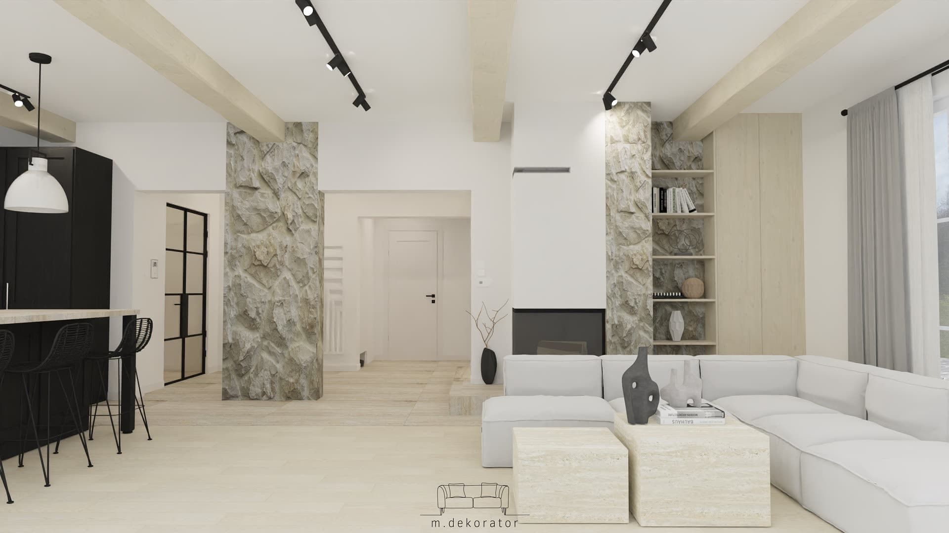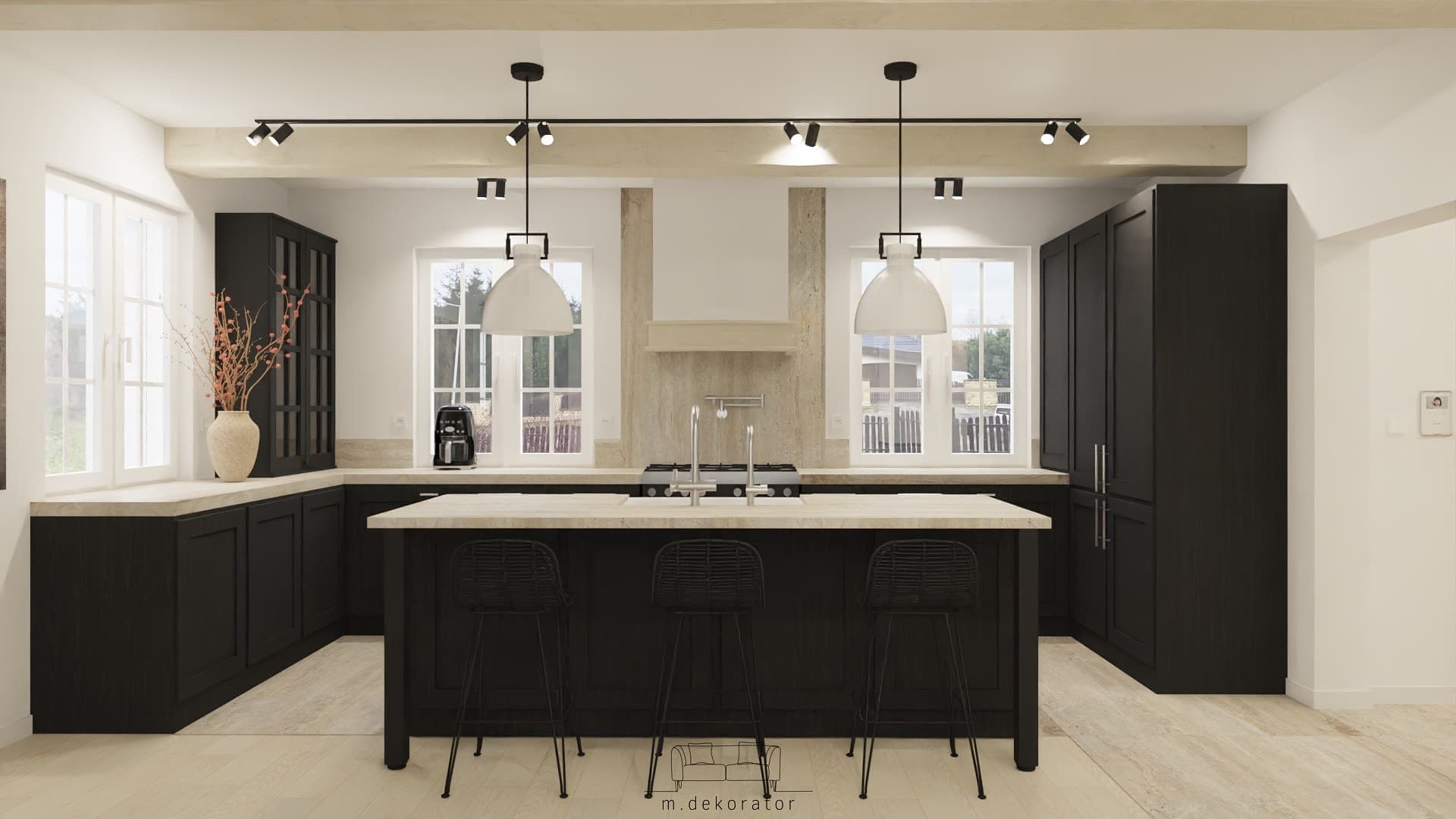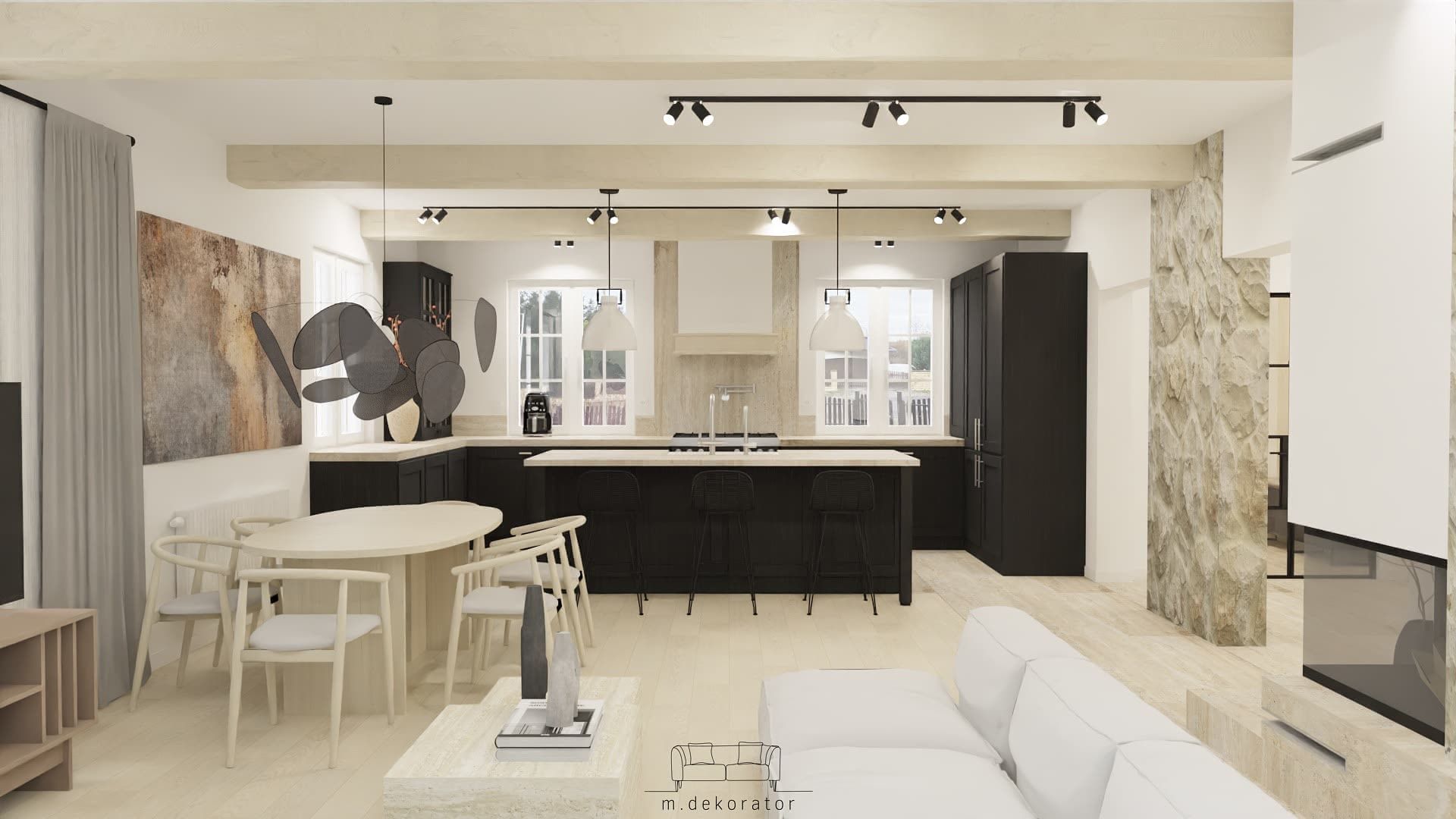 Wnętrze minimalistycznej kuchni z szarymi meblami, nowoczesnym oświetleniem i drewnianym stołem. 14 zdjęć w projekcie Zobacz projekt