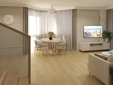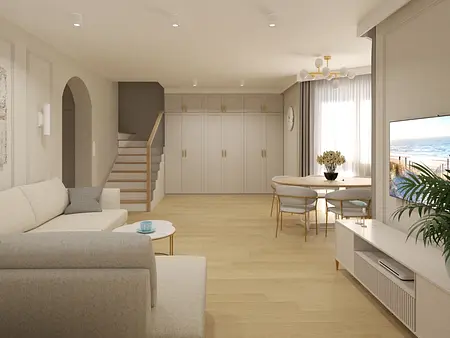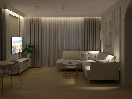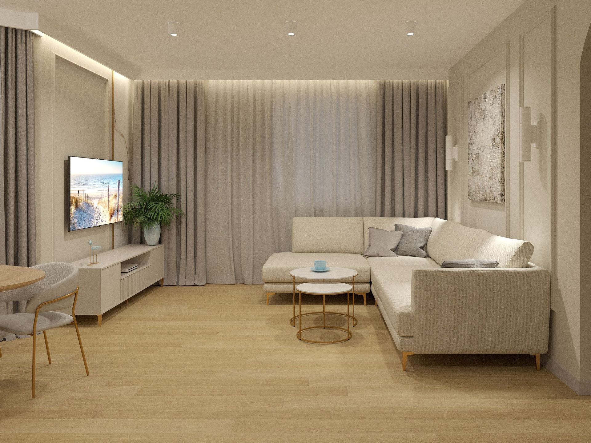Salon oparty na stylistyce "modern classic", w którym to staraliśmy się zachować balans między tradycją a nowoczesnością. Delikatna sztukateria i marmur nadają wnętrzu harmonijnego i eleganckiego wyglądu natomiast meble zaskakują lekkością form. Zastosowaliśmy tutaj jasne tony - z przewagą bieli oraz beży, które pięknie się komponują z elementami złota.