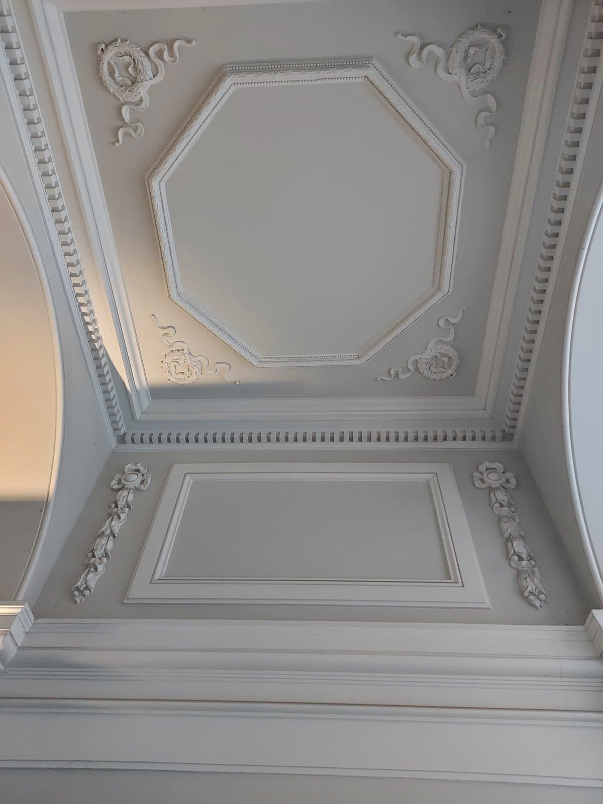 Sufit z ozdobnymi detalami i szarym tłem, eleganckie wykończenie. 21 zdjęć w projekcie Zobacz projekt