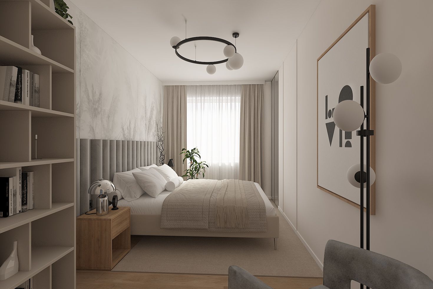 Wnętrze minimalistycznego pokoju z drewnianymi meblami i jasnymi zasłonami. 4 zdjęć w projekcie Zobacz projekt