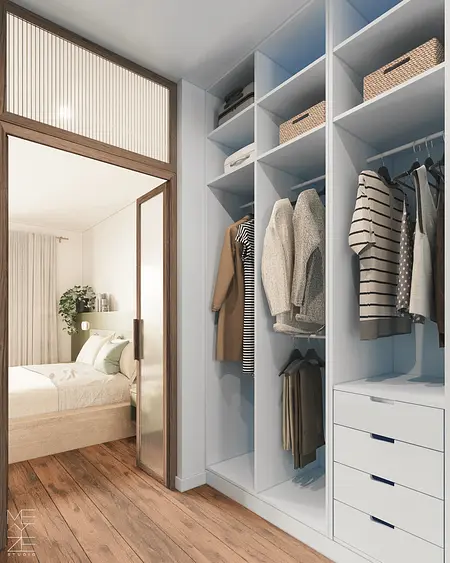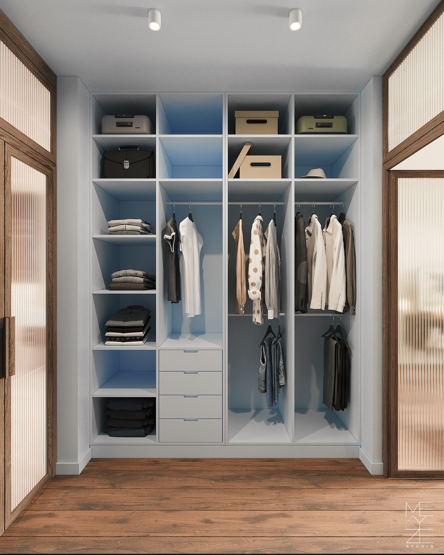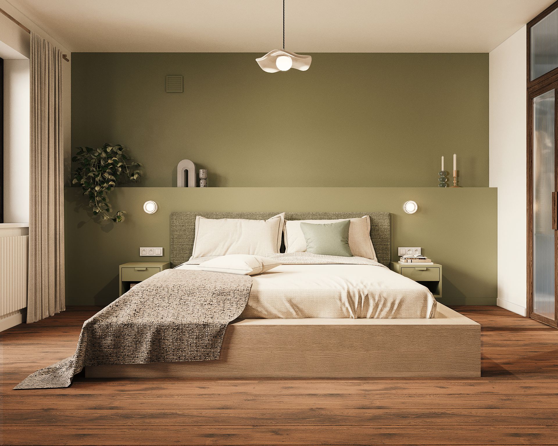 Wnętrze sypialni z eklektycznym i nowoczesnym stylem, z niebieską ścianą i białymi meblami. 7 zdjęć w projekcie Zobacz projekt