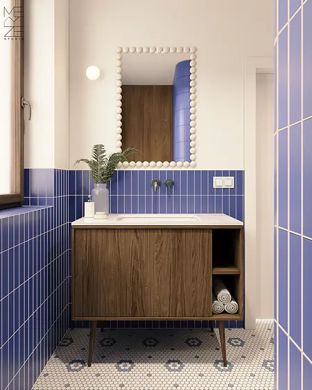 Wnętrze recepcji z niebieskimi ścianami i drewnianym blatem, styl dopamine decor, eklektyczny, nowoczesny. 16 zdjęć w projekcie Zobacz projekt