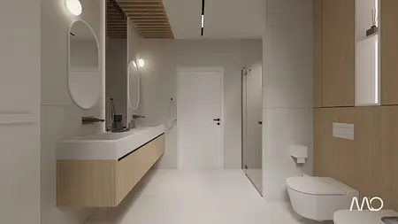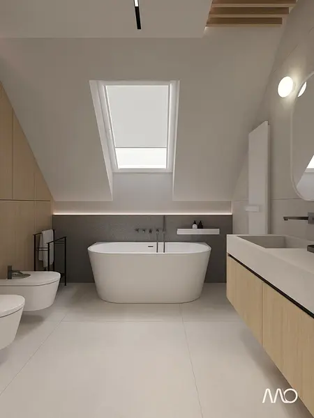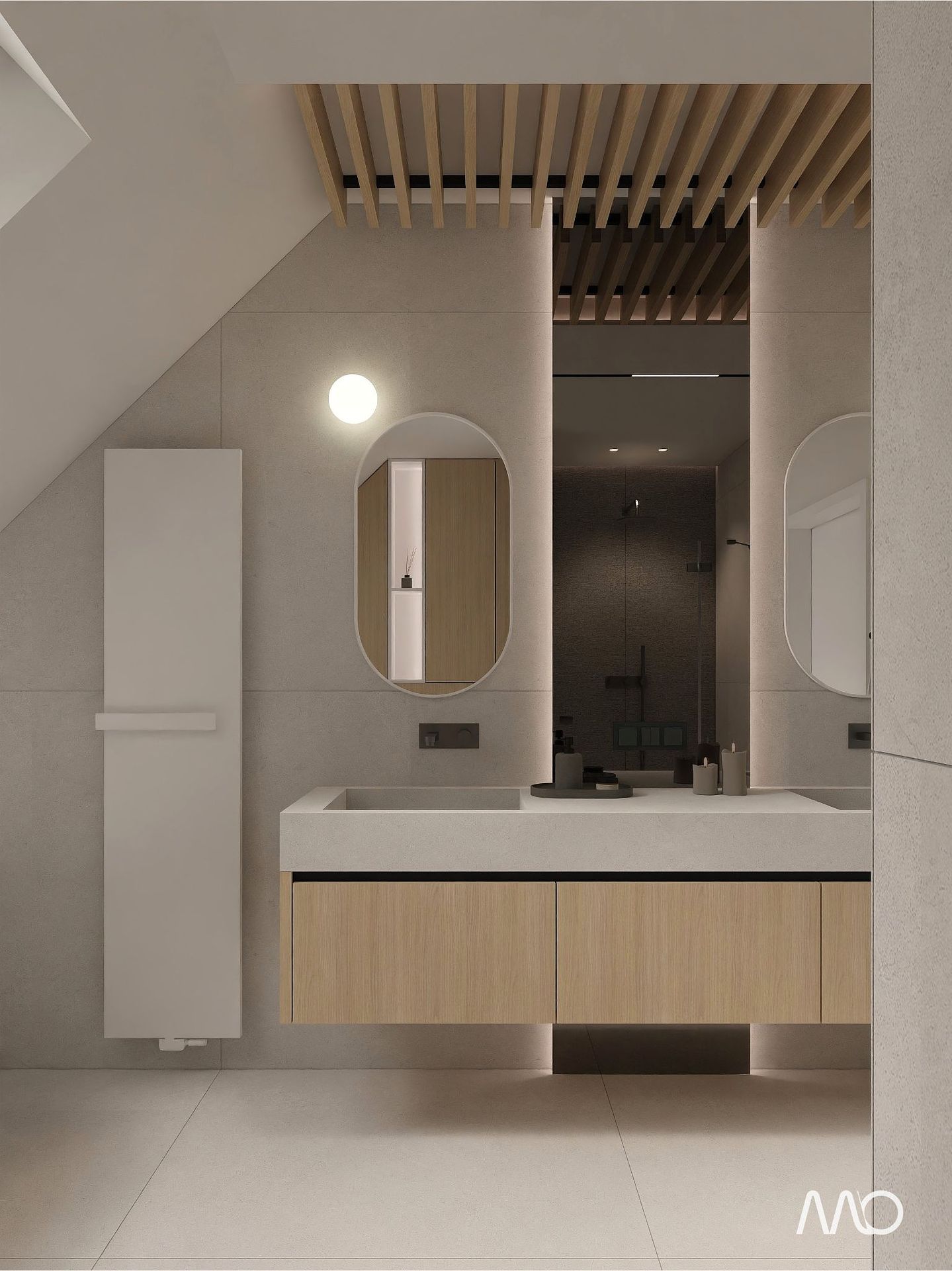 Wykończenie powierzchni w naturalnych odcieniach, miękkie linie ceramiki i klimatyczne oświetlenie tworzą atmosferę domowego spa.