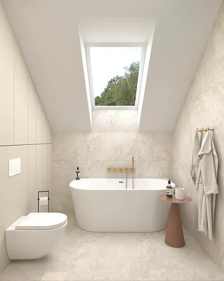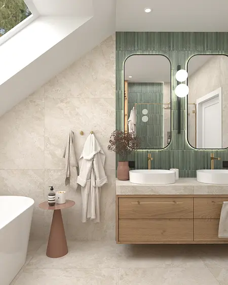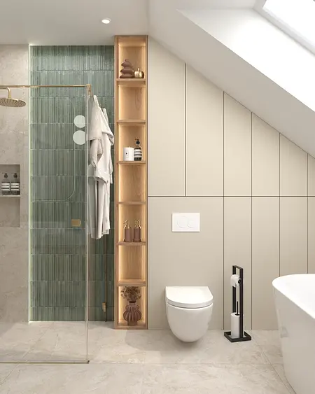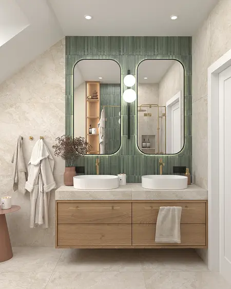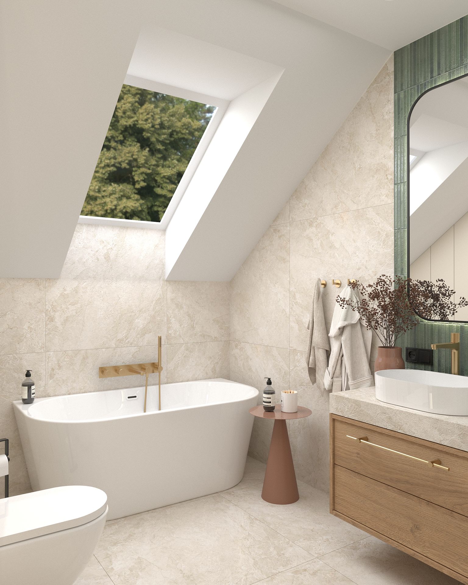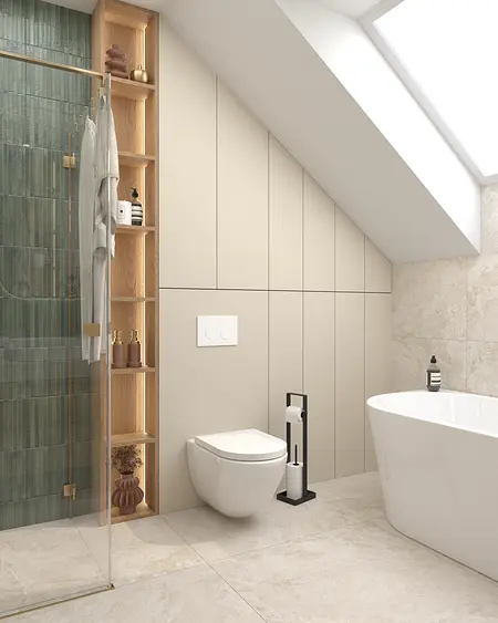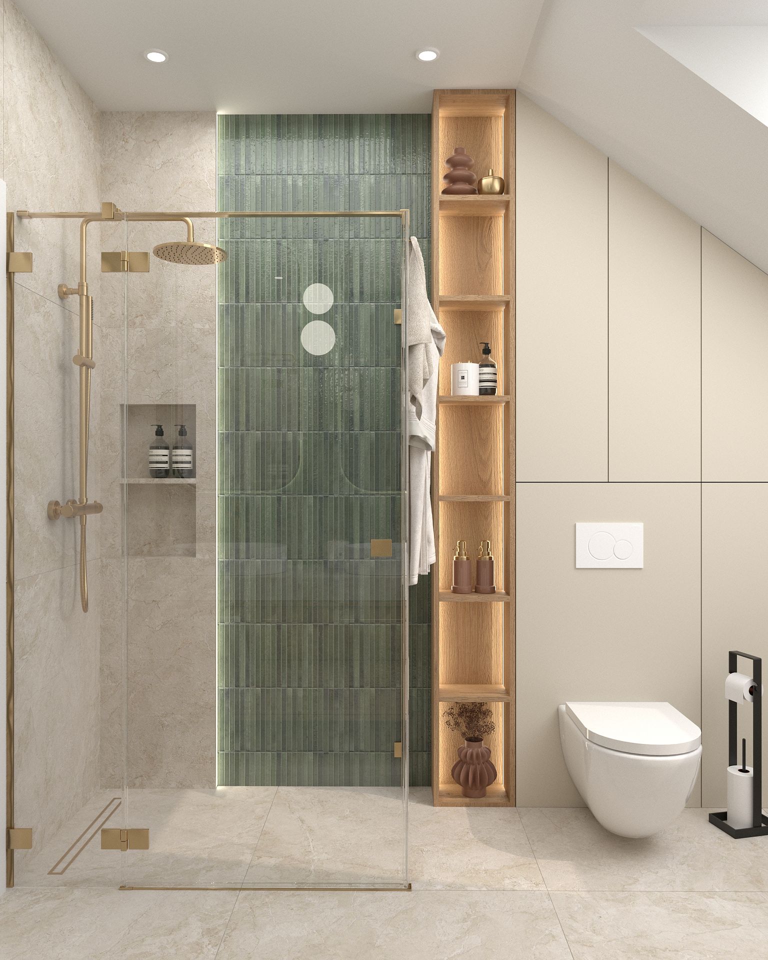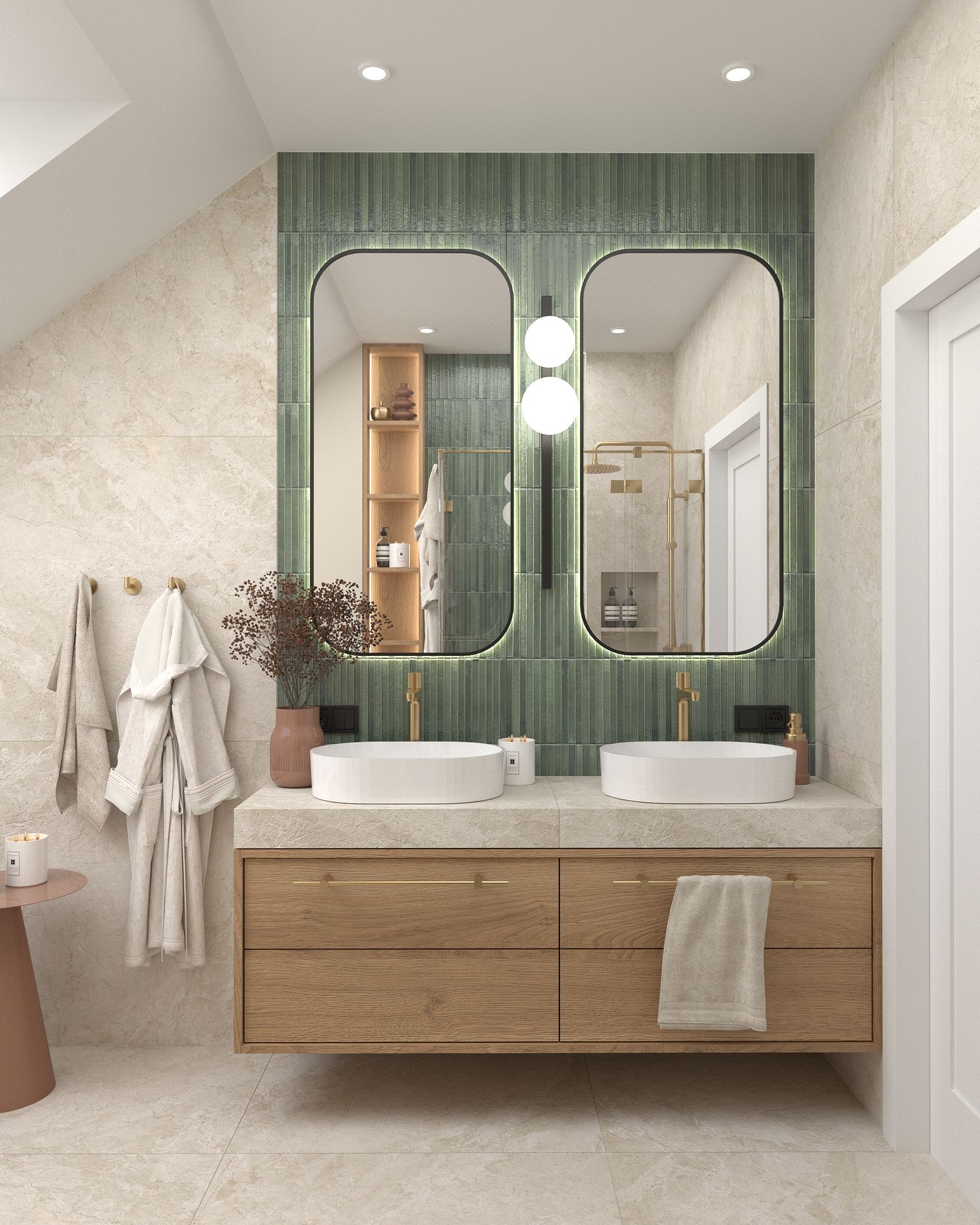 Klienci marzyli o wnętrzu utrzymanym w neutralnej, spokojnej palecie barw, przełamanej akcentami w odcieniach zieleni, które dodają całości świeżości. Jednym z głównych założeń projektu było połączenie komfortu z funkcjonalnością — dlatego zależało nam, aby w tej przestrzeni znalazło się zarówno miejsce na obszerny prysznic, jak i wygodną wannę. Dzięki starannemu rozplanowaniu układu udało się stworzyć łazienkę, która łączy praktyczne rozwiązania z harmonijną estetyką.