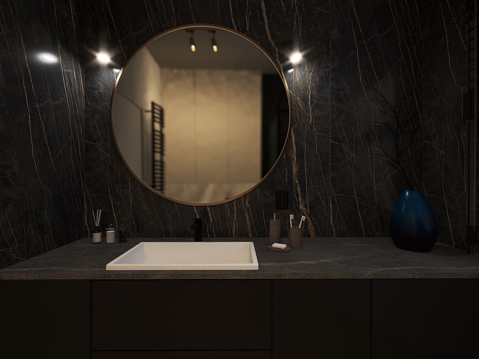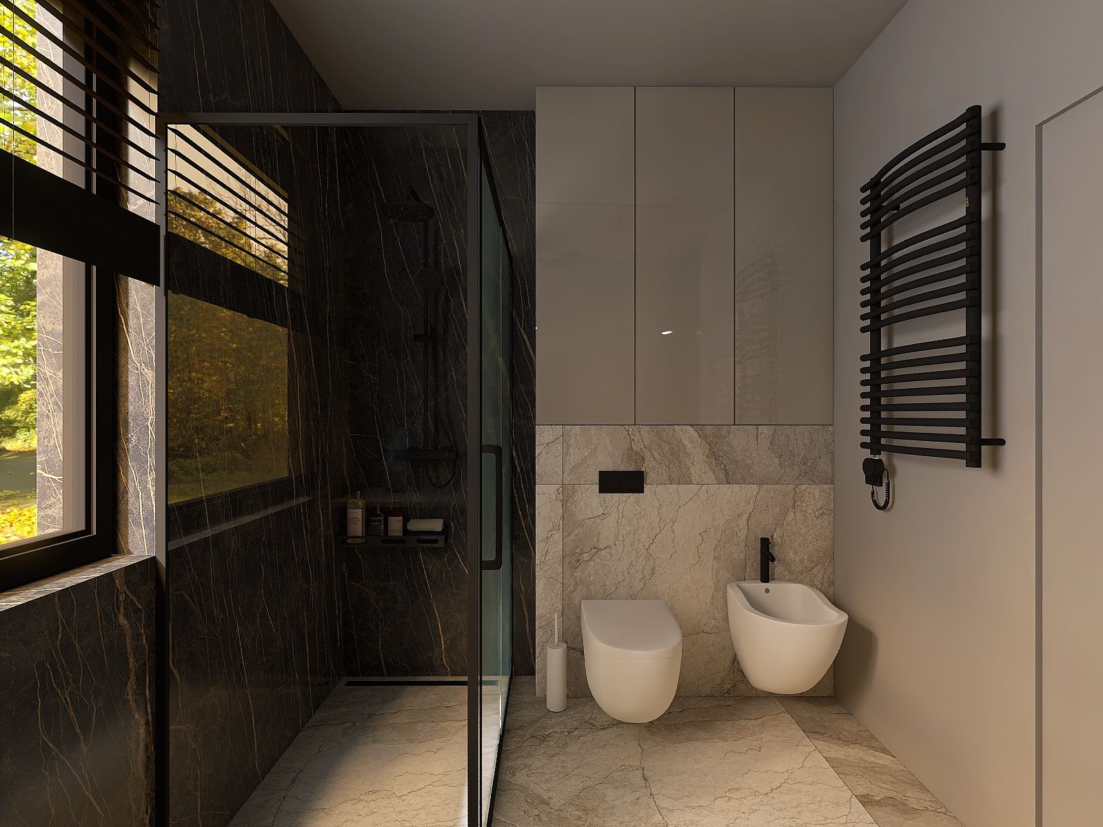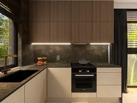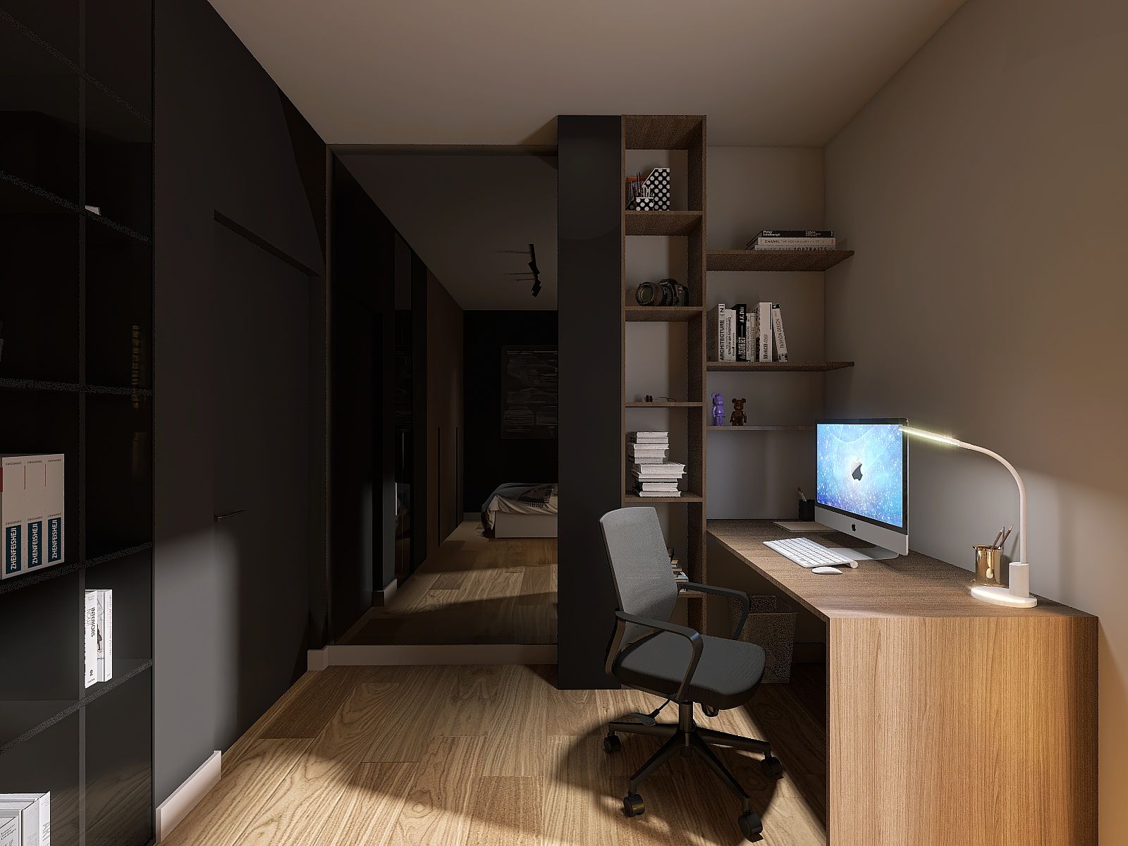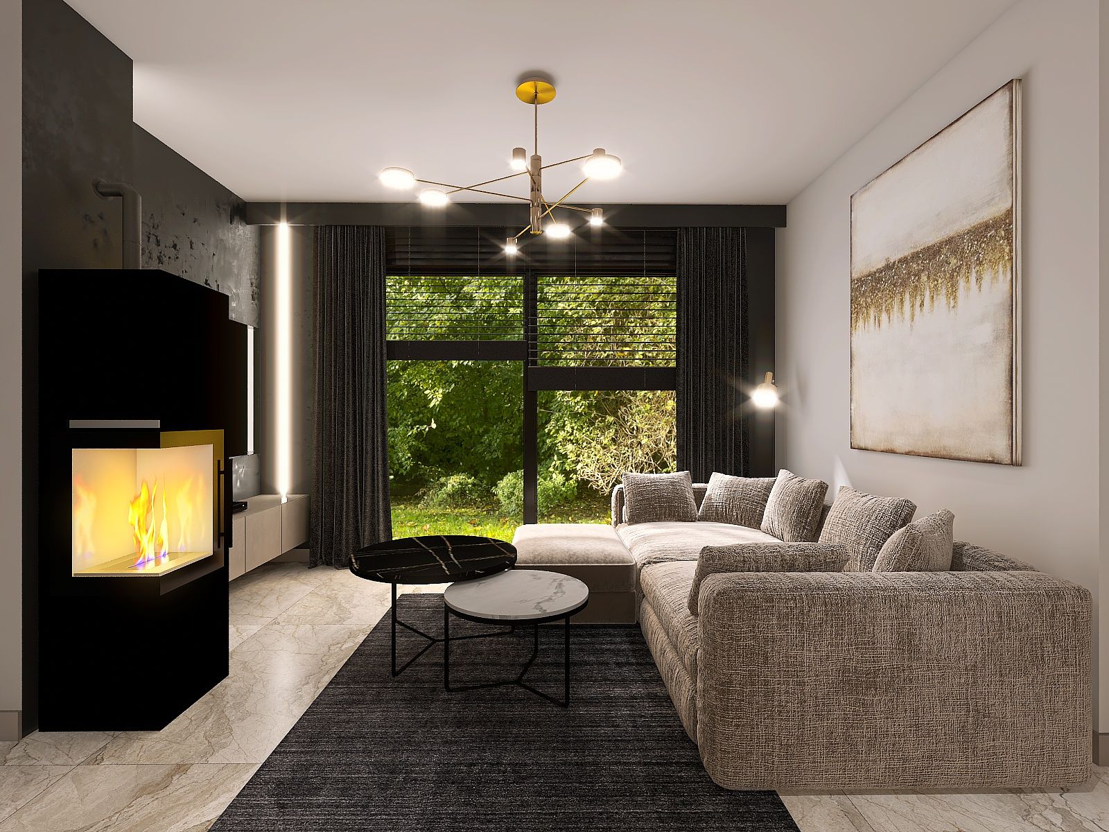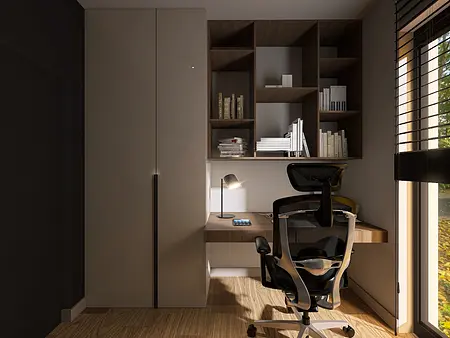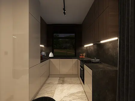 Projekt utrzymany w ciemnych odcieniach beżu, brązów, drewna i czerni dla taty i jego syna, uwzględniający potrzeby aktualnego stylu życia.