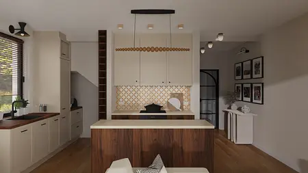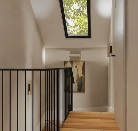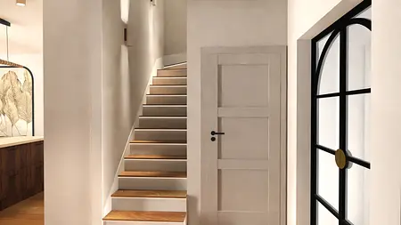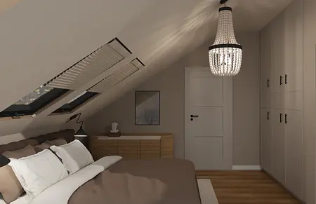 Projekt połowy bliźniaka dla rodziny 2+2. Założenia projektowe: ciepłe, przytulne, zapewniające możliwość wypoczynku pomieszczenia dla rodziny.
