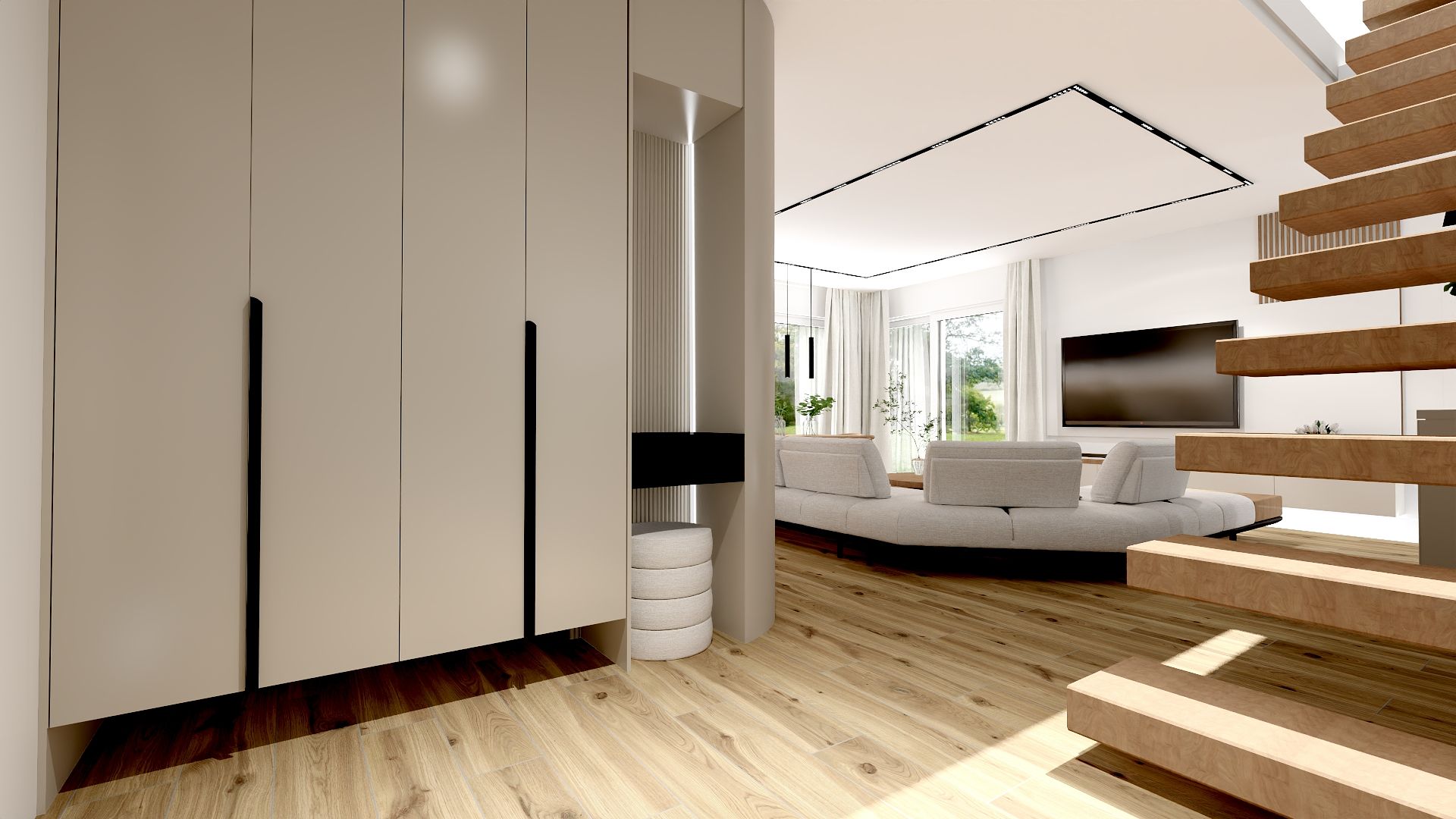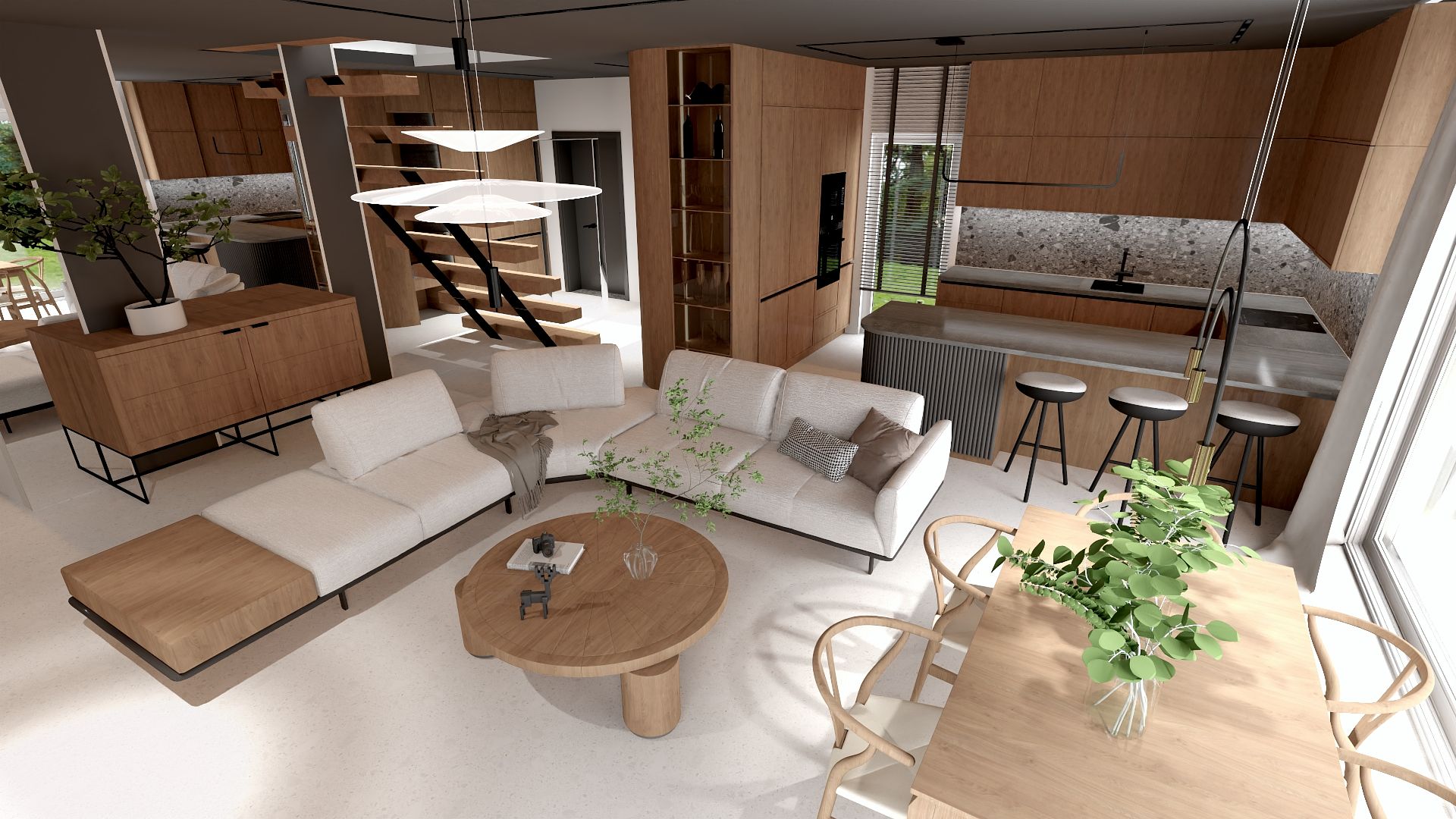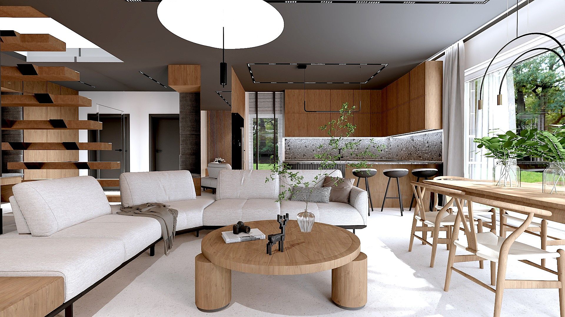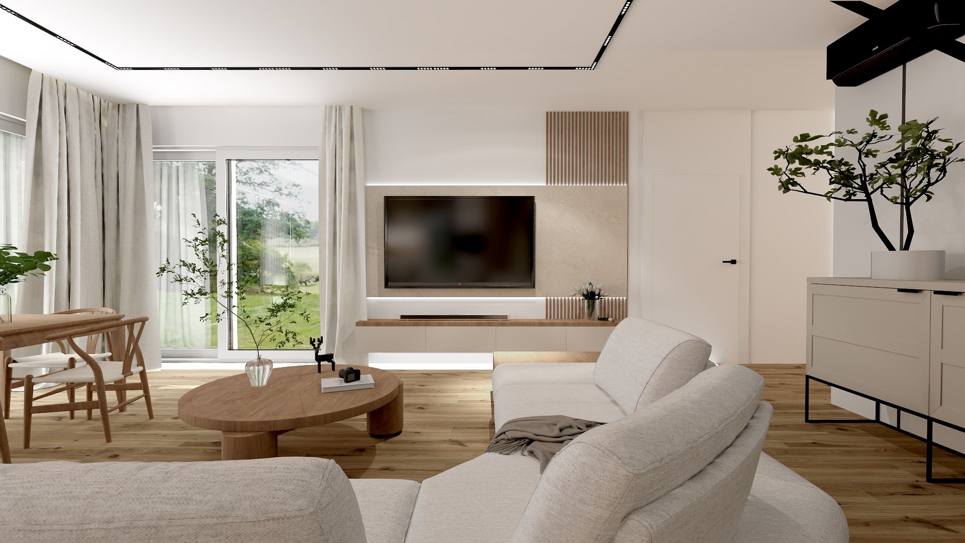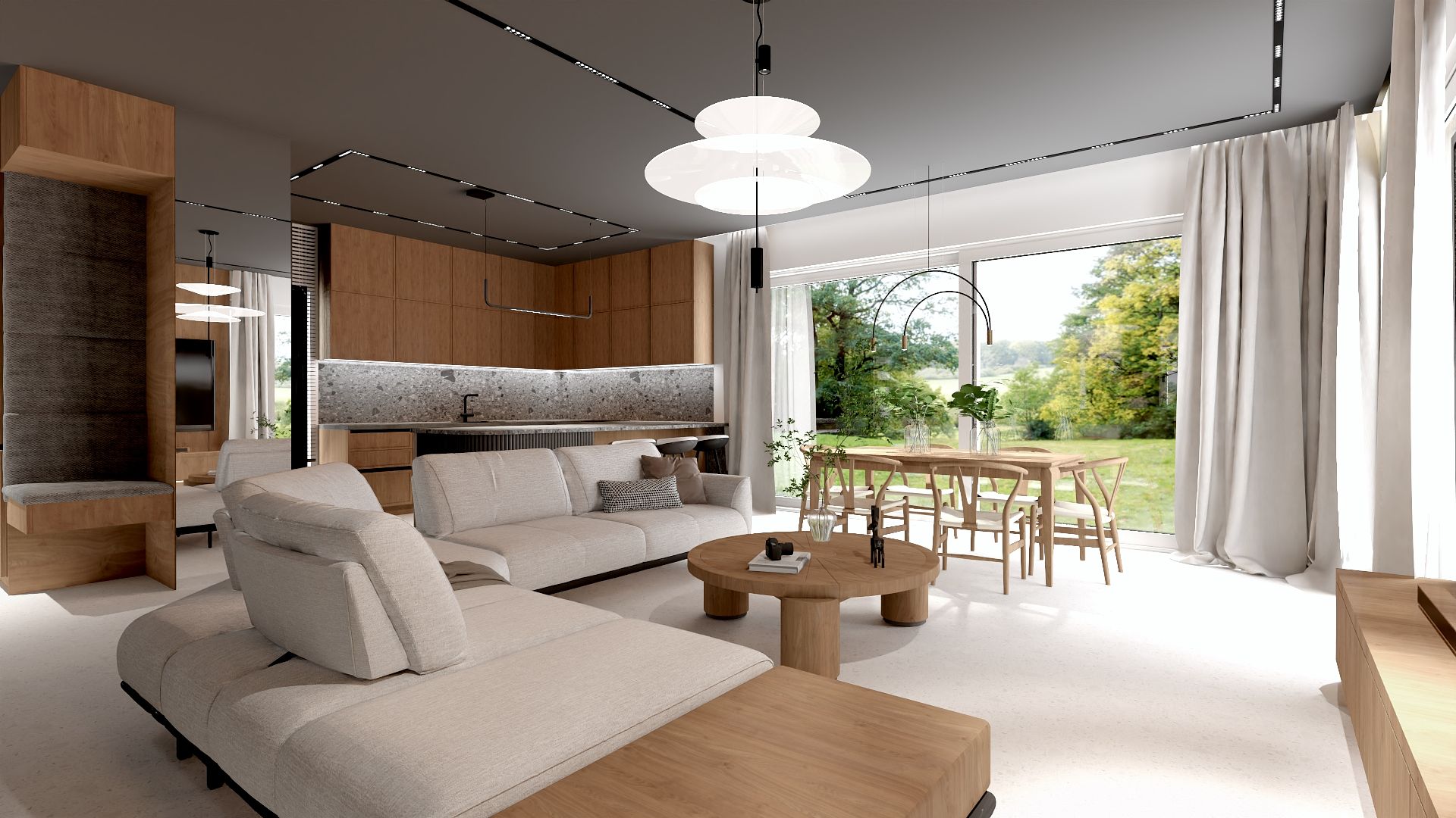 Projekt łączy nowoczesny minimalizm z przytulnym, naturalnym charakterem. Otwarta przestrzeń salonu, kuchni i jadalni tworzy spójną całość, w której dominują jasne barwy, drewno dębowe i subtelne czarne akcenty.