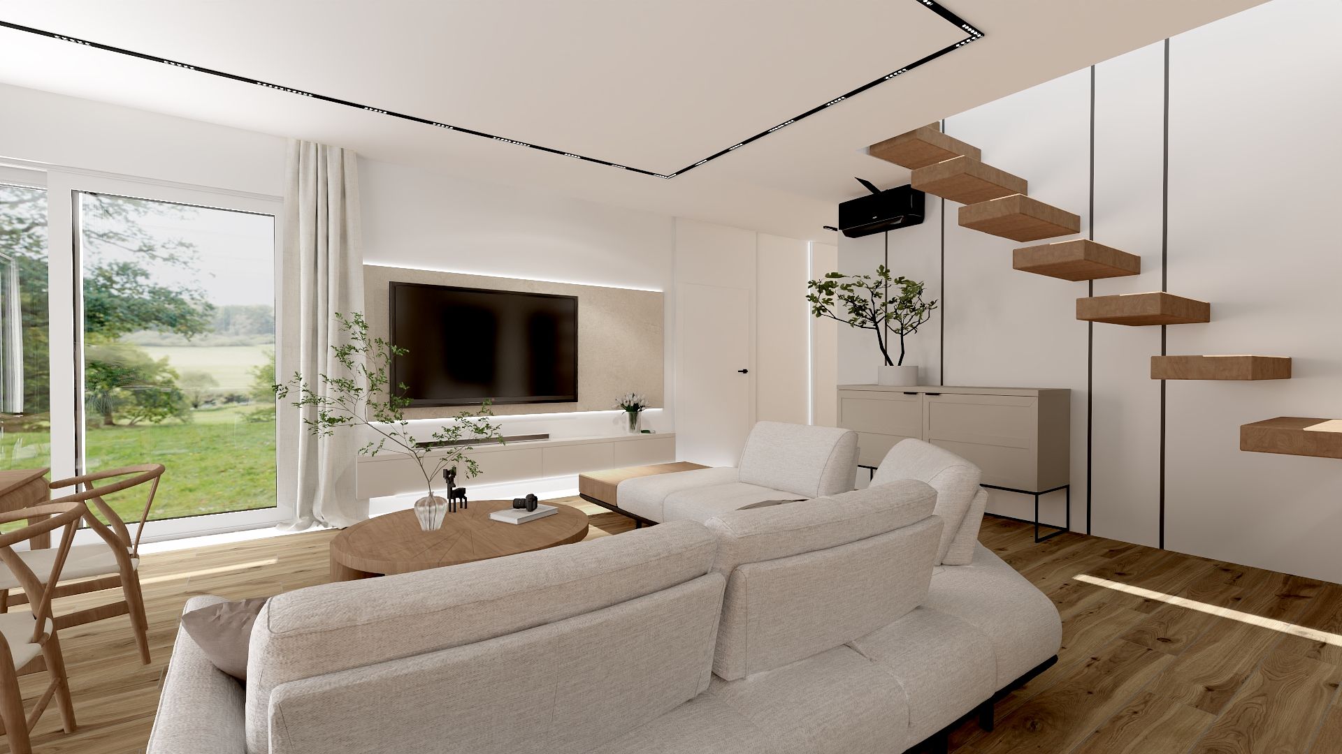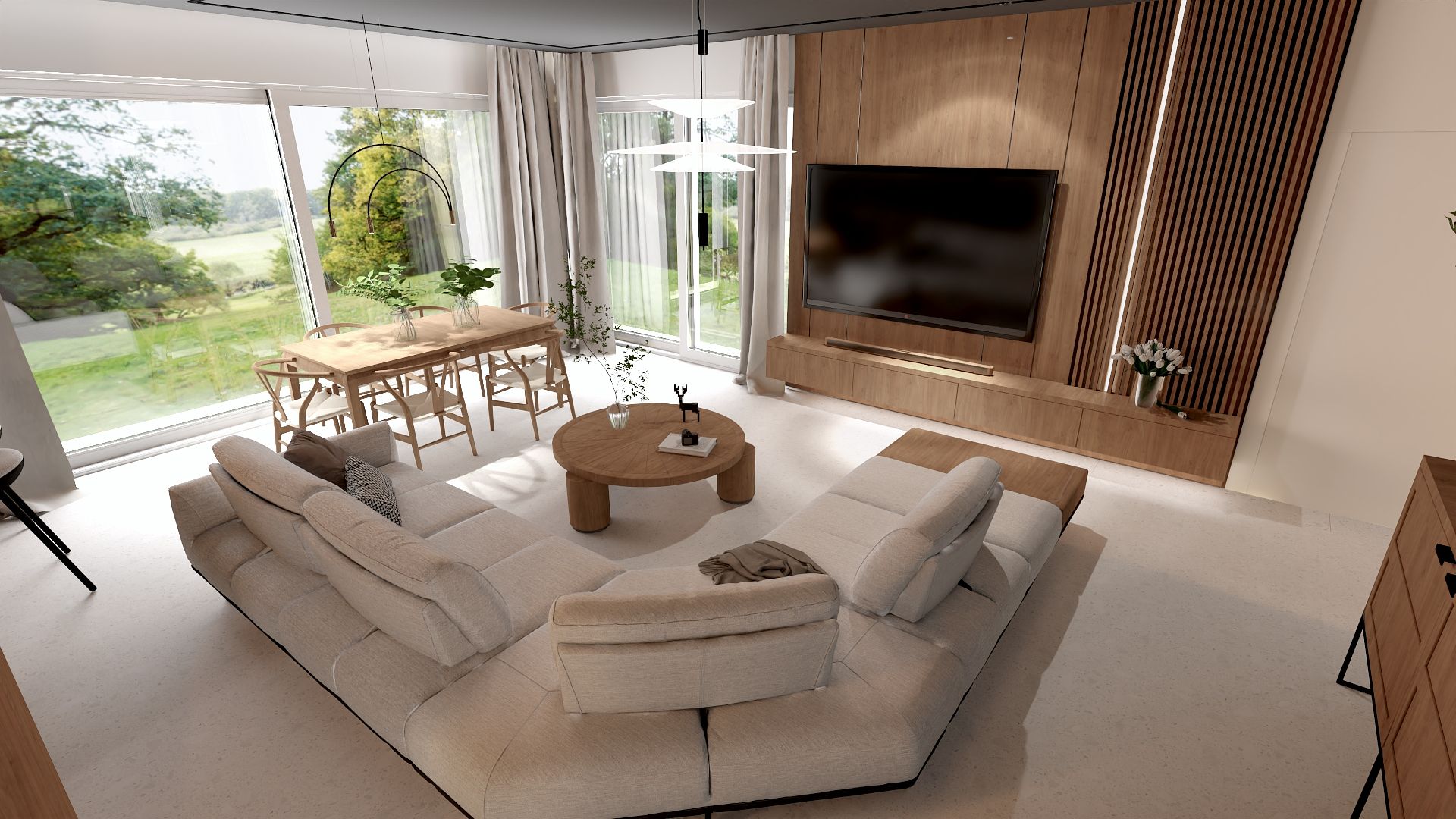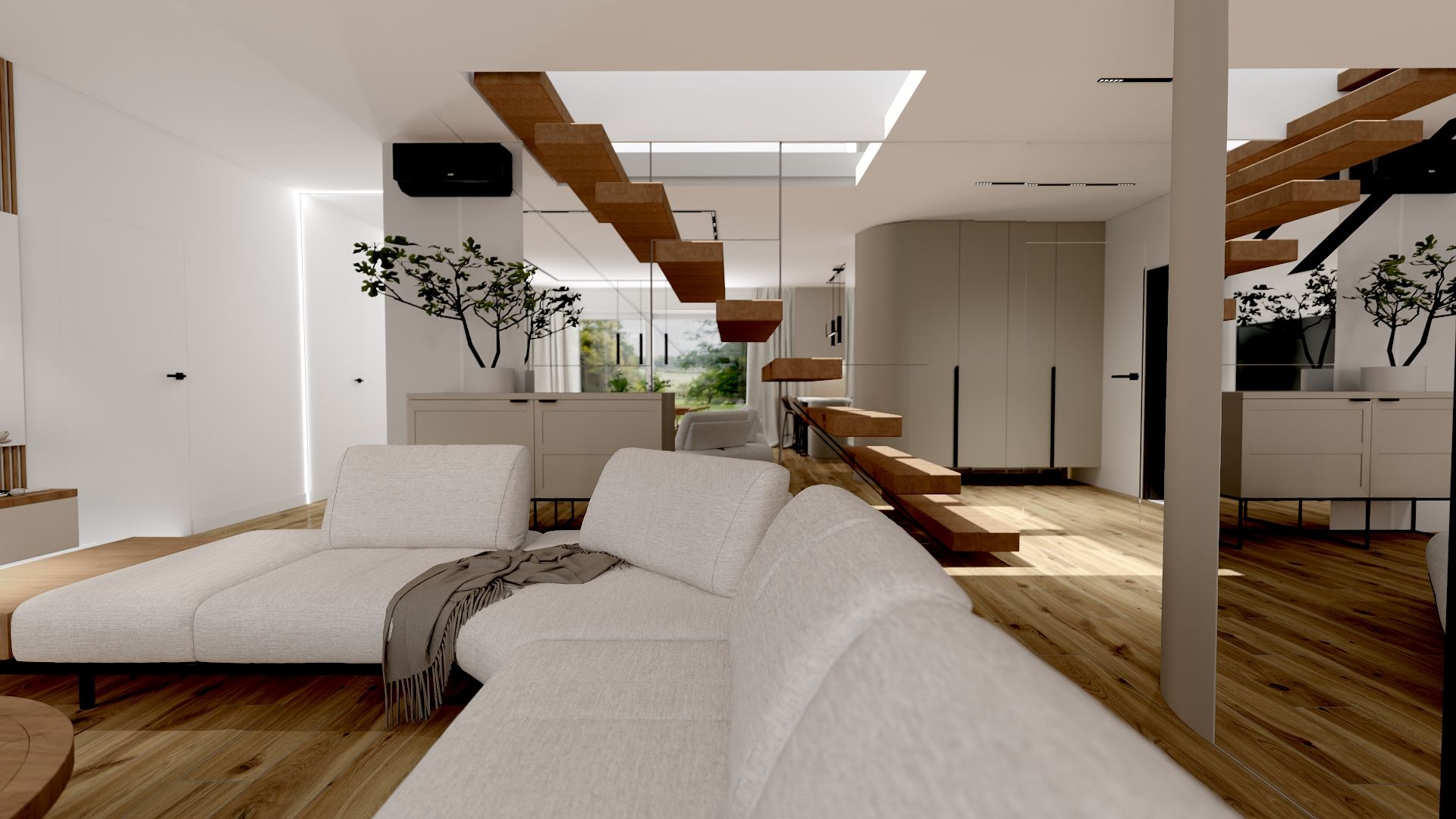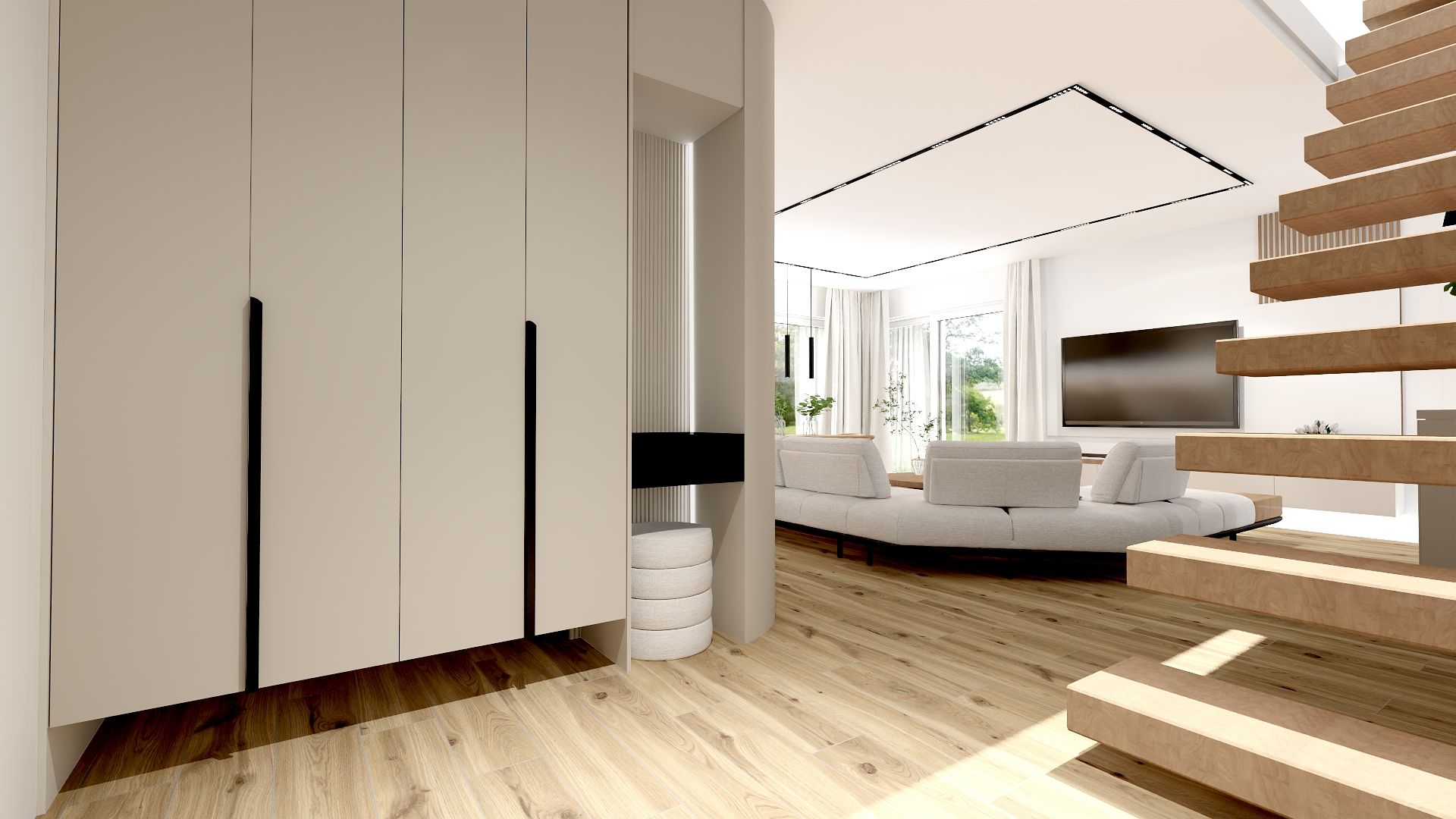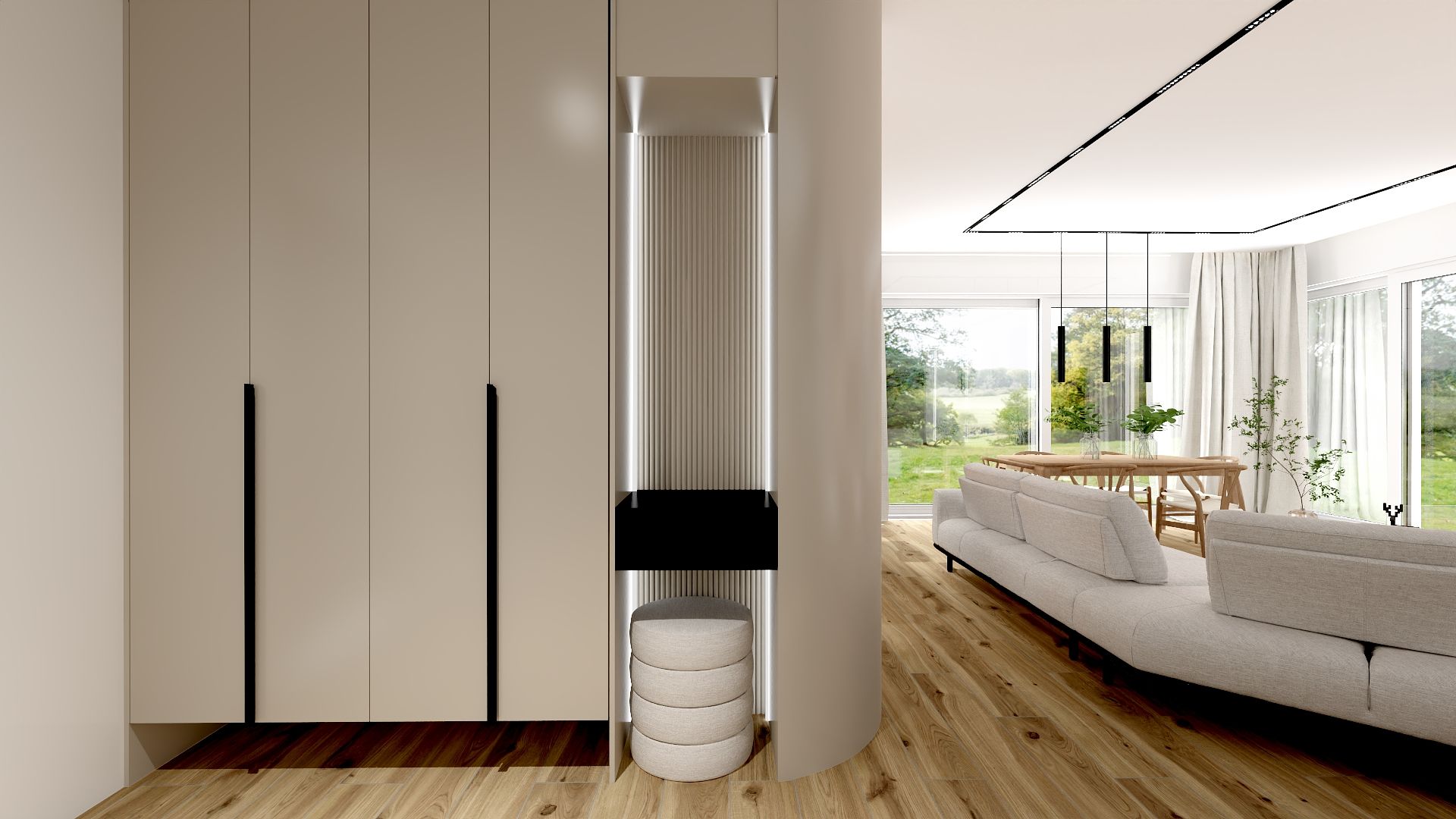 Projekt łączy nowoczesny minimalizm z przytulnym, naturalnym charakterem. Otwarta przestrzeń salonu, kuchni i jadalni tworzy spójną całość, w której dominują jasne barwy, drewno dębowe i subtelne czarne akcenty.