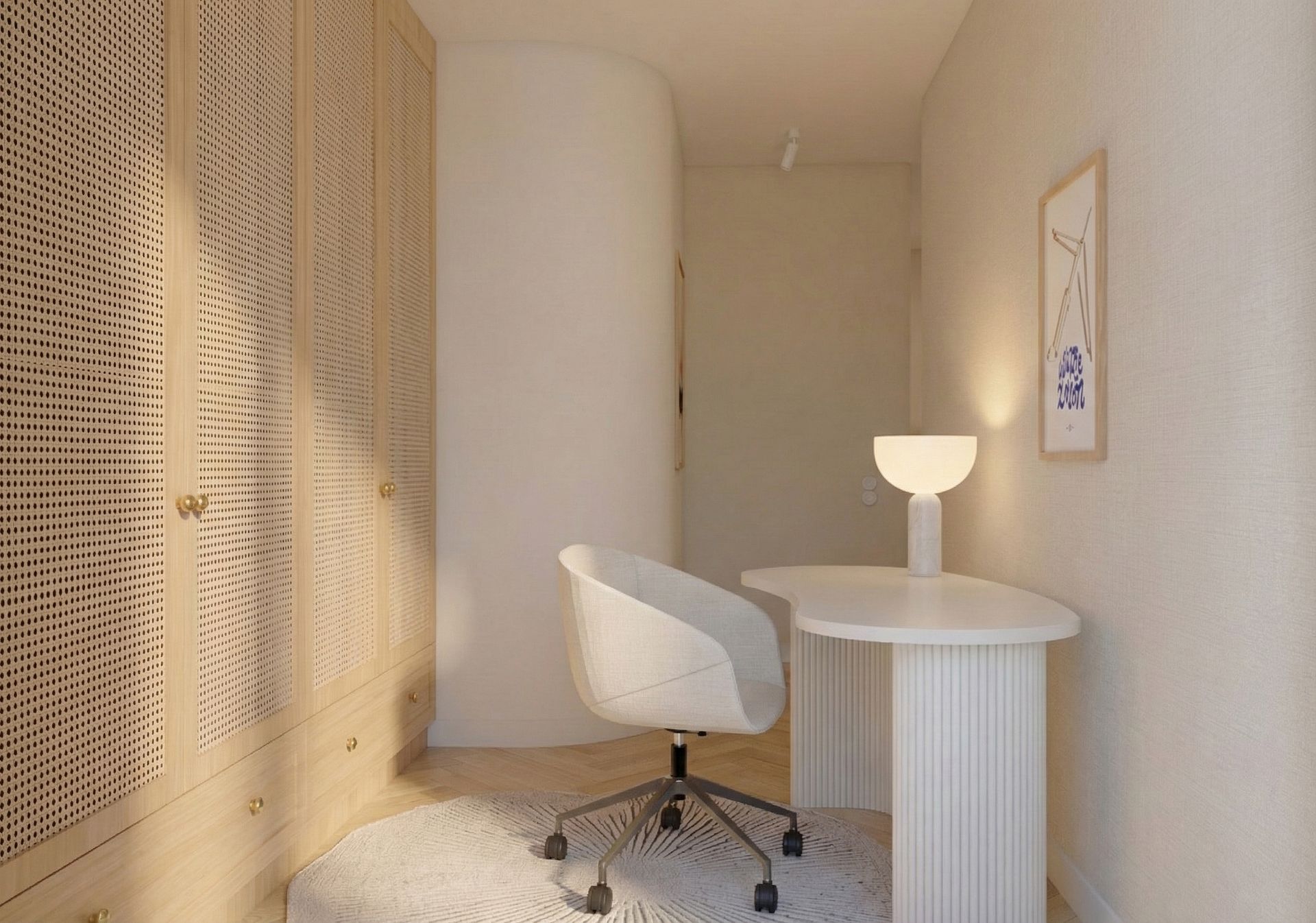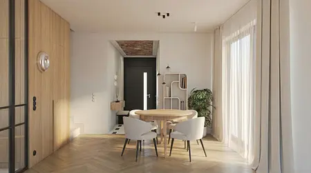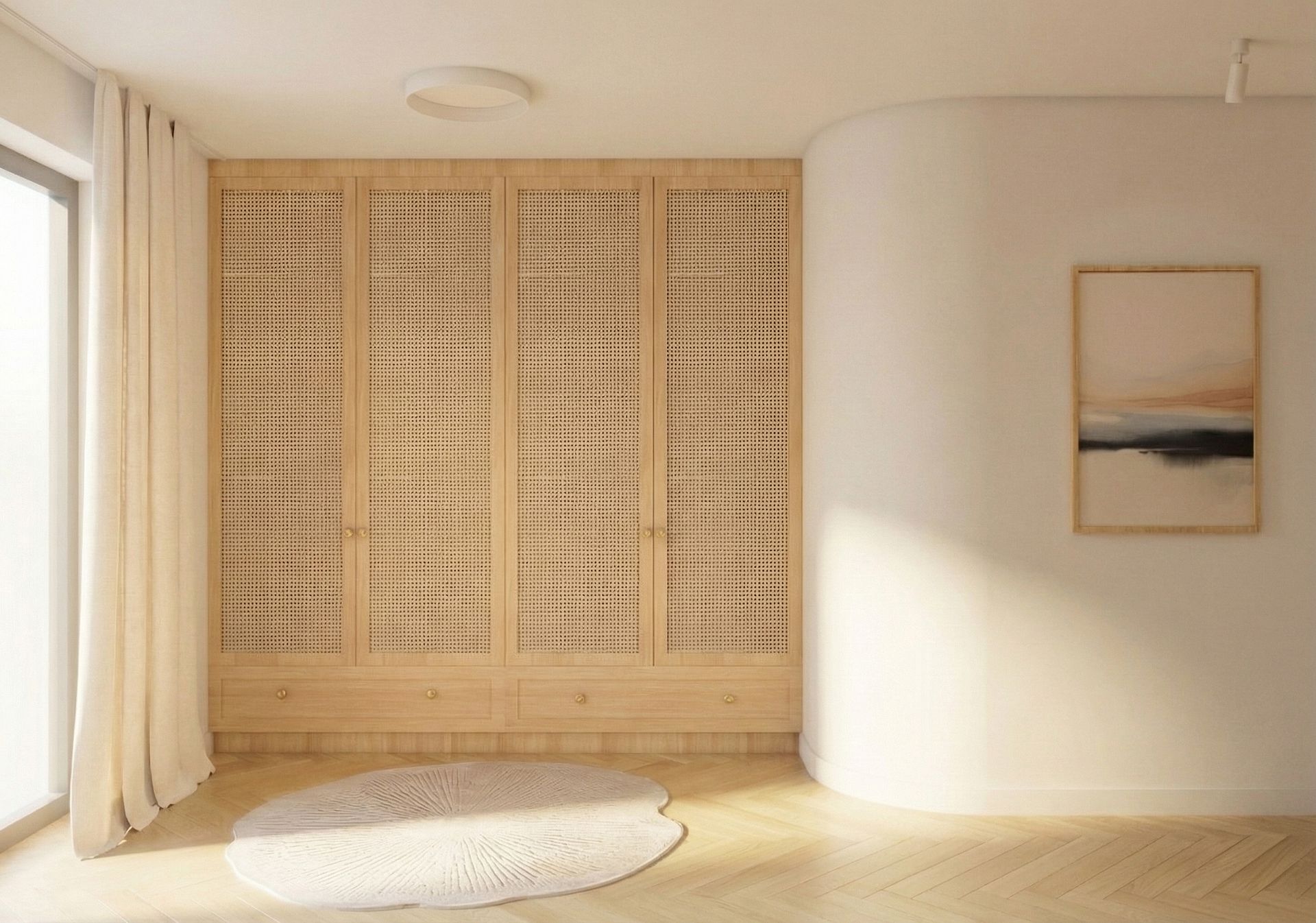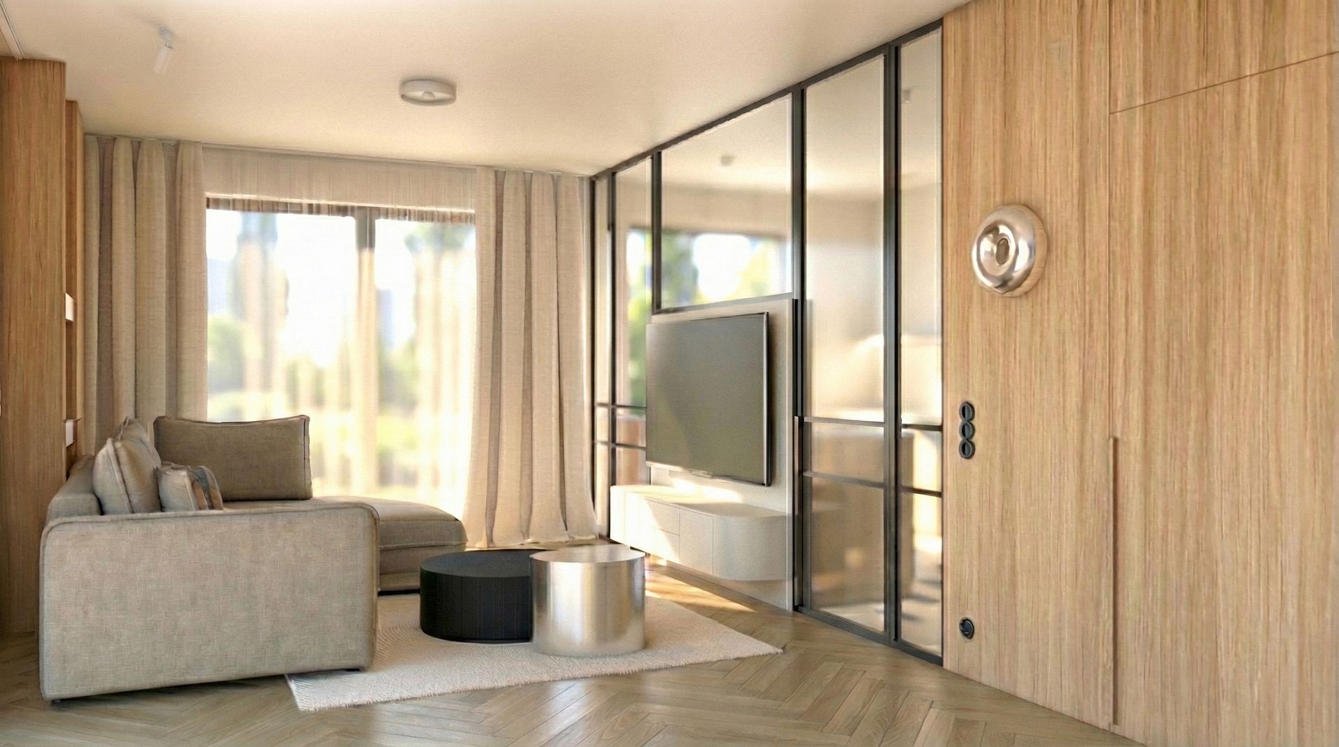 Przestrzeń, w której funkcja harmonizuje z estetyką. Geometryczne linie przeszklonych ścian kontrastują z miękkimi łukami zabudowy meblowej i ratanem. Podłoga w jodełkę i stonowana paleta barw tworzą spójną, spokojną kompozycję. Wnętrze, w którym minimalizm spotyka rzeźbiarskie detale.