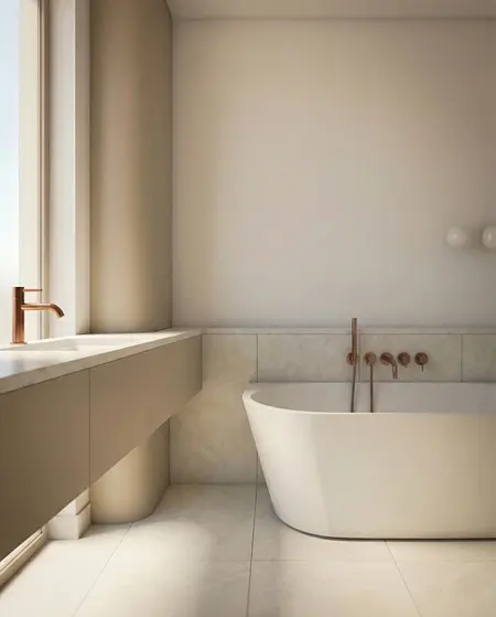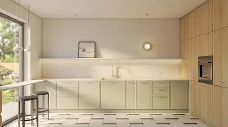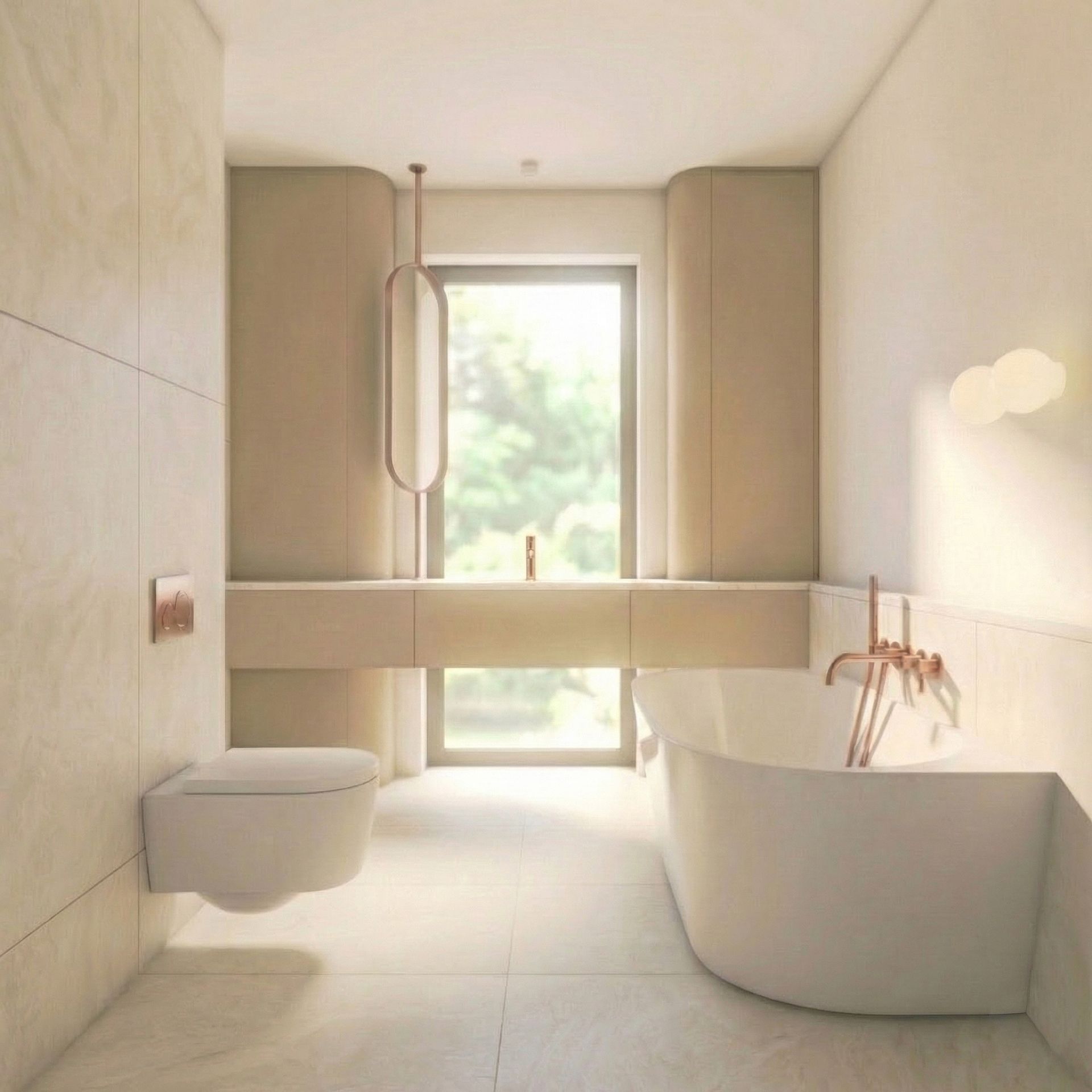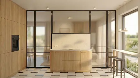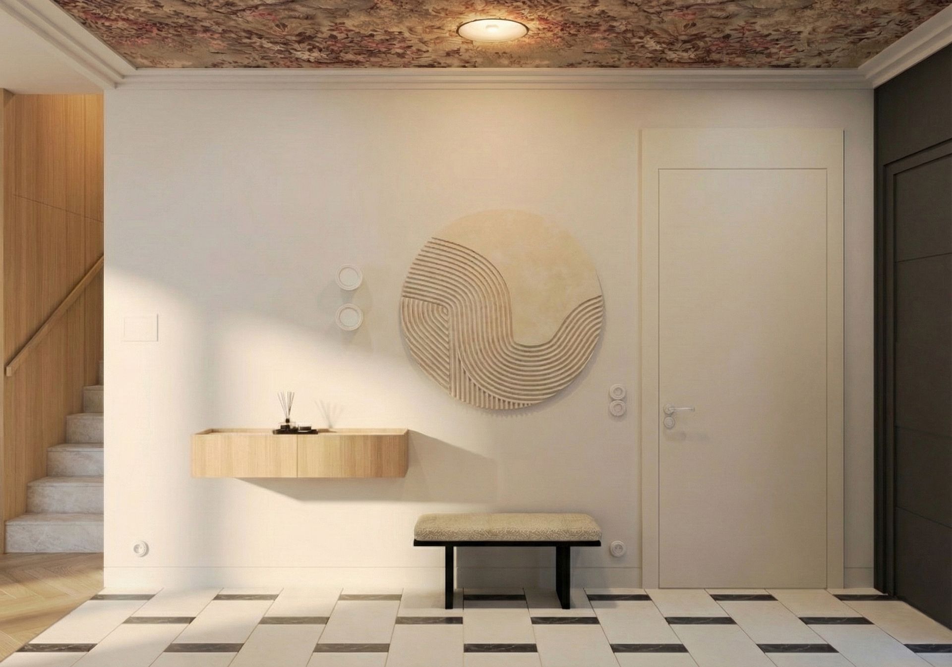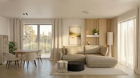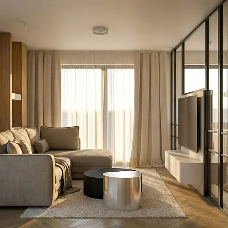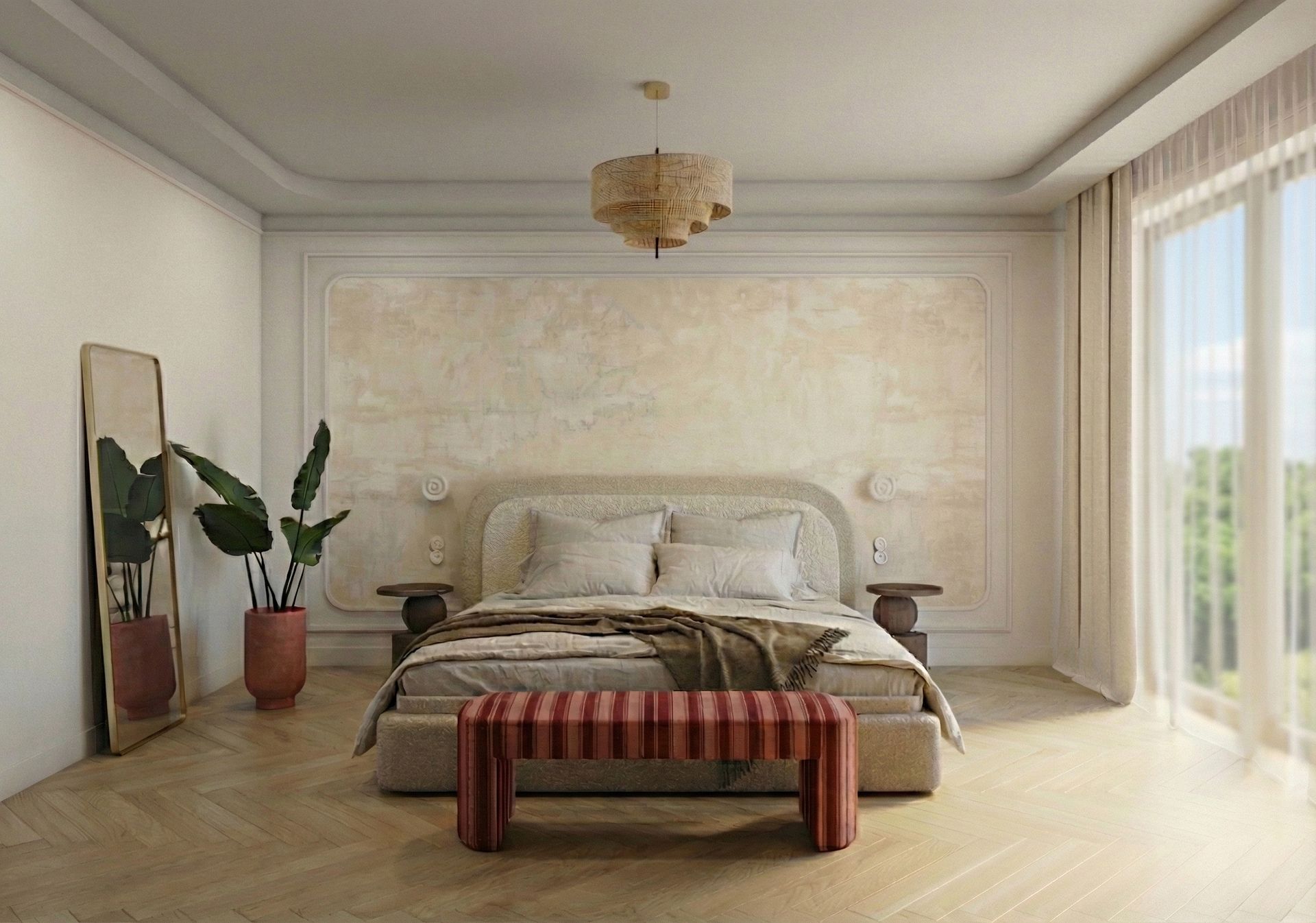 Przestrzeń, w której funkcja harmonizuje z estetyką. Geometryczne linie przeszklonych ścian kontrastują z miękkimi łukami zabudowy meblowej i ratanem. Podłoga w jodełkę i stonowana paleta barw tworzą spójną, spokojną kompozycję. Wnętrze, w którym minimalizm spotyka rzeźbiarskie detale.