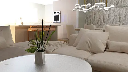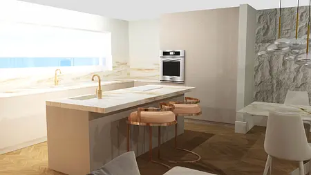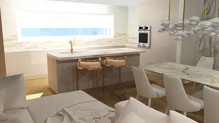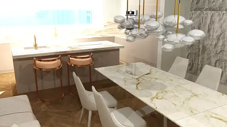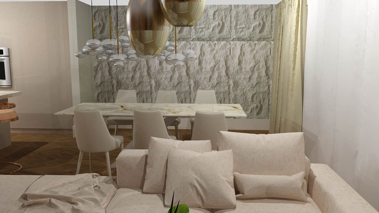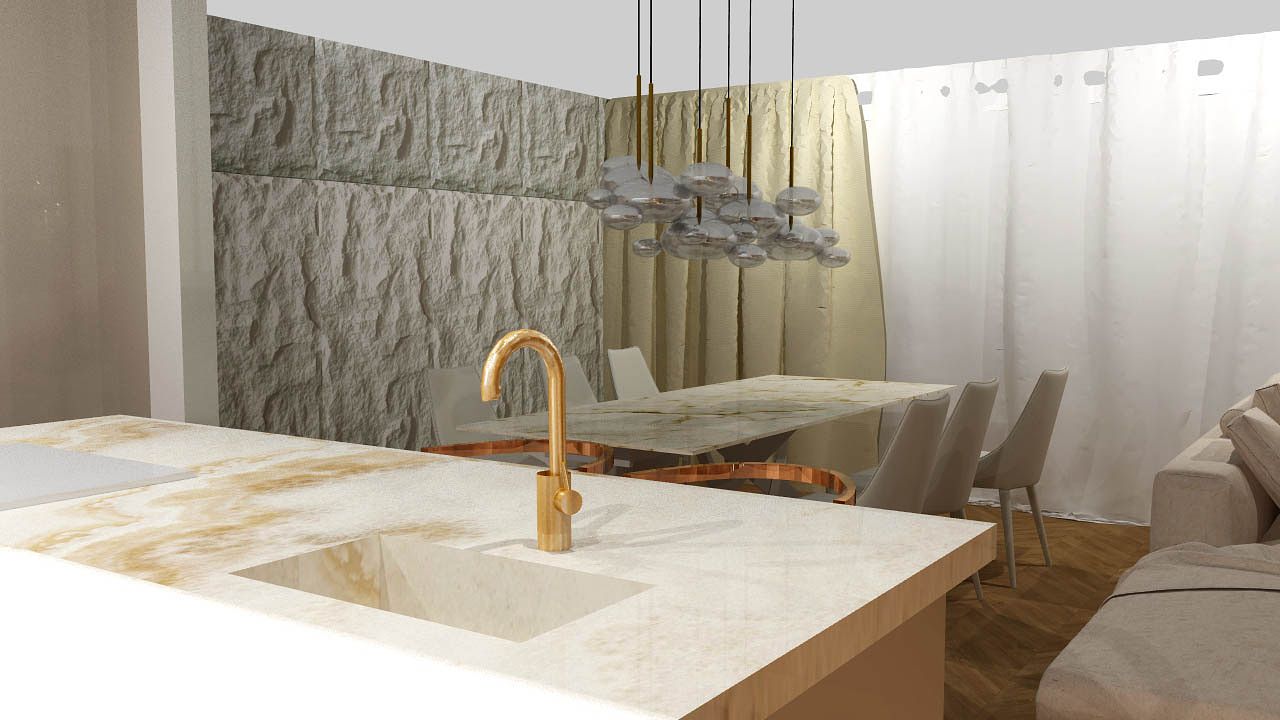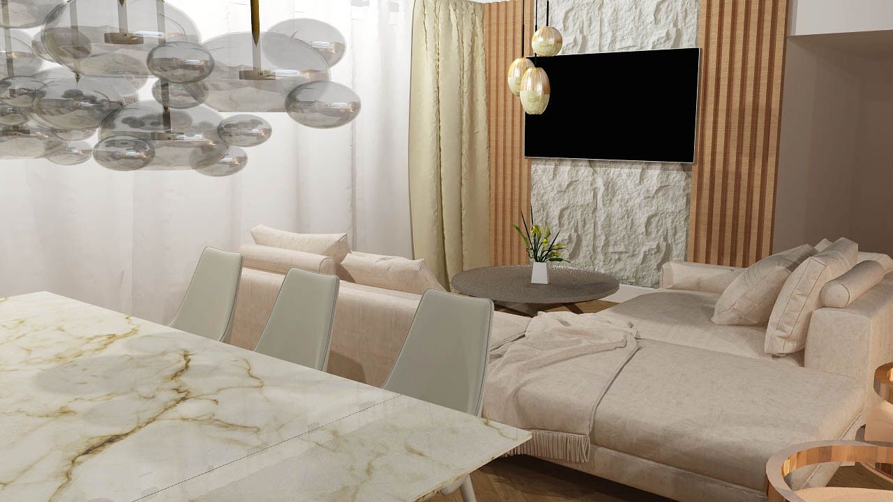 To połączenie minimalizmu z eleganckim lekkim glamur. Projekt powstał w kolorystyce bieli , bezow i złota. To otwarty open space salonu , jadalni i kuchni. Cos dla miłośników otwartej przestrzeni. Elegancja która nie przytłacza przepychem, dzięki jasnej kolorystyce powstał balans i przejrzystość wnetrza.