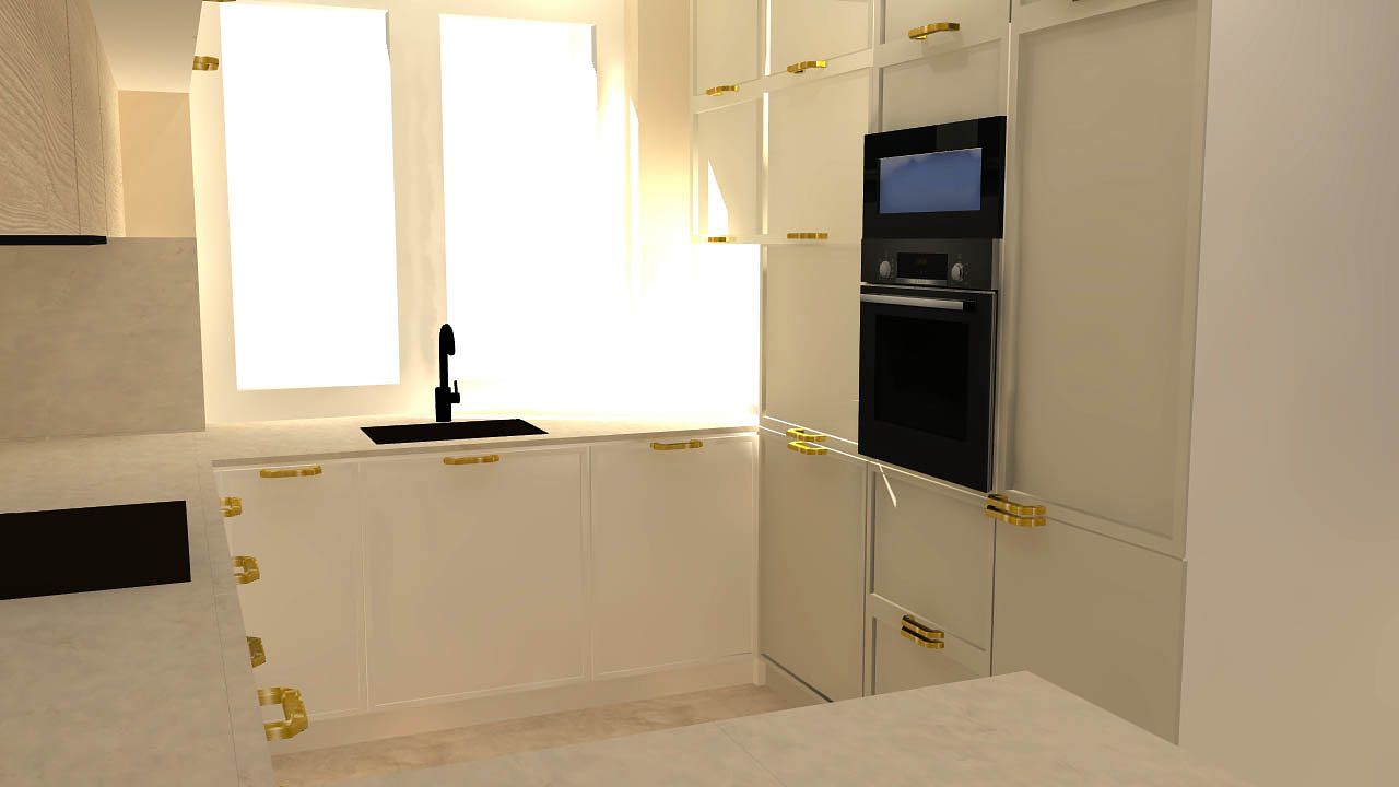 Kuchnia zaprojektowana tak aby maksymalnie wykorzystać jej przestrzeń , duża płaszczyzna blatów roboczych a jednocześnie zabudowy meblowej. Umożliwia swobodne korzystanie i funkcjonalność kuchni na codzień jak i zawiera dużą część zabudowy do przechowywania. Kolorystyka została wybrana tak aby wnętrze nie przytłaczało użytkownika. To lekkie kremowe kolory całej zabudowy i jasnego drewna jako dodatek stukturalny aby przełamać spójność kolorystyki i jednocześnie podkreślić lekkość wnętrza, dodać ciepłego charaketru.