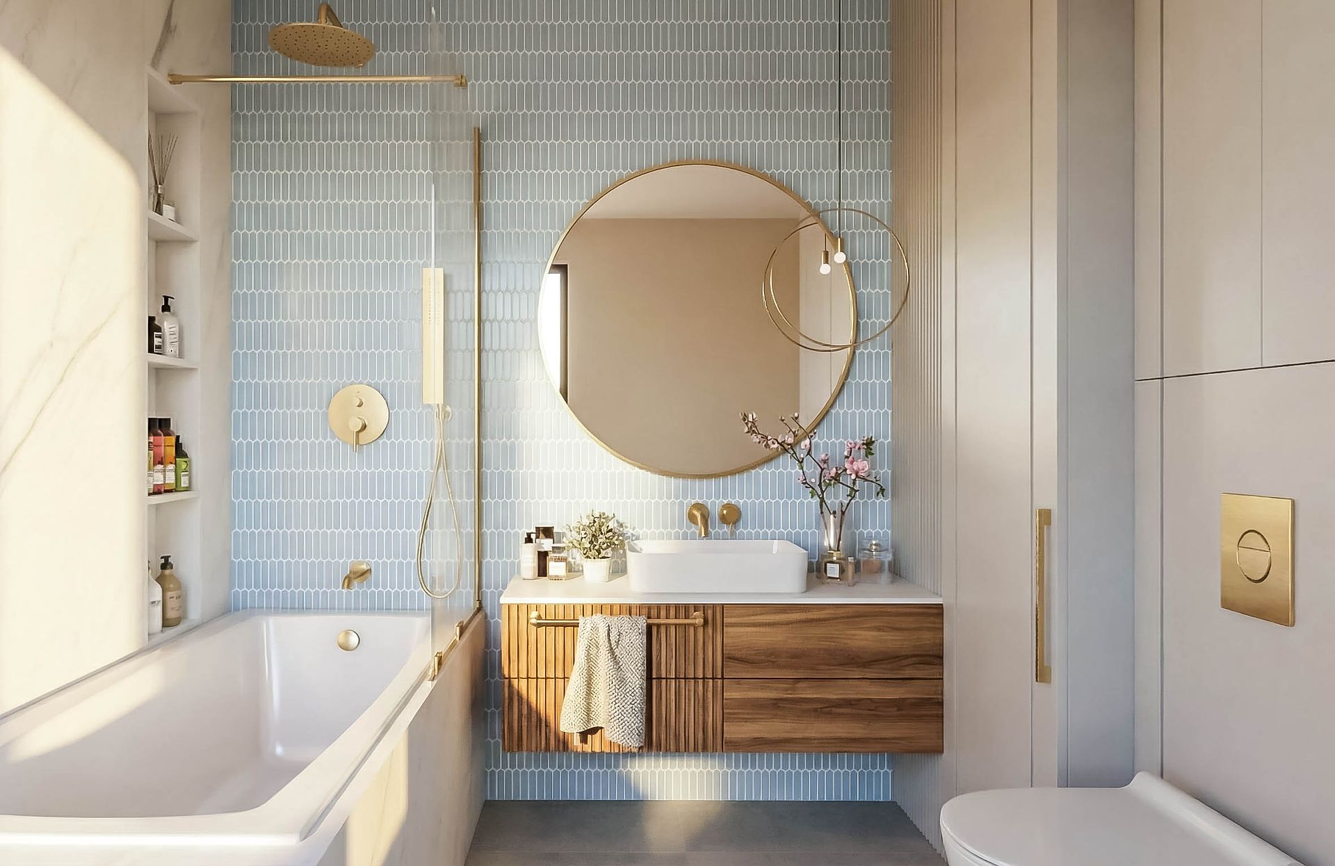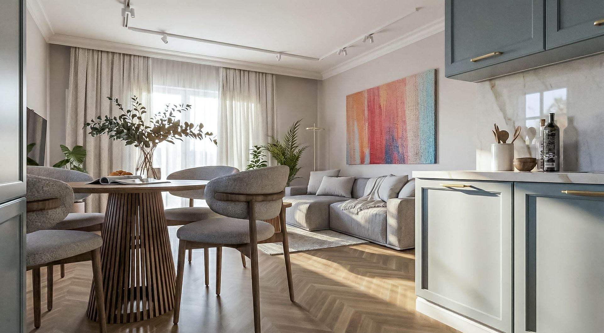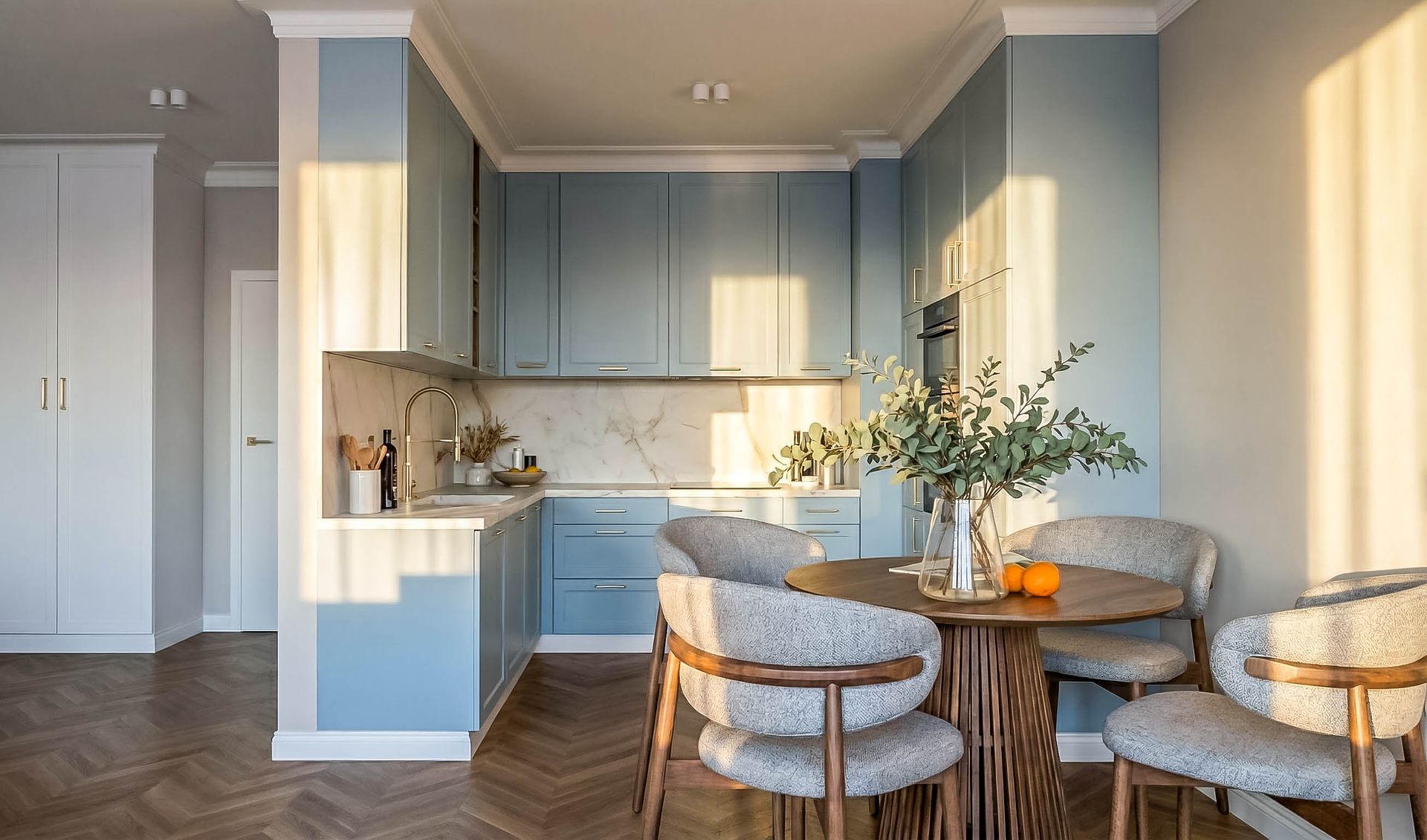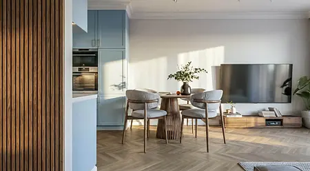 Apartament z widokiem na park krajobrazowy w Gdańsku. Projekt oparty na symetrii, konsekwencji linii i spokojnej, naturalnej palecie. Orzechowa podłoga, jasny kamień i subtelny błękit budują elegancką, uporządkowaną przestrzeń z wyważonym charakterem.