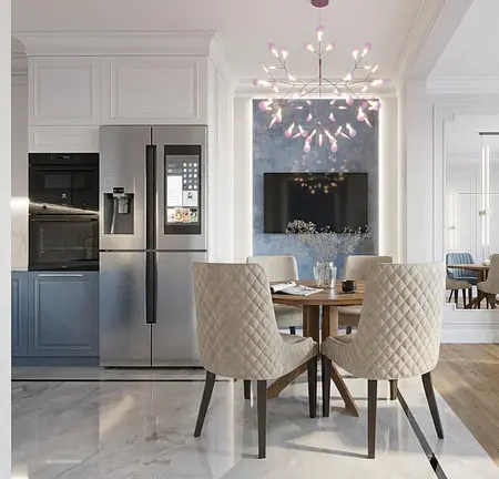 Współczesna kuchnia z niebieskimi meblami i drewnianym stołem 5 zdjęć w projekcie Zobacz projekt