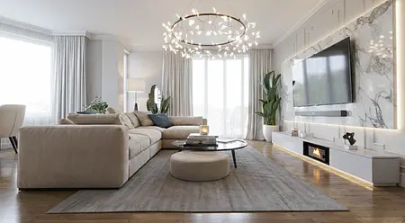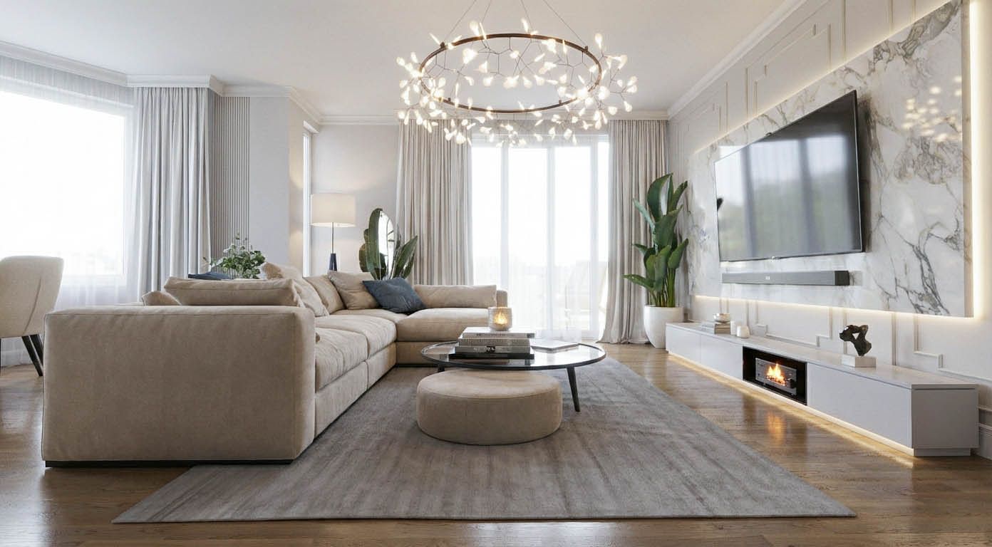 Wnętrze salonu z jasnym narożnikiem, okrągłym stołem i dużymi oknami, styl quiet luxury 11 zdjęć w projekcie Zobacz projekt
