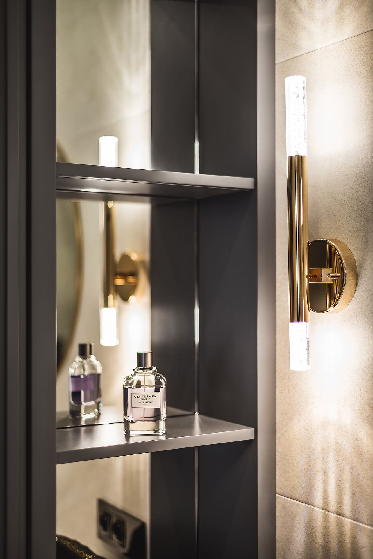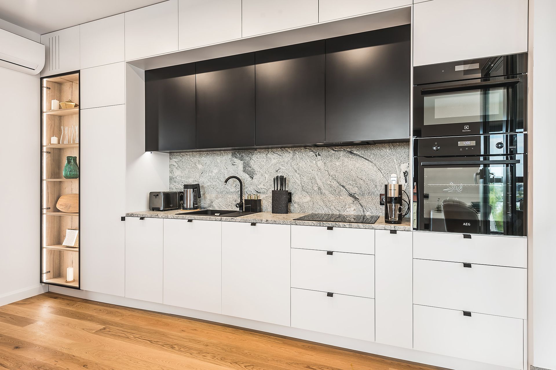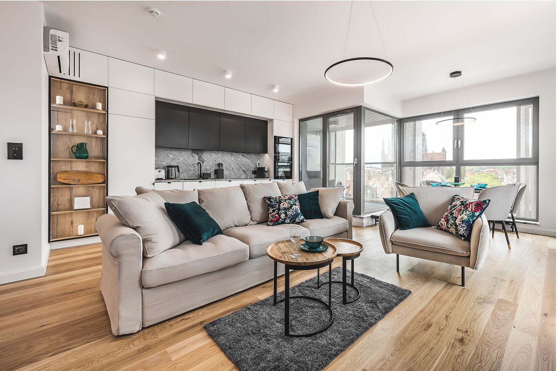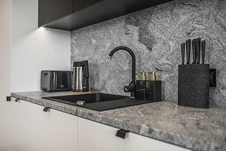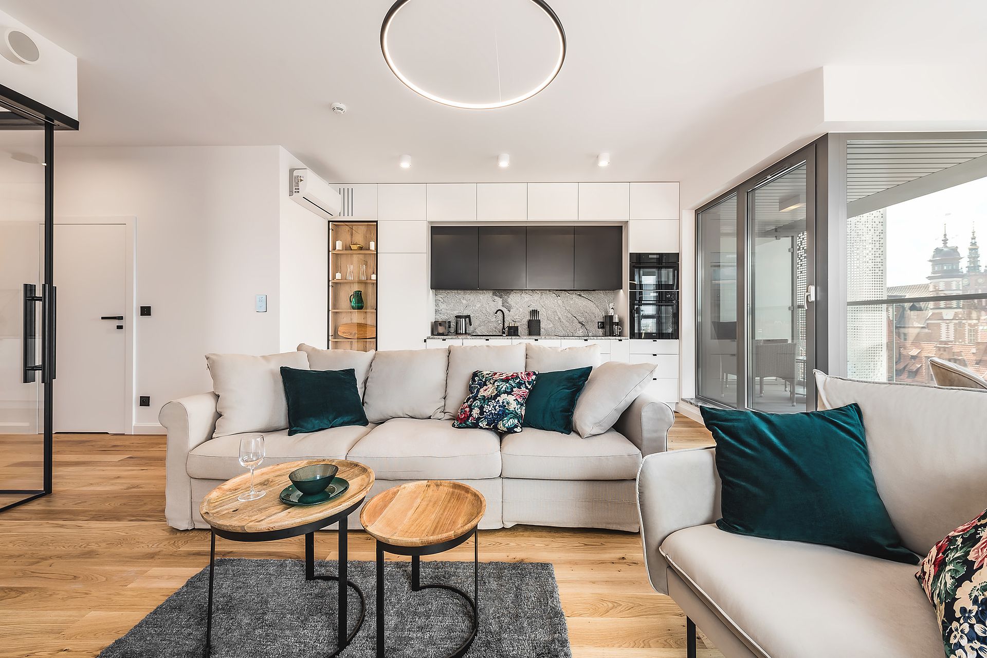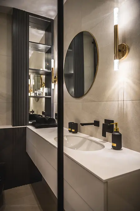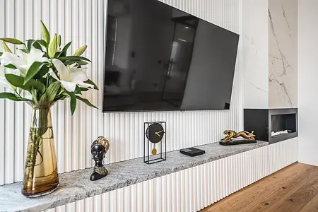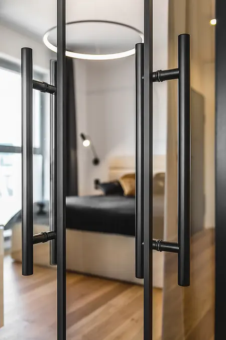 Apartament w inwestycji Granaria w centrum Gdańska. Projekt oparty na eleganckiej, stonowanej palecie oraz naturalnych materiałach. Drewno, kamień i dopracowane detale tworzą uporządkowaną, ponadczasową przestrzeń z wyraźnym, miejskim charakterem.