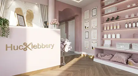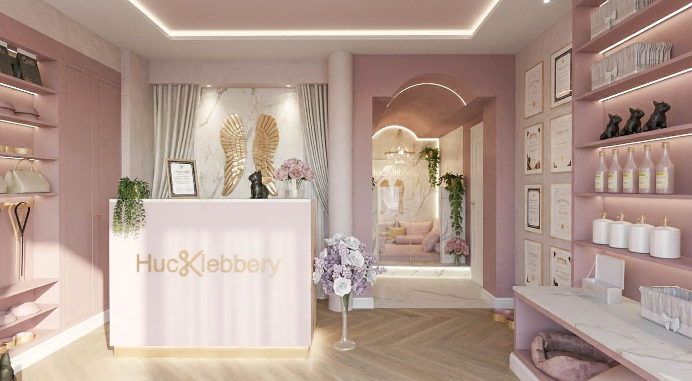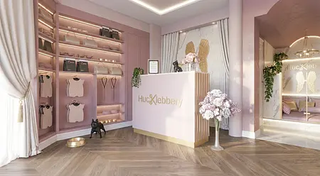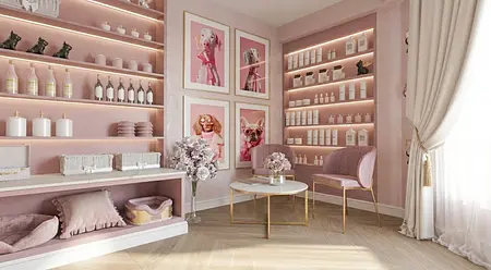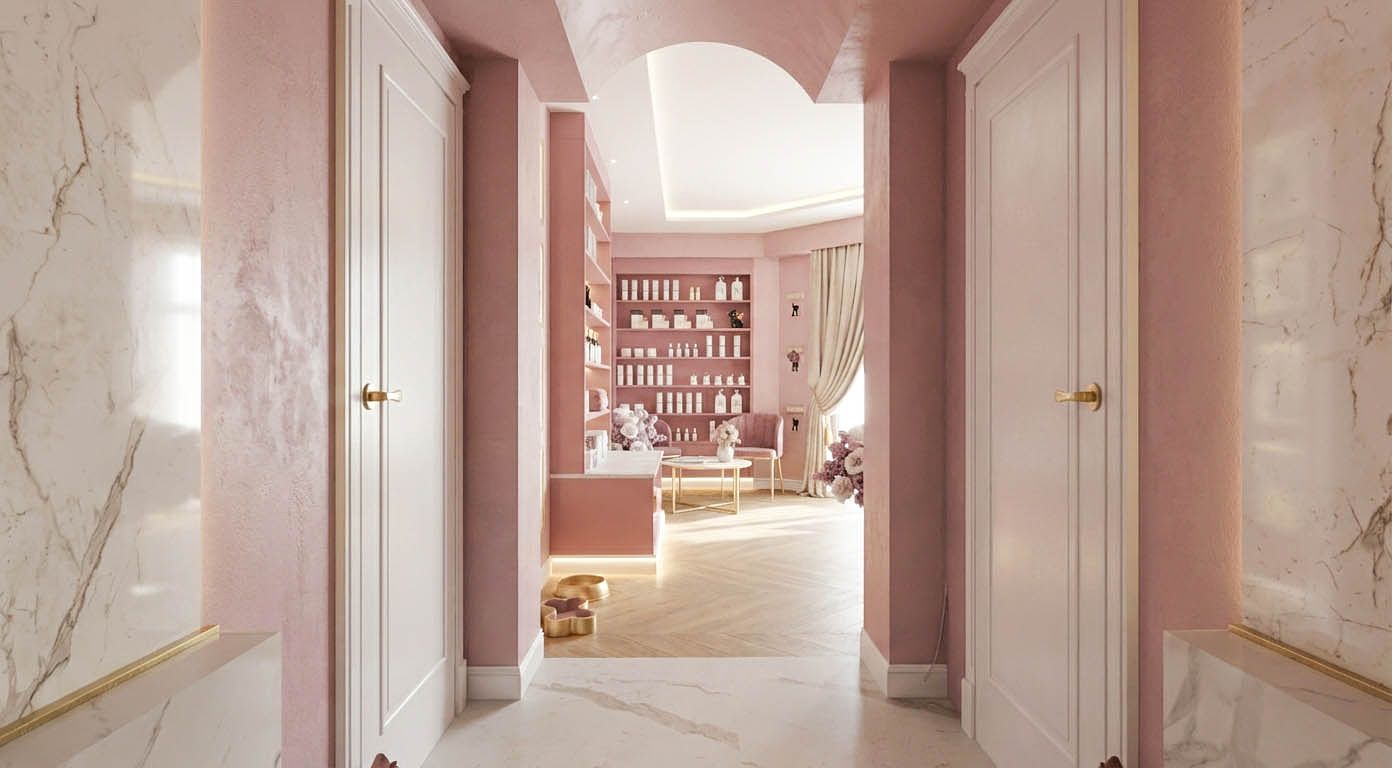 Projekt salonu groomerskiego w Gdańsku Osowej. Wnętrze wyraziste, eleganckie i świadomie różowe. Pudrowy róż, złote detale i miękkie formy budują rozpoznawalny wizerunek marki, łącząc estetykę z funkcjonalnym układem pracy.