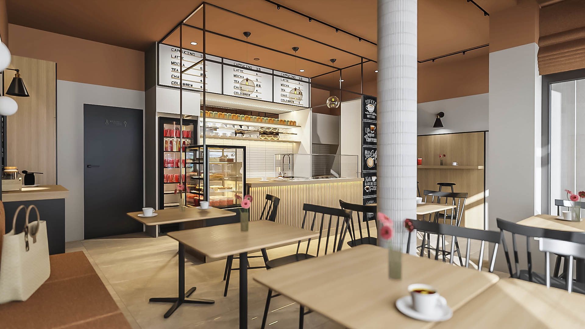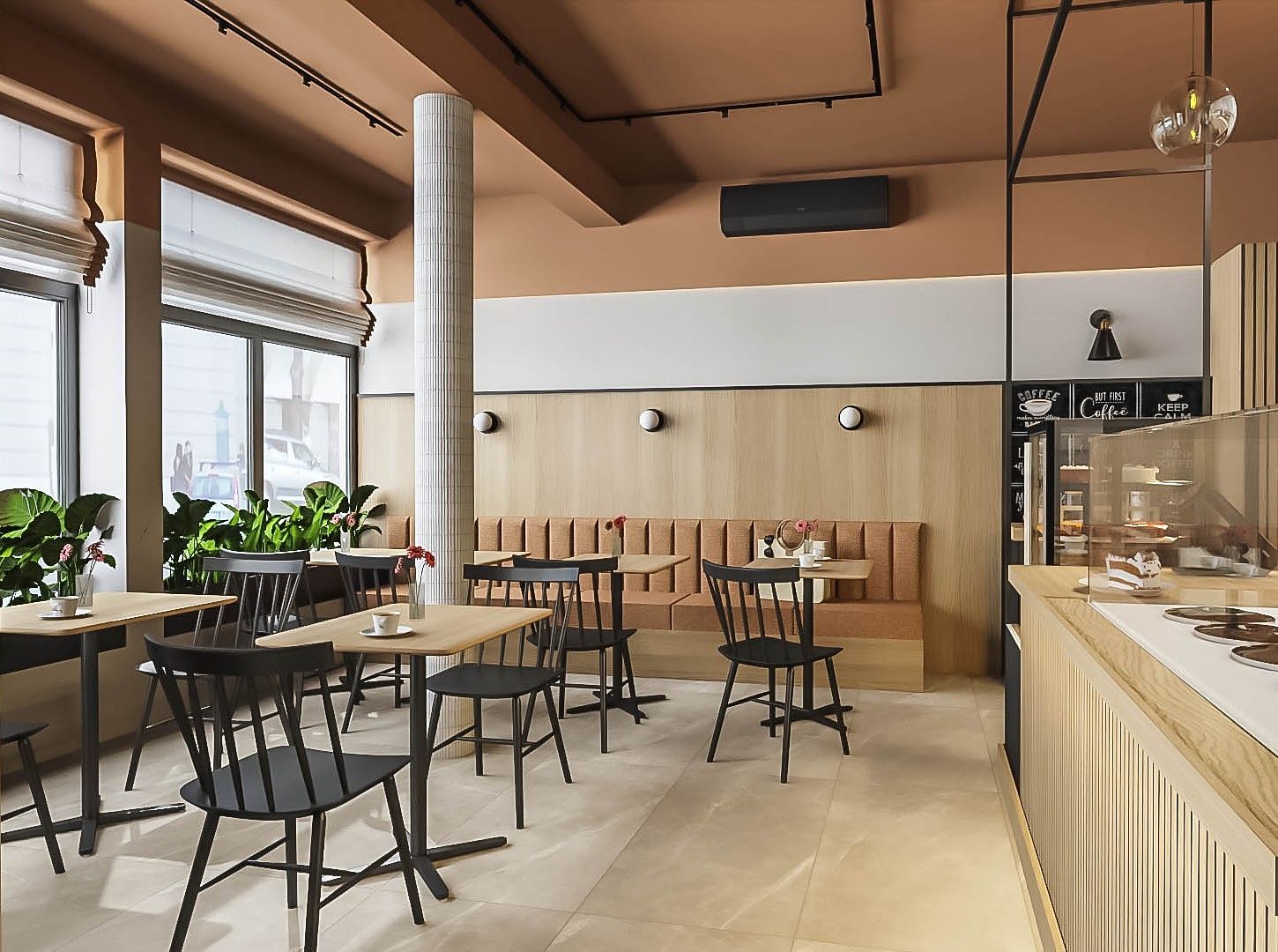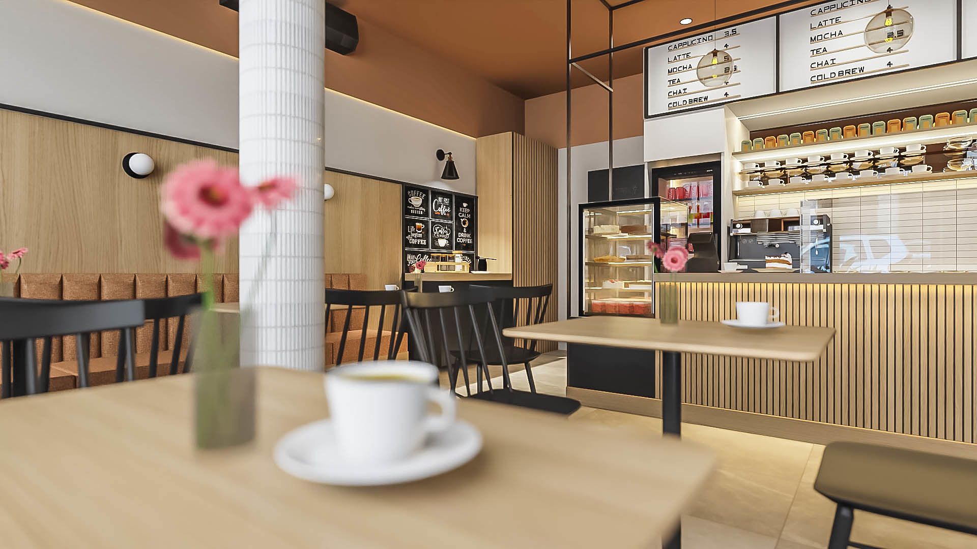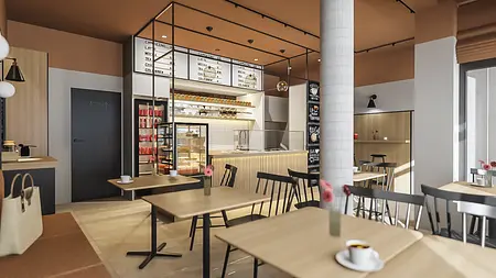 Projekt kawiarni nad morzem oparty na jasnej, naturalnej palecie i swobodnym, wakacyjnym charakterze. Drewno, miękkie światło i stonowane kolory budują przestrzeń sprzyjającą spotkaniom i odpoczynkowi, z zachowaniem funkcjonalnego układu dla sprawnej obsługi gości.