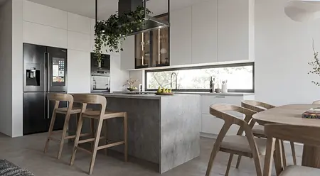 Współczesna kuchnia z niebieskimi meblami i drewnianym stołem 5 zdjęć w projekcie Zobacz projekt