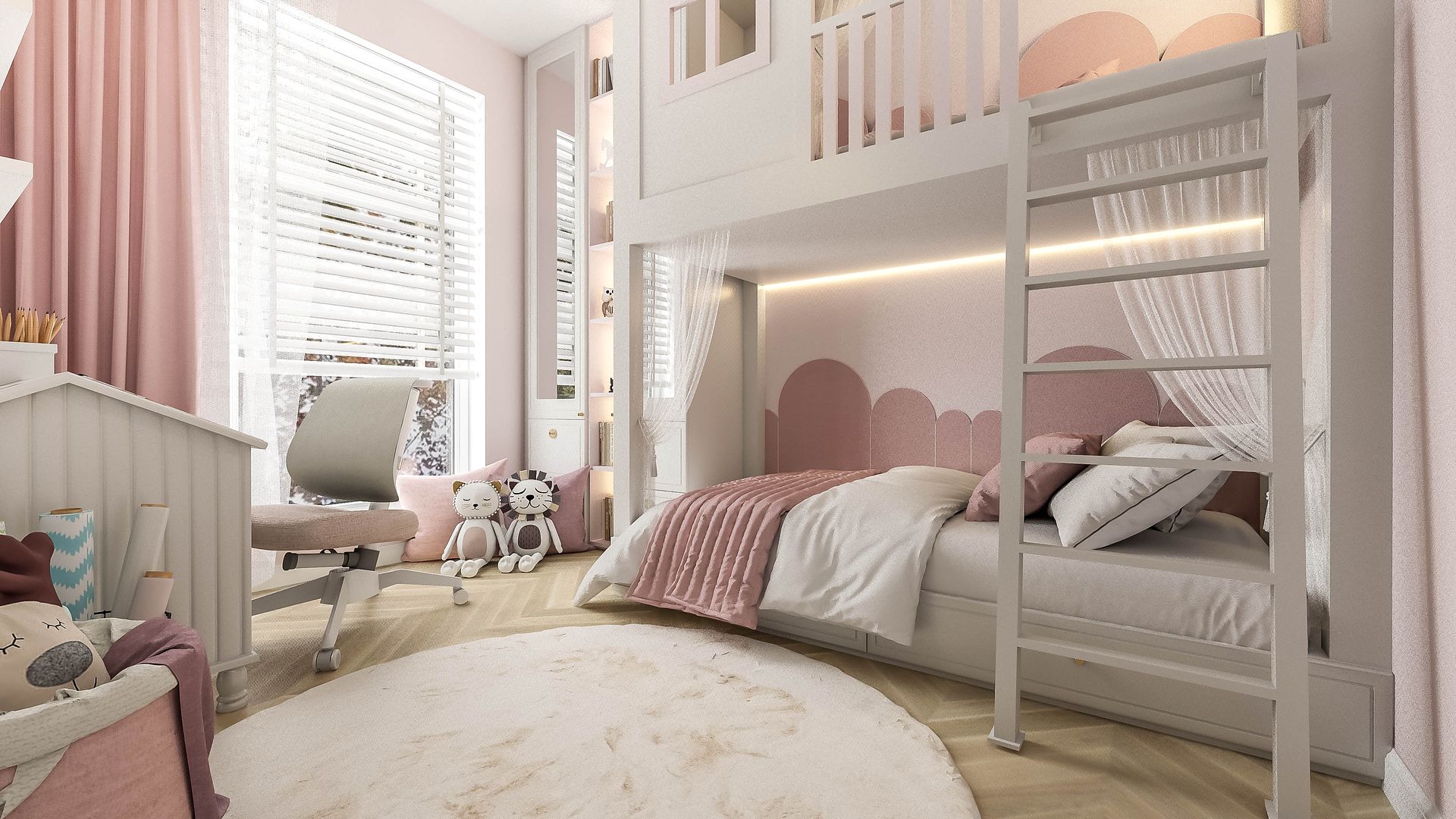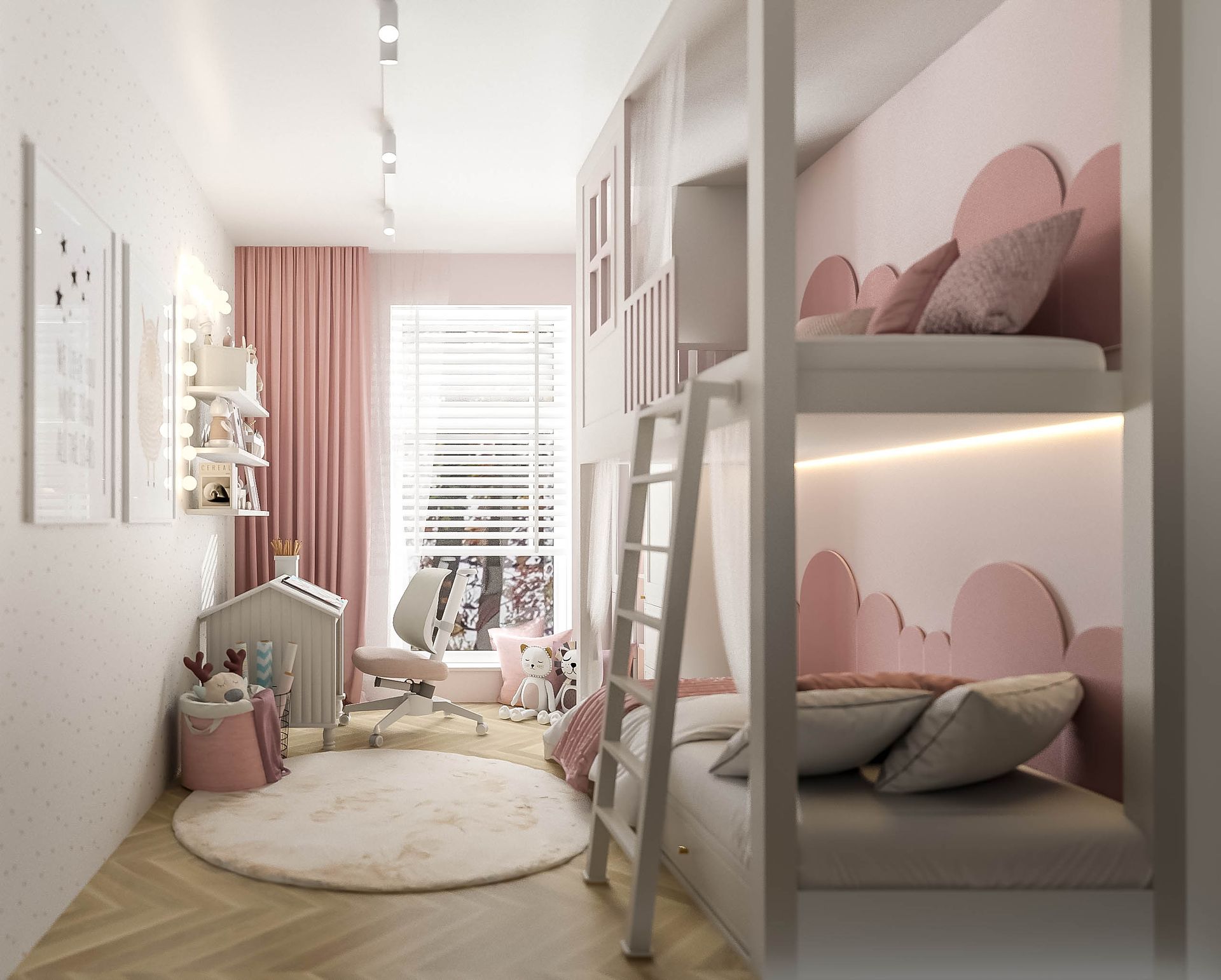 Projekt niewielkiego pokoju dziewczynki oparty na jednej, spójnej zabudowie na wymiar. Łóżko w formie domku stało się centrum aranżacji, łącząc funkcję spania, przechowywania i przytulnej wnęki. Wnętrze lekkie, uporządkowane i zaprojektowane tak, aby maksymalnie wykorzystać każdy centymetr przestrzeni.